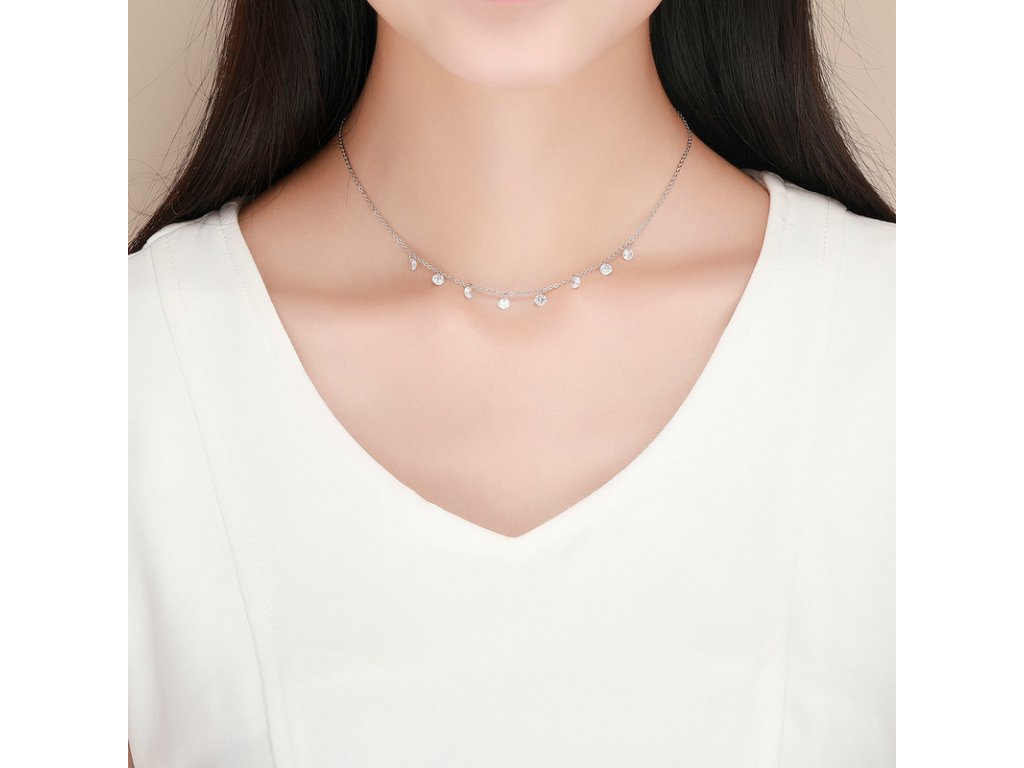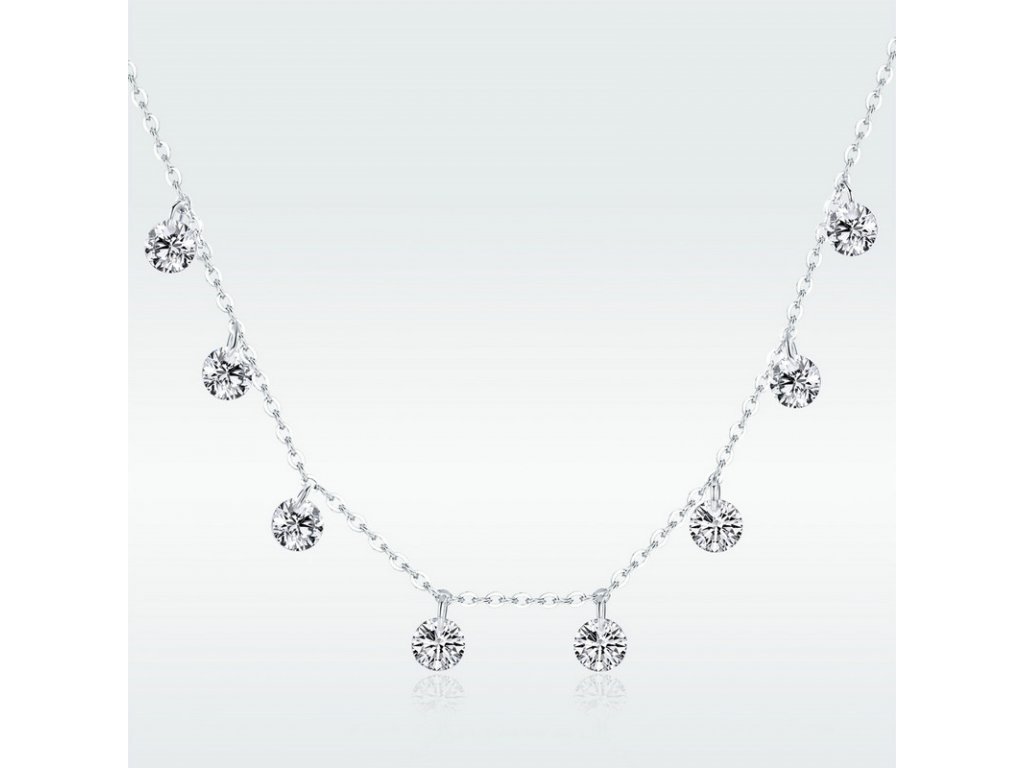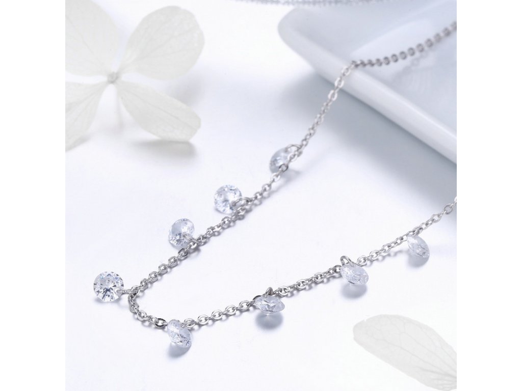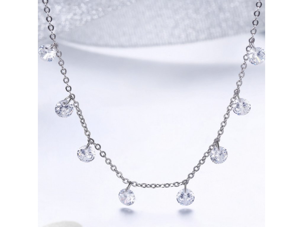 Luxusní a elegantní stříbrný náhrdelník zdobený visacími přívěsky třpytících se kamenů v podobě čirých zirkonů. Originální design náhrdelníku, kvalitní zpracování a materiál, ručně dohotovené.