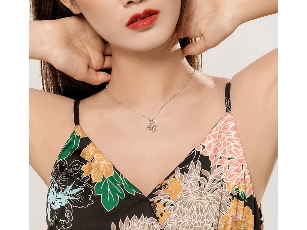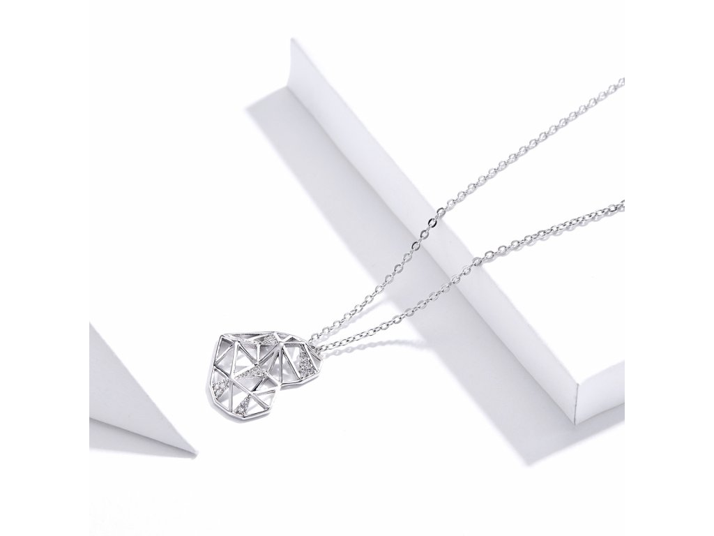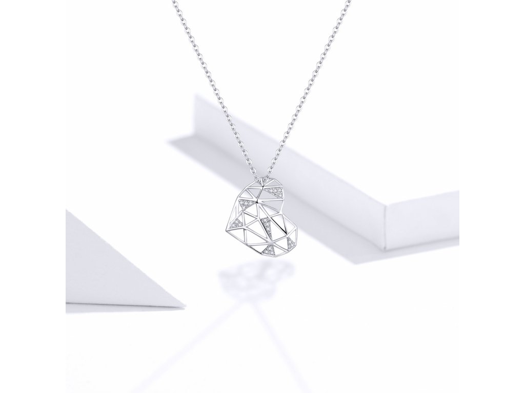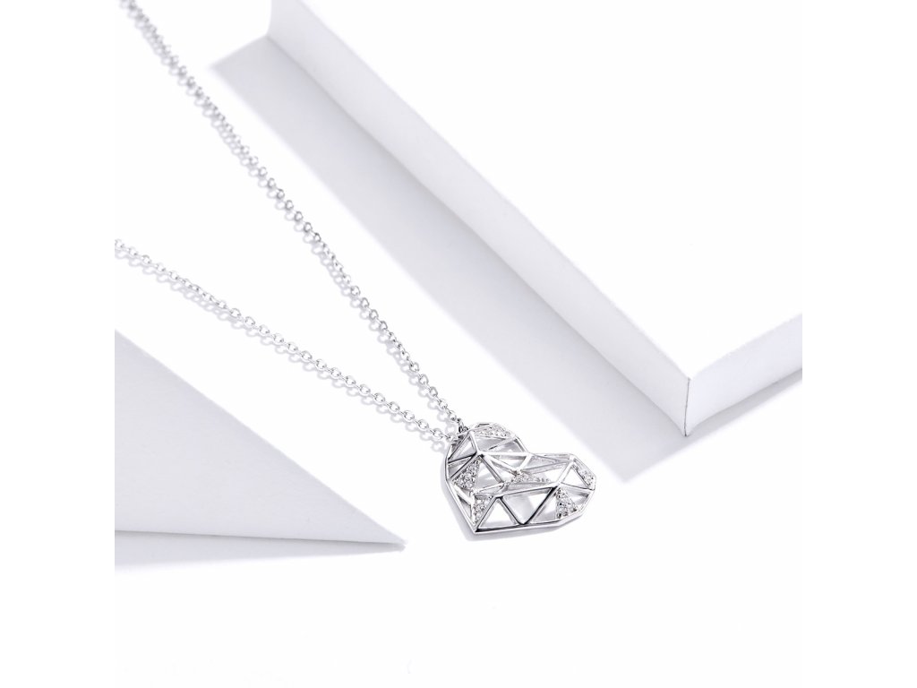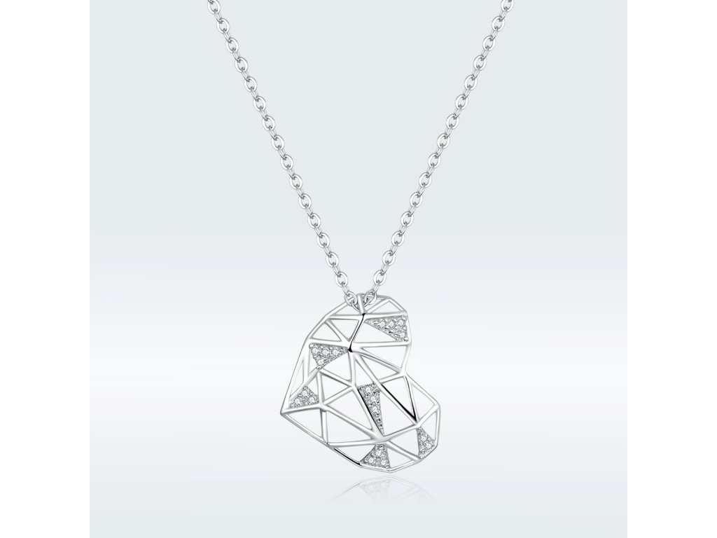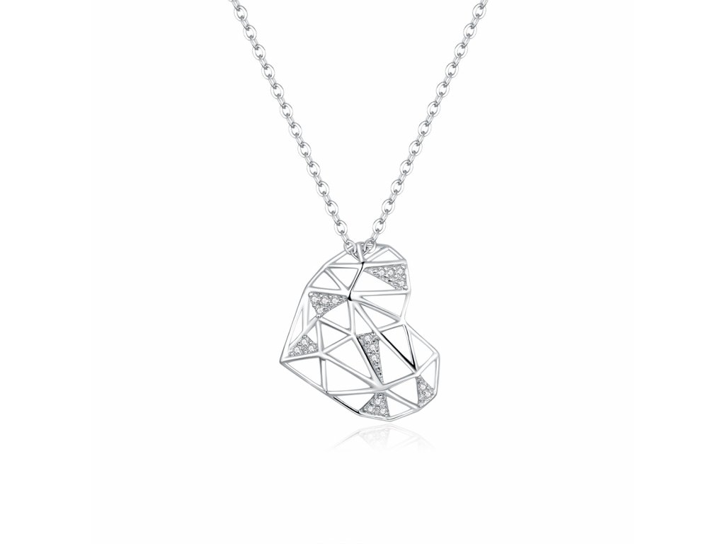 - Stříbrný náhrdelník v designu Geometrického srdce zdobeného čirými třpytivými zirkony. Originální design náhrdelníku, kvalitní zpracování a materiál, ručně dohotovené.
