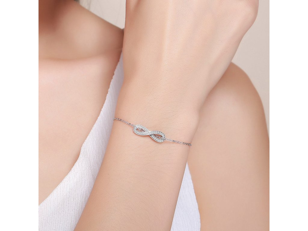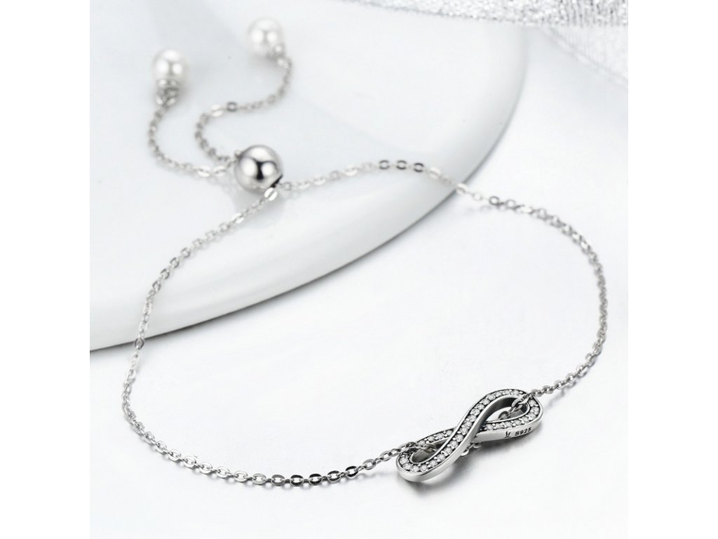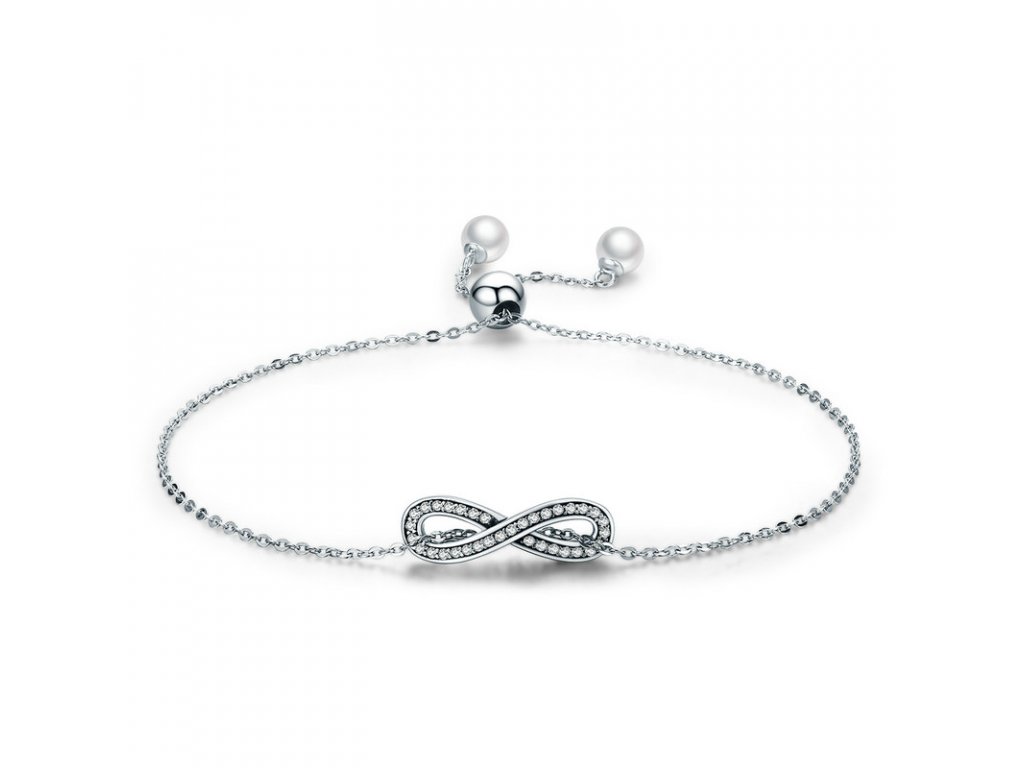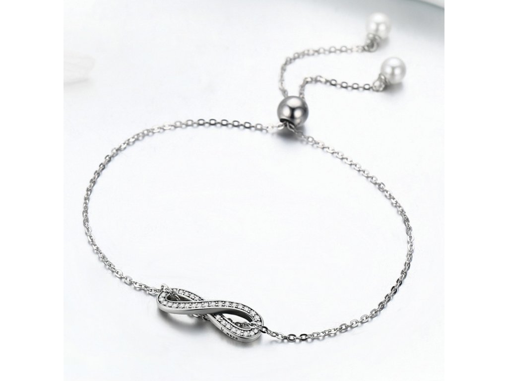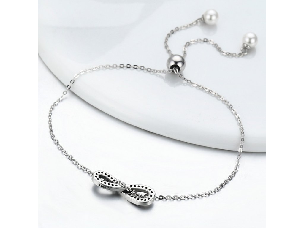 Luxusní a propracovaný jemný náramek nastavitelné velikosti z kvalitního stříbra zdobený perlami a třpytivými zirkony.