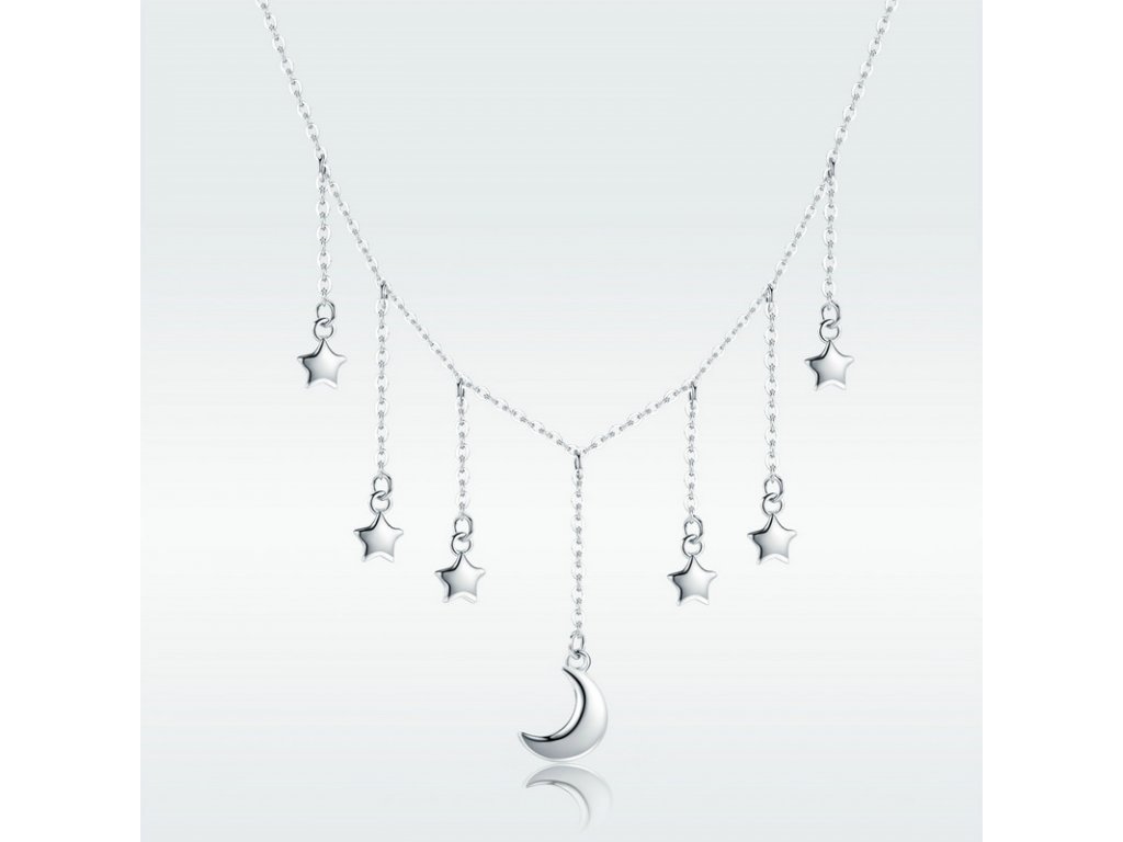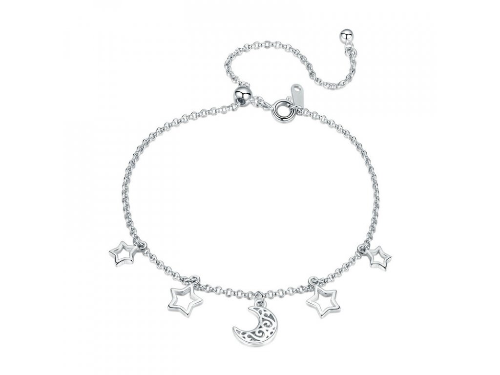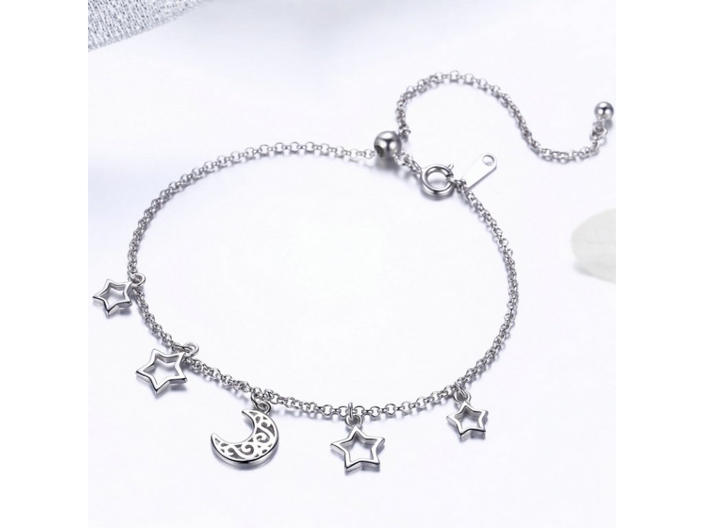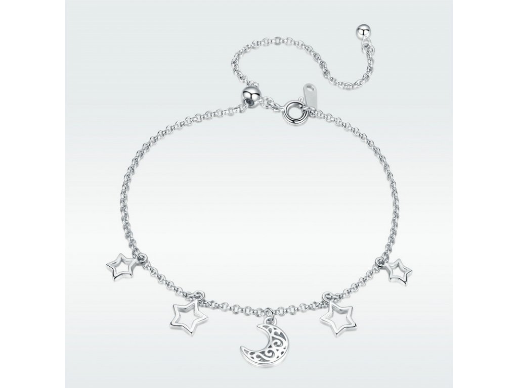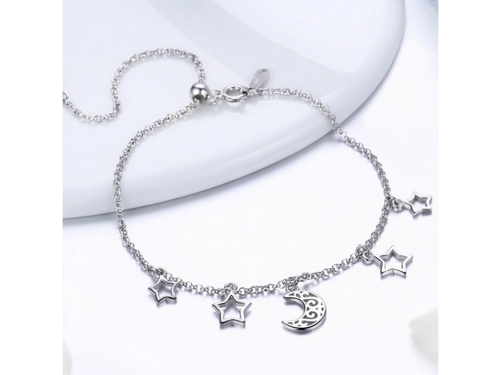 Jemný stříbrný náramek v designu padajících hvězd doplněný přívěsky / korálky hvězd a měsíce. Originální design náramku, kvalitní zpracování a materiál, ručně dohotovené.