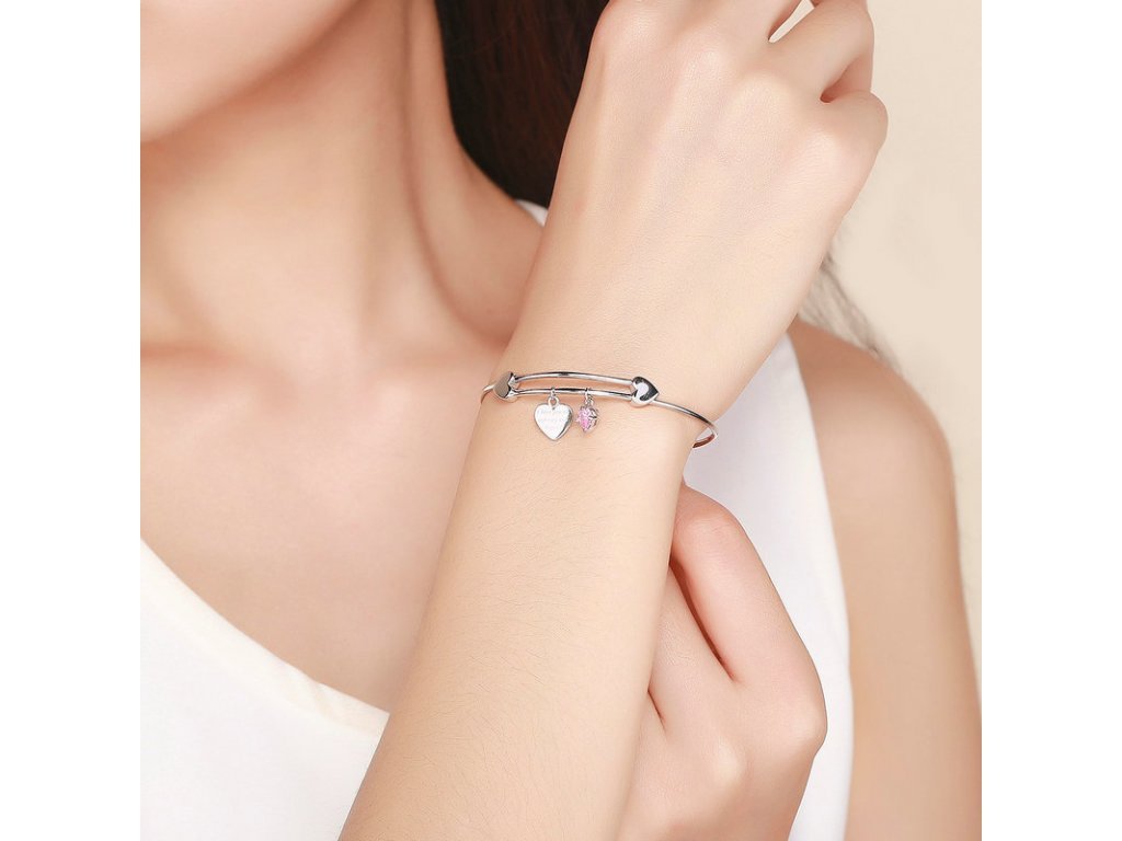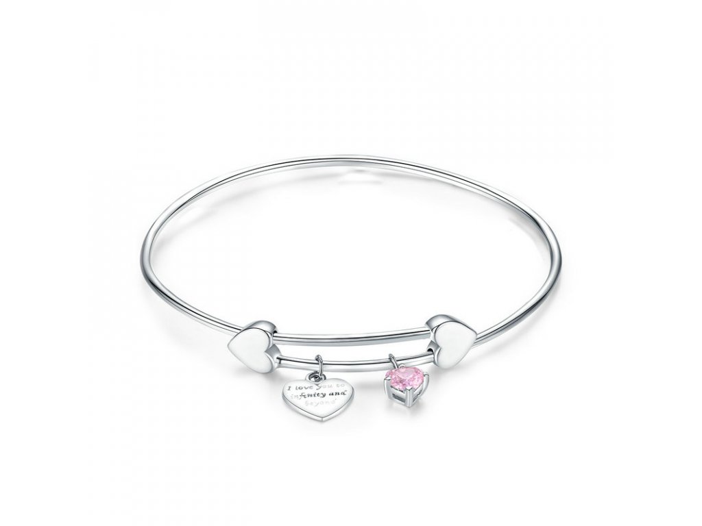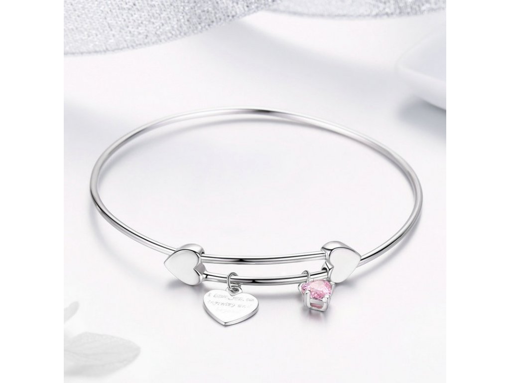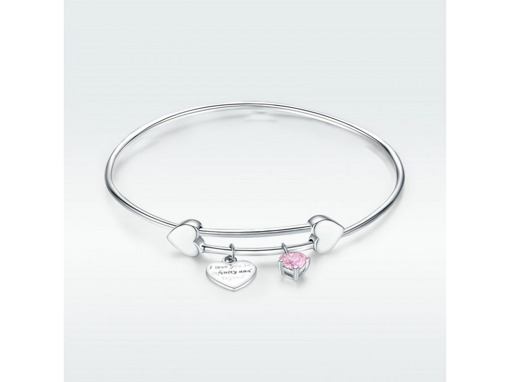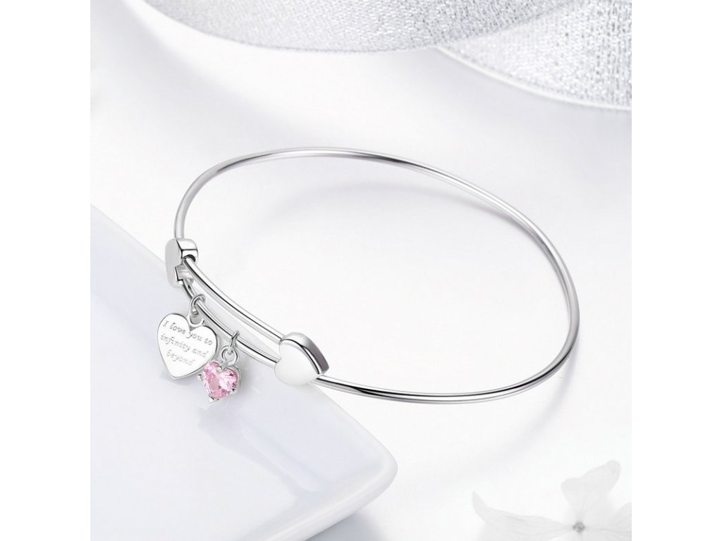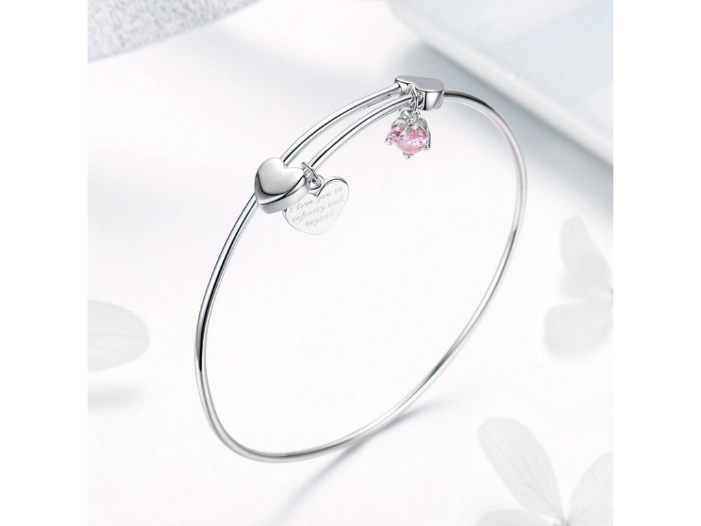 - Stříbrný pevný nastavitelný / univerzální náramek Sladká láska s přívěsky dvou srdcí. Jedno srdce je zdobeno anglickým textem "I love you to infinity and beyond" v překladu "Miluji tě do nekonečna a ještě dál". Druhé srdce je zdobeno světle růžovým kamenem v podobě blyštivého broušeného zirkonu. Náramek je ohebný a lze ho tak stlačit, či roztáhnout dle velikosti zápěstí. Originální design náramku, kvalitní zpracování a materiál, ručně dohotovené.