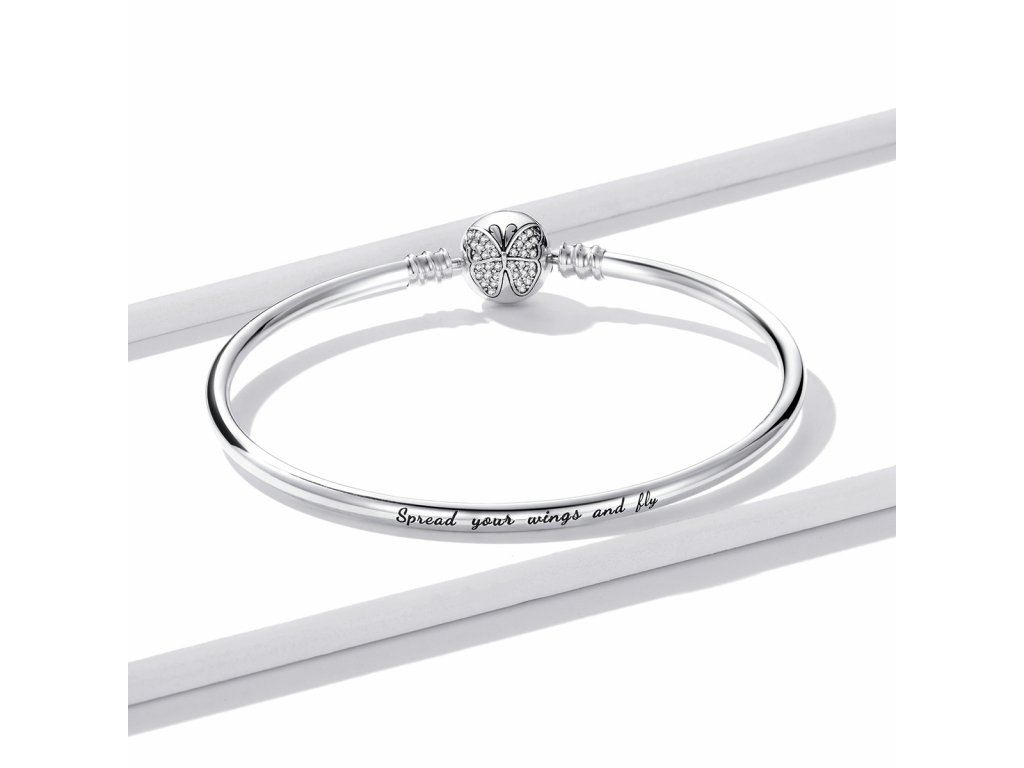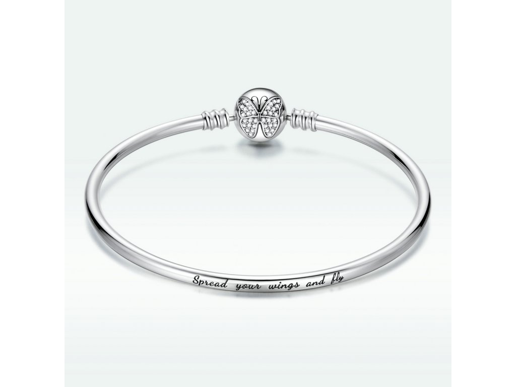 - Luxusní stříbrný pevný náramek na přívěsky. Náramek je skvělý na nošení i bez přívěsků, díky jeho lesku a kvalitního stříbra. Zapínání náramku ve tvaru kuličky je zdobeno třpytivým motýlkem. Náramek je také zdoben anglickým nápisem " Spread your wings and fly " v překladu " Roztáhni křídla a leť ". Originální design náramku, kvalitní zpracování a materiál, ručně dohotovené.