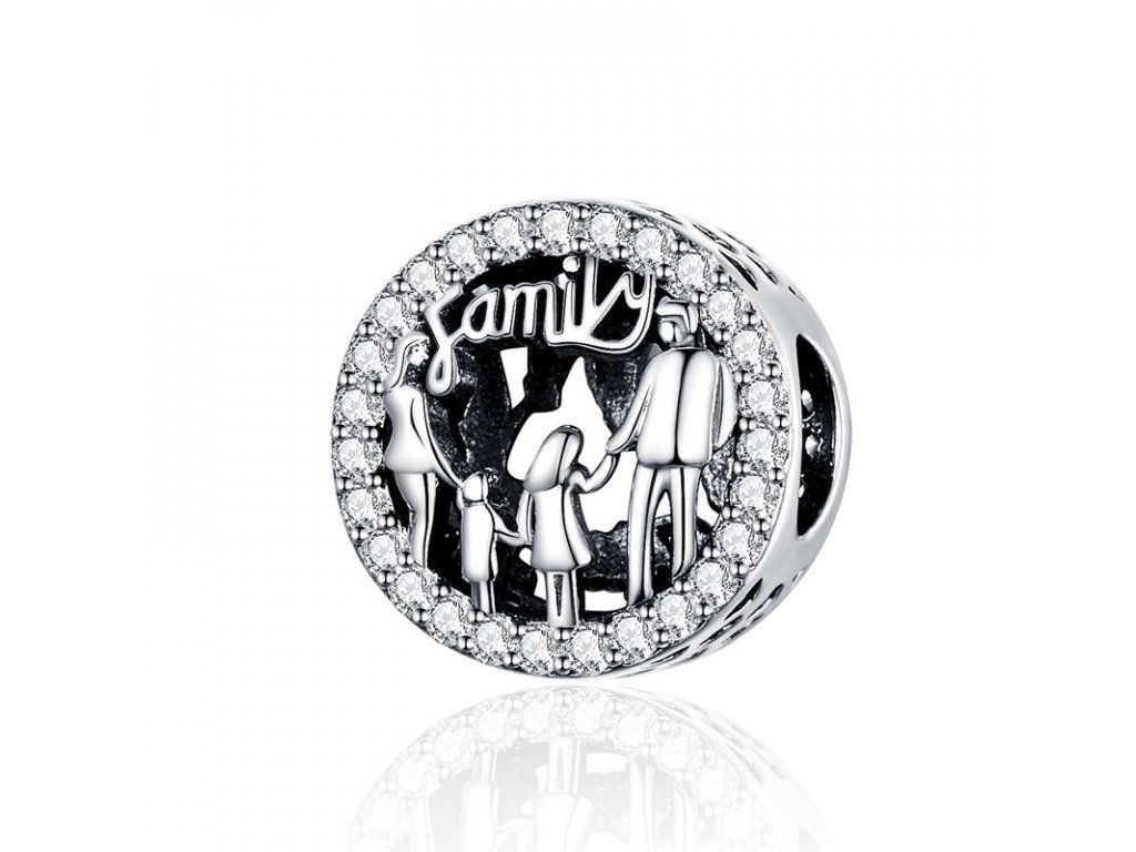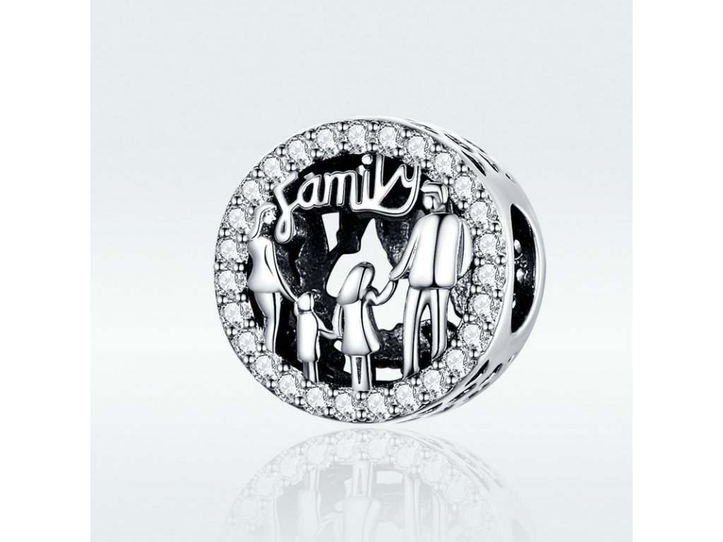 Stříbrný přívěsek v designu Šťastné rodinky zdobený čirými zirkony a anglickým nápisem "Family" v překladu "Rodina". Přívěsek je také zdoben ručně vyřezávanými srdíčky po stranách. Originální design přívěsku, kvalitní zpracování a materiál, ručně dohotovené.