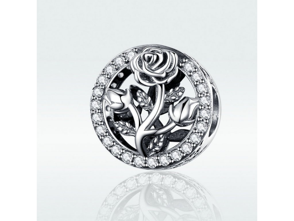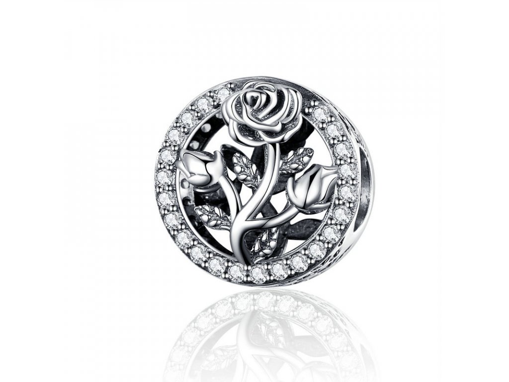 Stříbrný přívěsek v designu Romantické růže zdobený ručně posázenými čirými zirkony okolo, smaltem a ručně vyřezávanými srdíčky po stranách. Originální design přívěsku, kvalitní zpracování a materiál, ručně dohotovené.