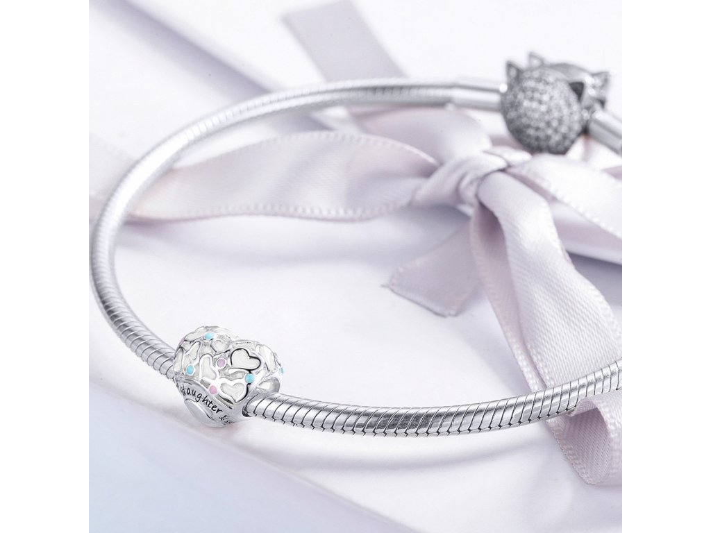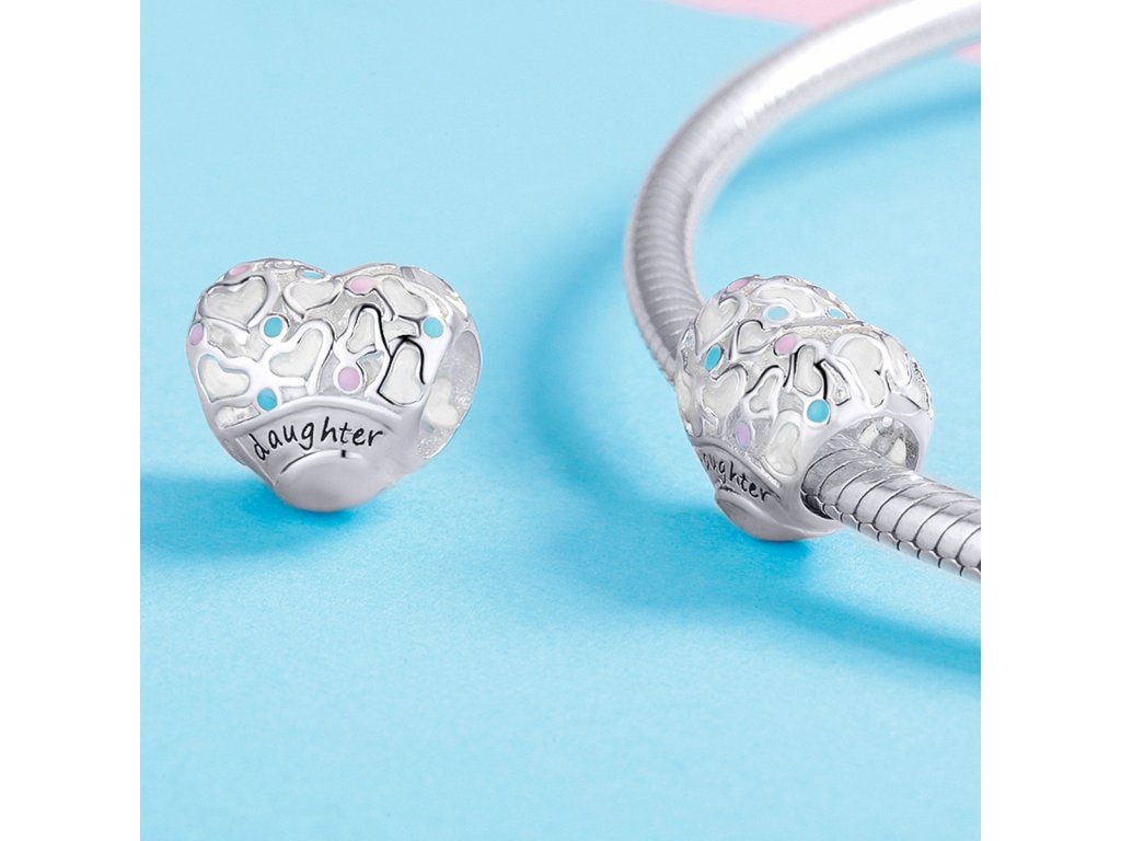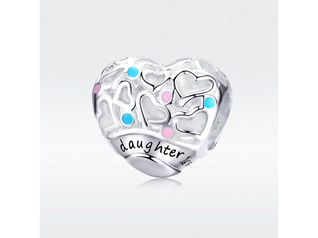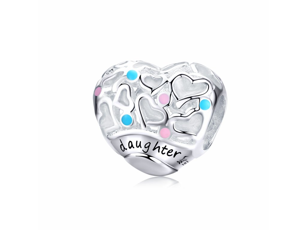 Stříbrný přívěsek v designu Milovaná dcera ve tvaru srdce zdobený modrými a růžovými puntíky tvořenými ručně nanášenou barevnou glazurou. Přívěsek je také zdoben ručně vyřezávanými mini srdíčky a anglickým nápisem "daughter" v překladu "dcera". Originální design přívěsku, kvalitní zpracování a materiál, ručně dohotovené. Stříbro ryzost Ag 925/1000, glazura. Povrchová úprava - platinováno. Vaši objednávku dodáme v DÁRKOVÉM BALENÍ - ZDARMA.
