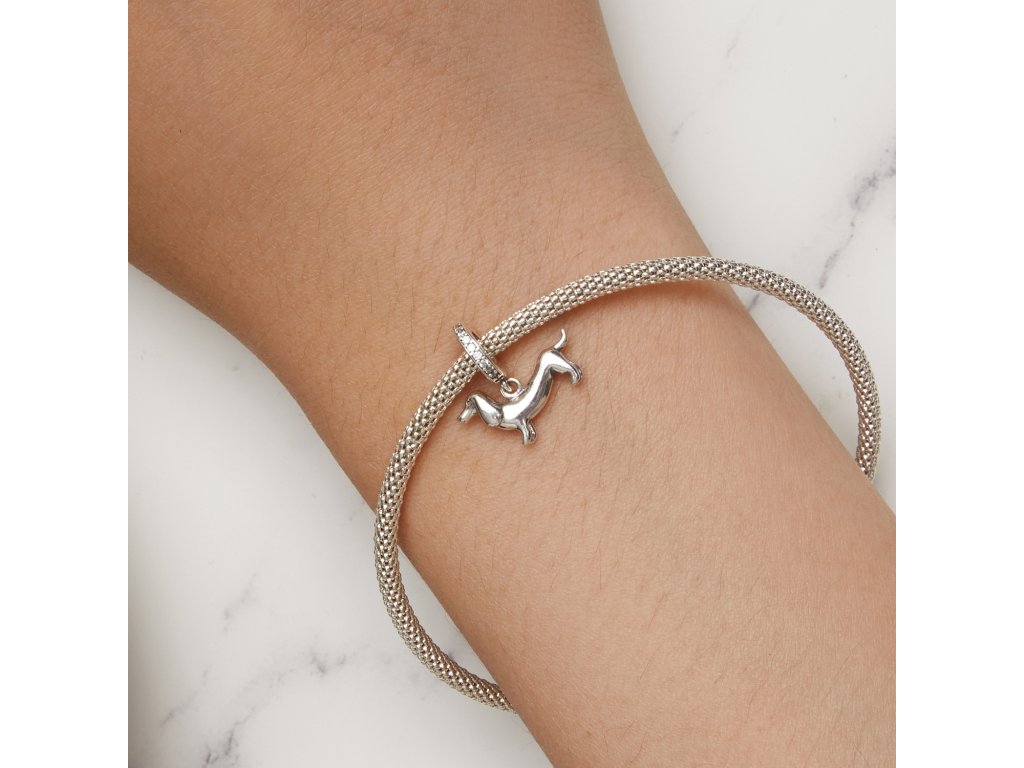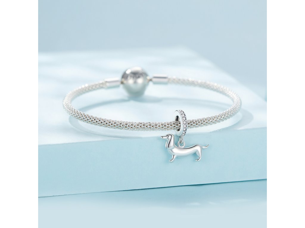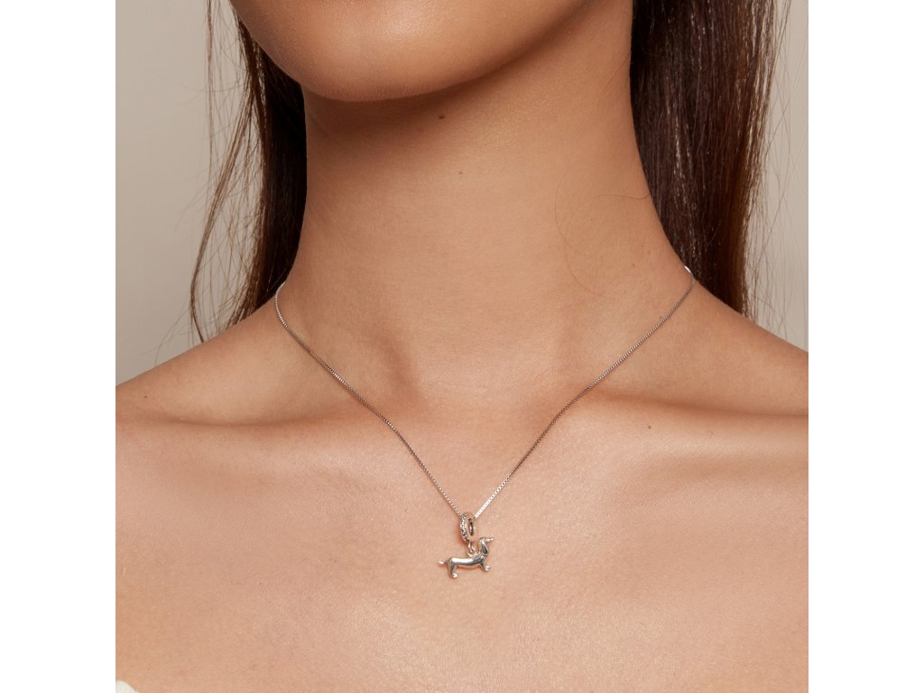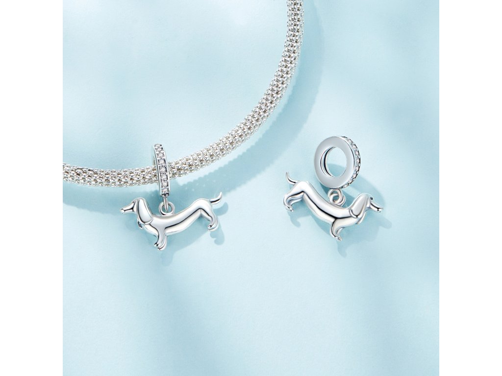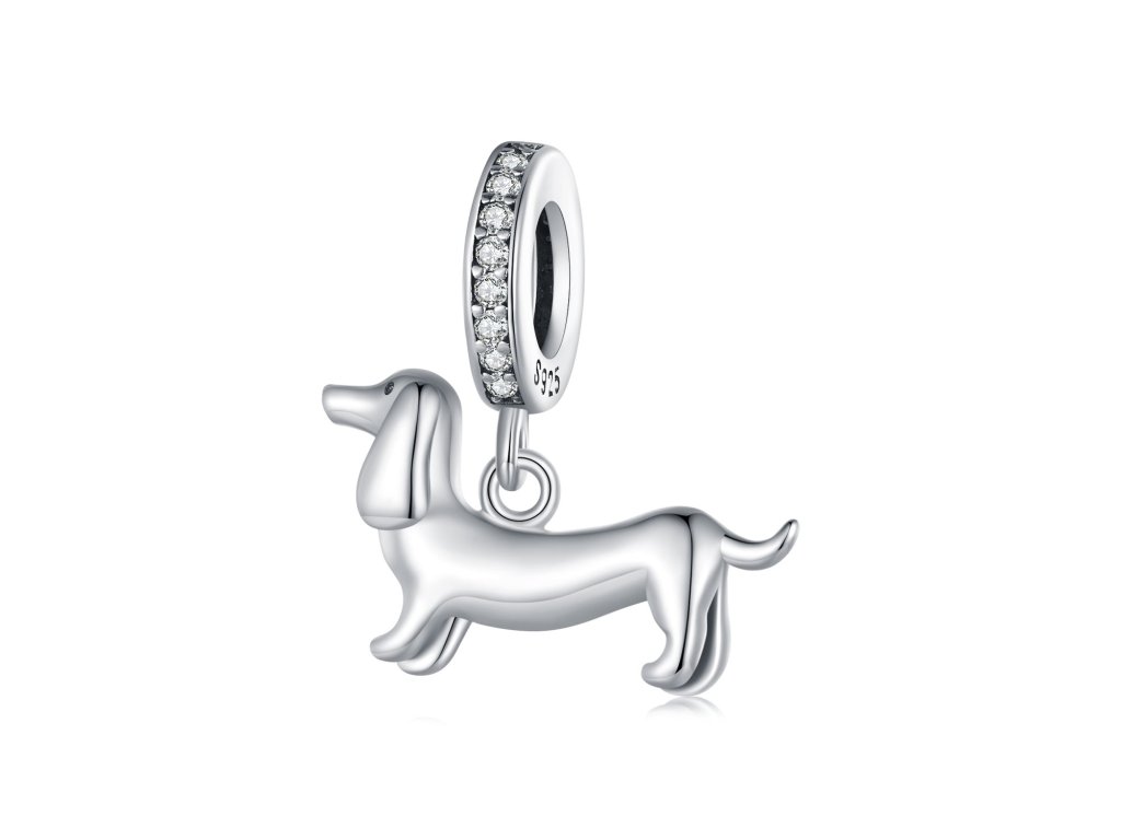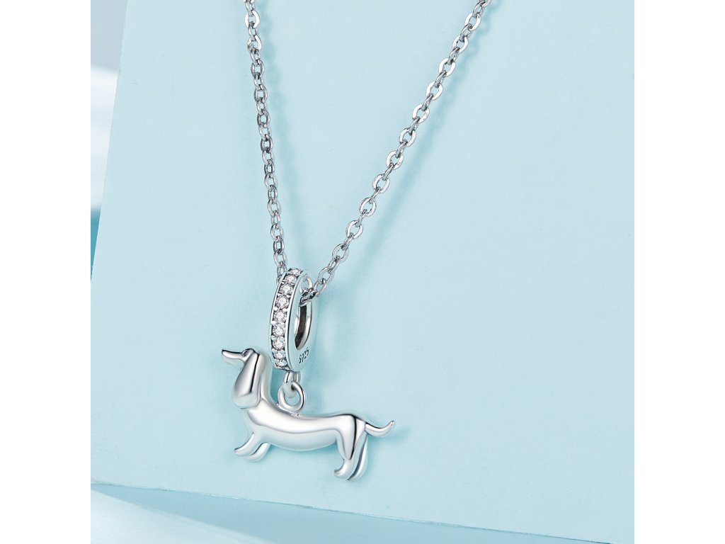 Stříbrný visací přívěsek v designu roztomilého pejska jezevčíka. Precizně zpracovaný z kvalitního sterlingového stříbra, s důrazem na detail je ideálním doplňkem pro milovníky psů i jedinečných šperků. - Stříbro ryzost Ag 925/1000, zirkony.