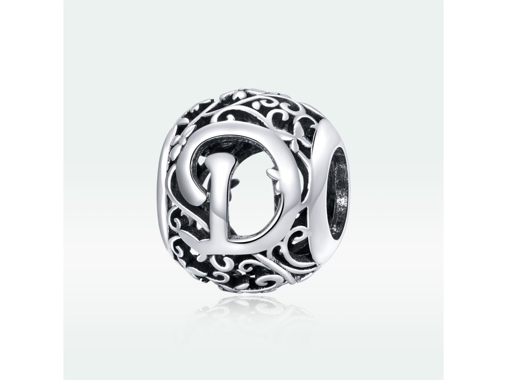 - Stříbrný filigránový přívěsek / korálek v designu písmenka D zdobený rozkvetlými květy a lístky.