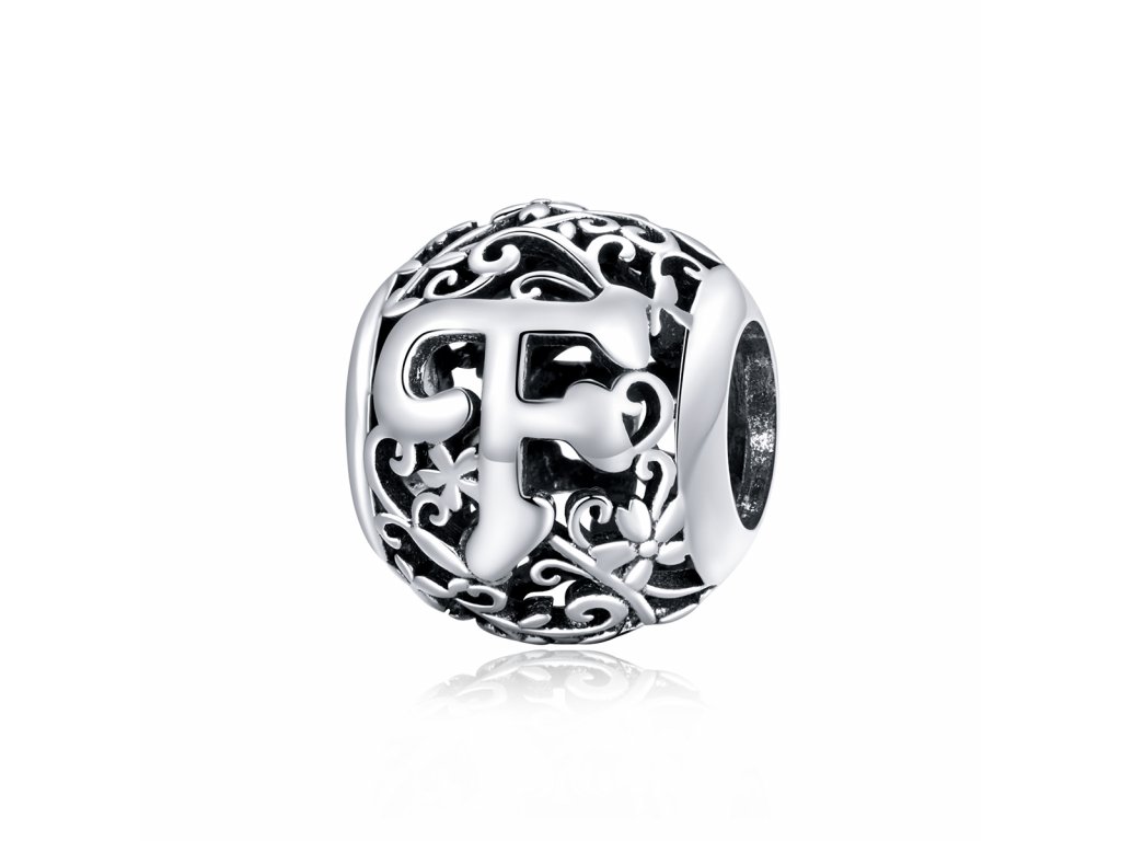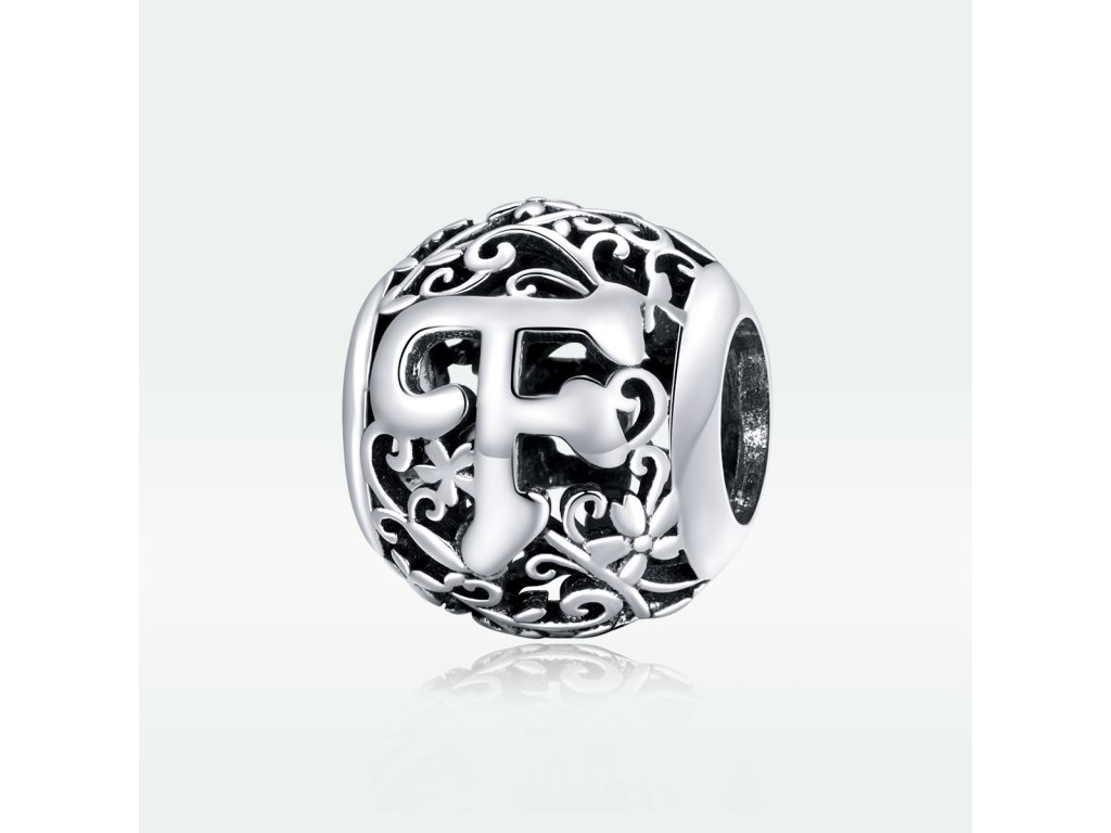 - Stříbrný filigránový přívěsek / korálek v designu písmenka F zdobený rozkvetlými květy a lístky.