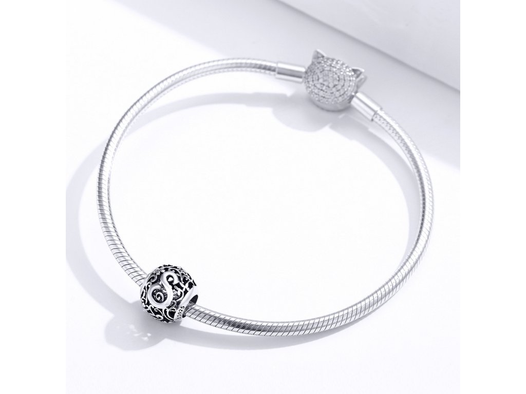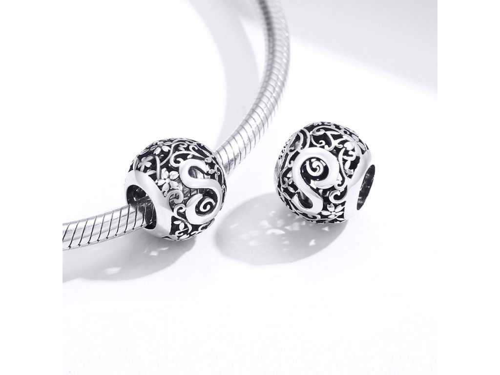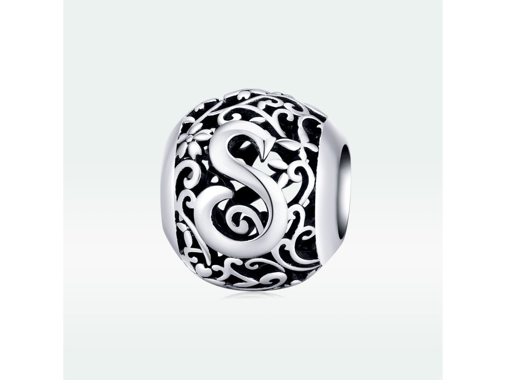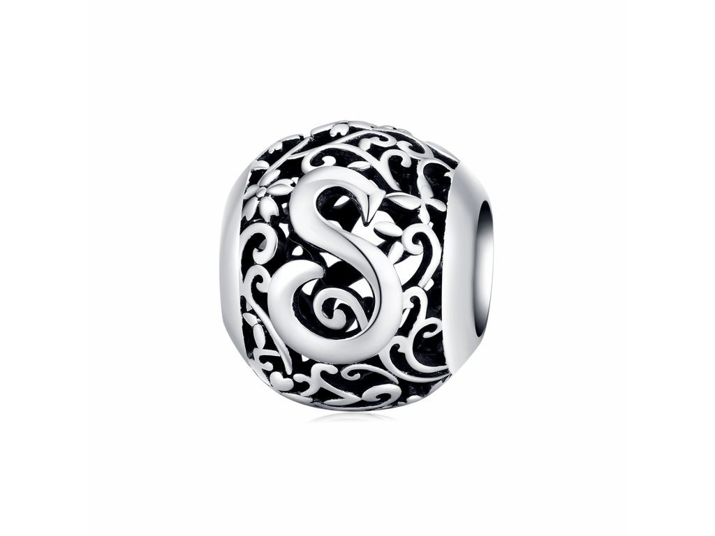 - Stříbrný filigránový přívěsek / korálek v designu písmenka S zdobený rozkvetlými květy a lístky.