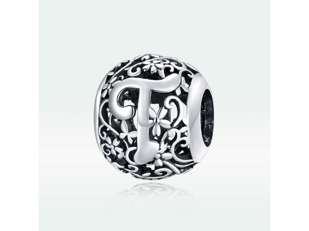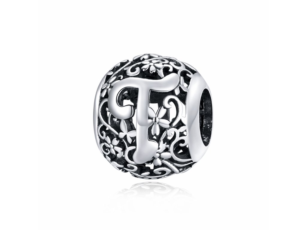 - Stříbrný filigránový přívěsek / korálek v designu písmenka T zdobený rozkvetlými květy a lístky.