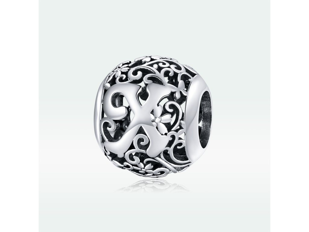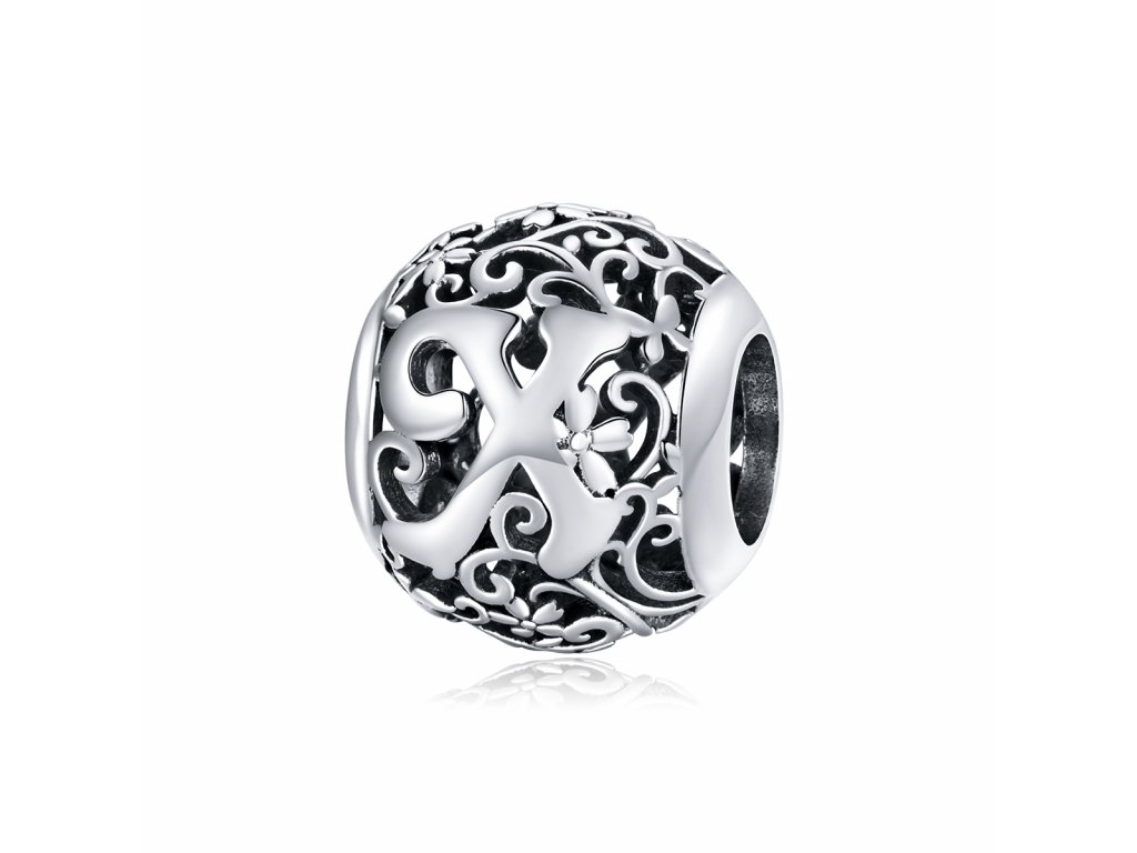 - Stříbrný filigránový přívěsek / korálek v designu písmenka X zdobený rozkvetlými květy a lístky.