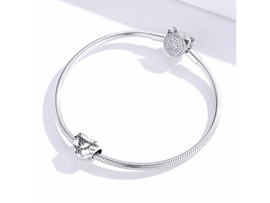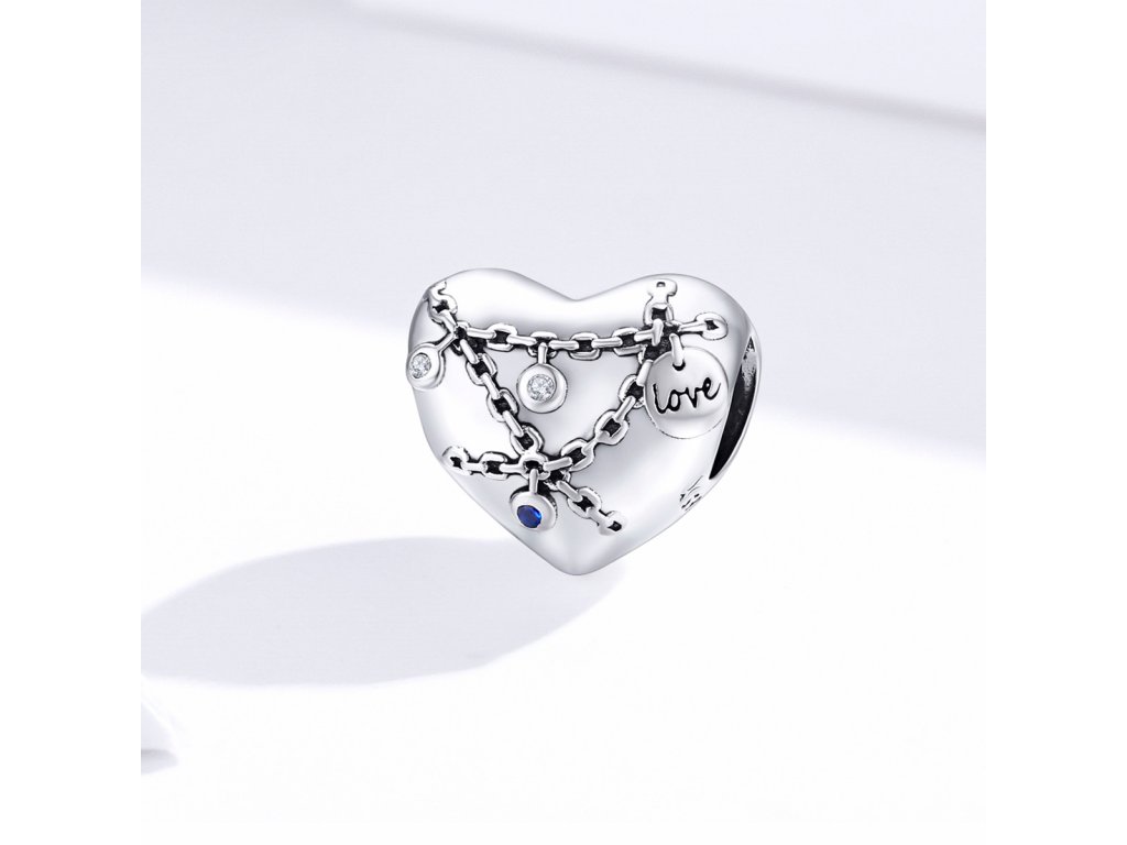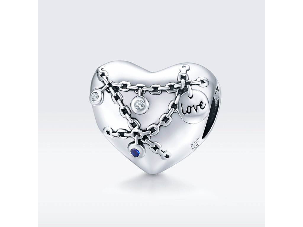 - Stříbrný přívěsek ve tvaru uzamčeného srdce s názvem Na tisíc západů v podobě řetízků se zámečky lásky zdobenými dvěma čirými a jedním tmavě modrým kamenem v podobě zirkonu. Tento zamilovaný přívěsek je také tvořen mini přívěskem se smaltovaným anglickým nápisem "love" v překladu "láska". Originální design přívěsku, kvalitní zpracování a materiál, ručně dohotovené.