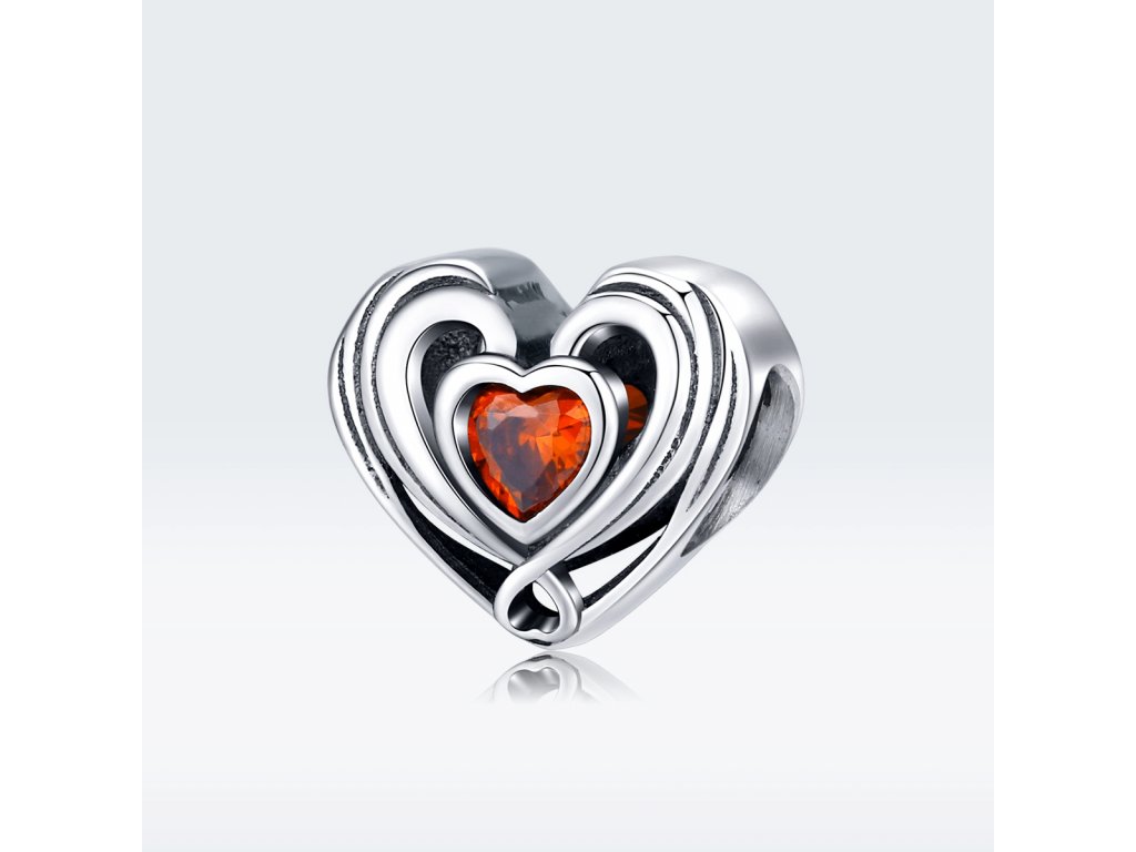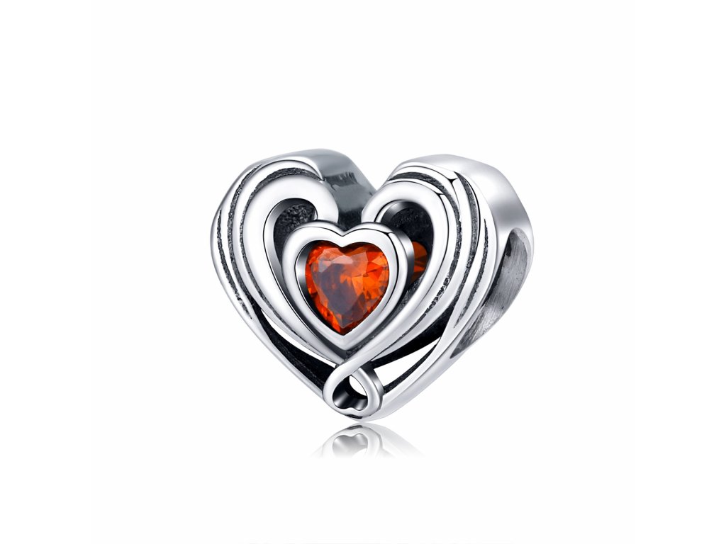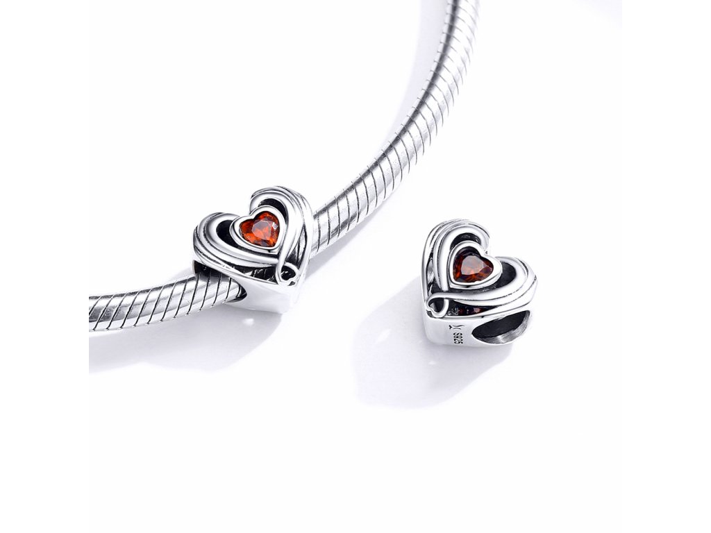 - Stříbrný propracovaný přívěsek v designu Prolamovaného srdce zdobeného červenými blyštivými zirkony z obou stran. Originální design přívěsku, kvalitní zpracování a materiál, ručně dohotovené.