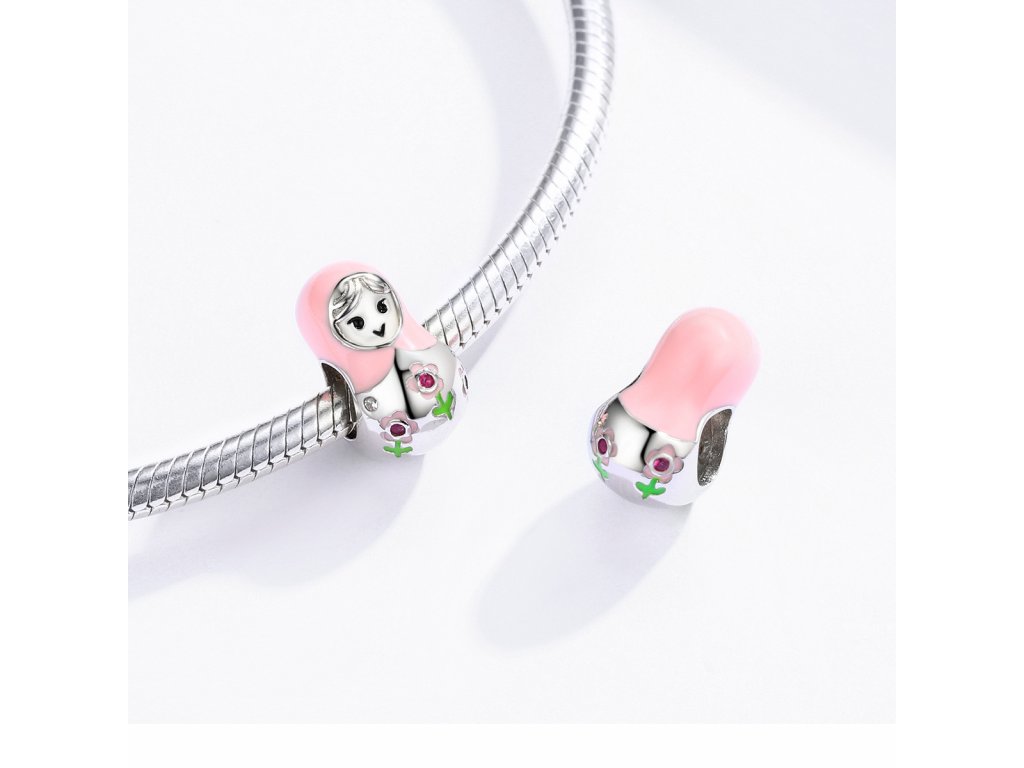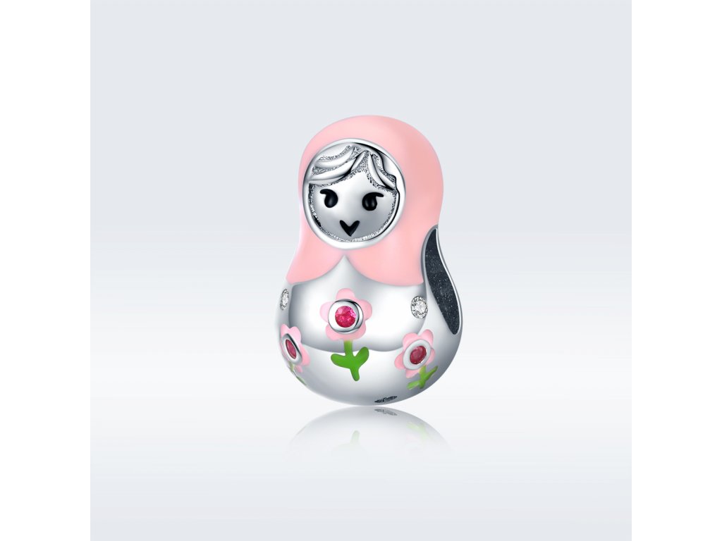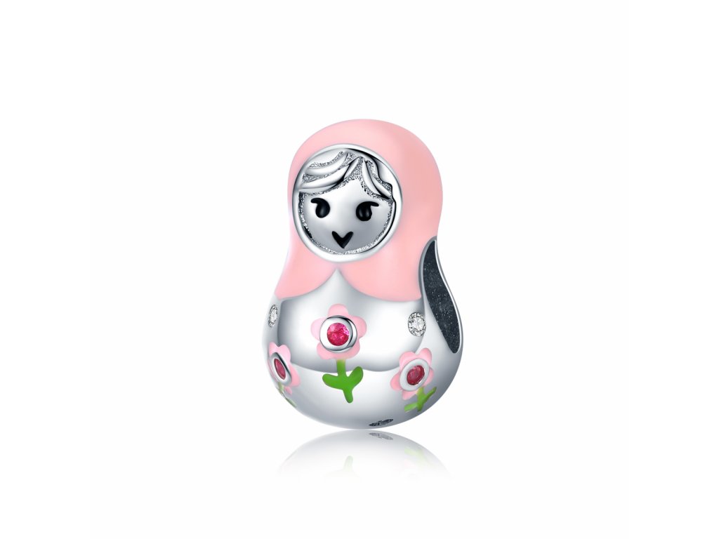 - Stříbrný přívěsek v designu Ruské panenky Matrjošky zdobené květiny s třešňově červenými zirkony a ručně nanášenou světle růžovou a zelenou glazurou. Originální design přívěsku, kvalitní zpracování a materiál, ručně dohotovené.