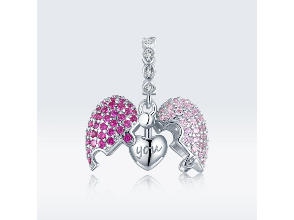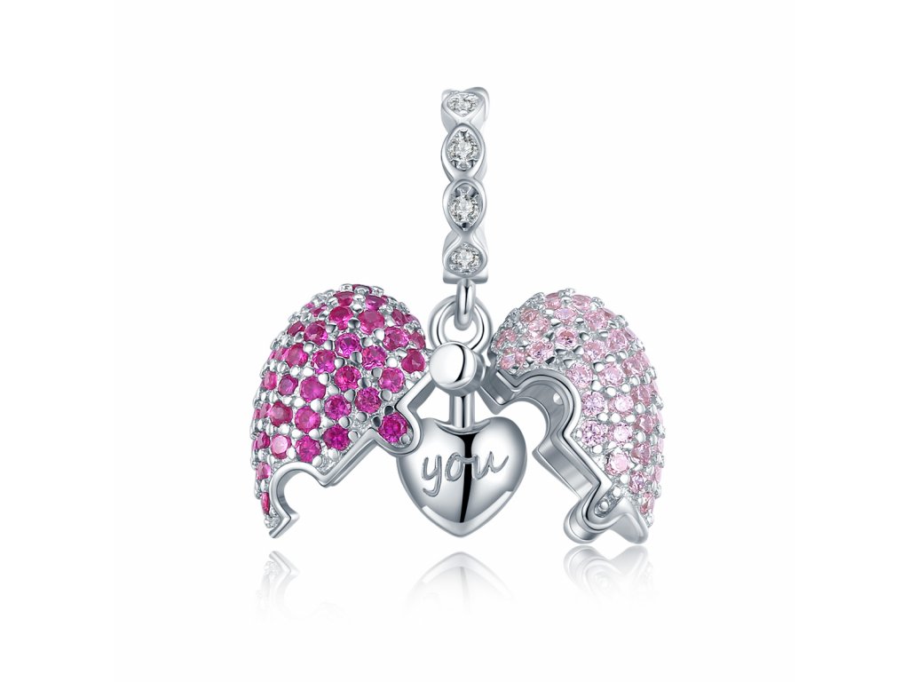 - Stříbrný visací otevírací přívěsek zdobený čirými a růžovými kameny v podobě třpytivých zirkonů. Hlavní atribut tohoto přívěsku je skryté srdíčko popsané anglickými nápisy z obou stran "Only" a "You" v překladu "Jedině Ty". Originální design přívěsku, kvalitní zpracování a materiál, ručně dohotovené.