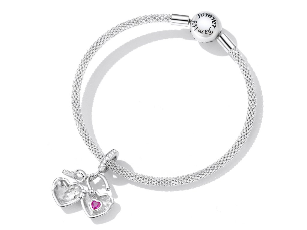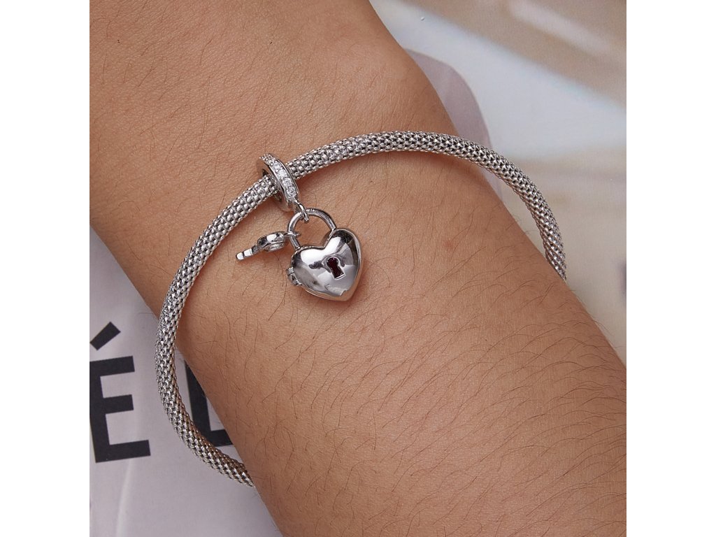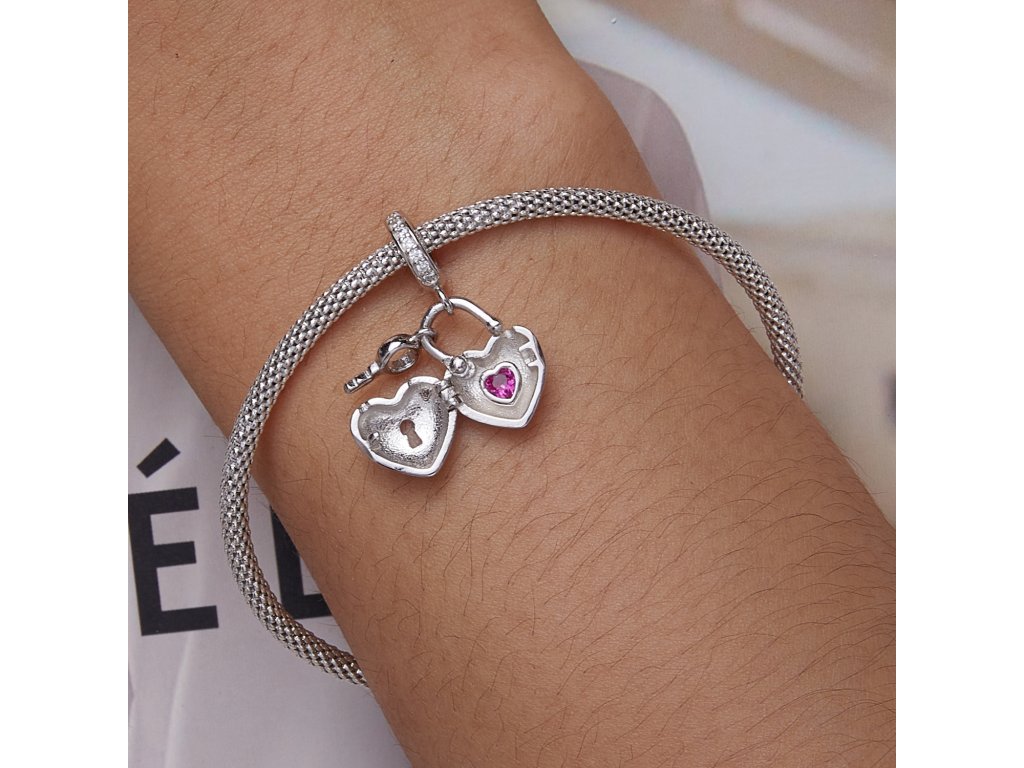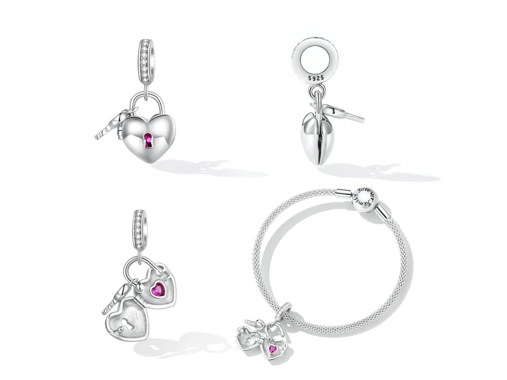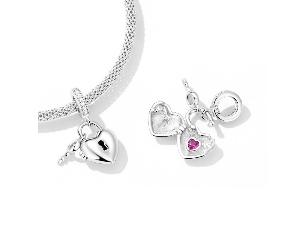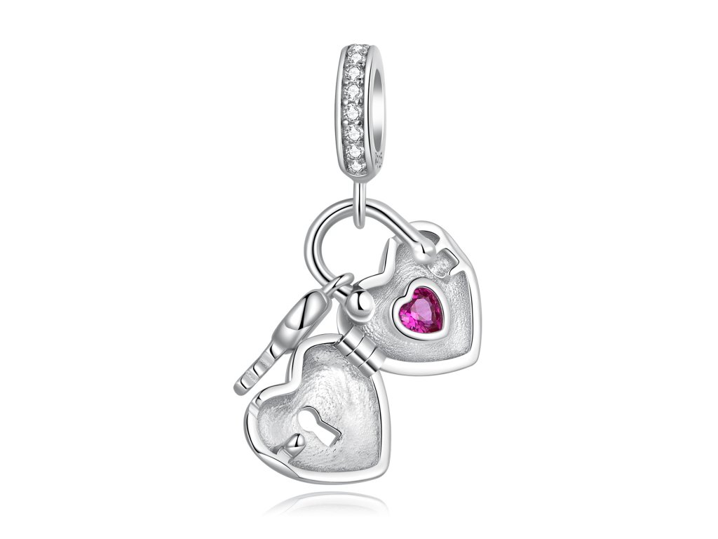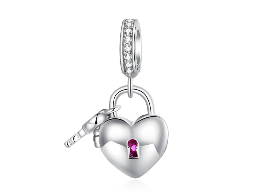 - Stříbrný visací otevírací přívěsek ve tvaru srdce s klíčem zdobený třešňově červeným broušeným zirkonem ve tvaru srdce a okolními čirými třpytivými zirkony. Originální design přívěsku, kvalitní zpracování a materiál, ručně dohotovené.