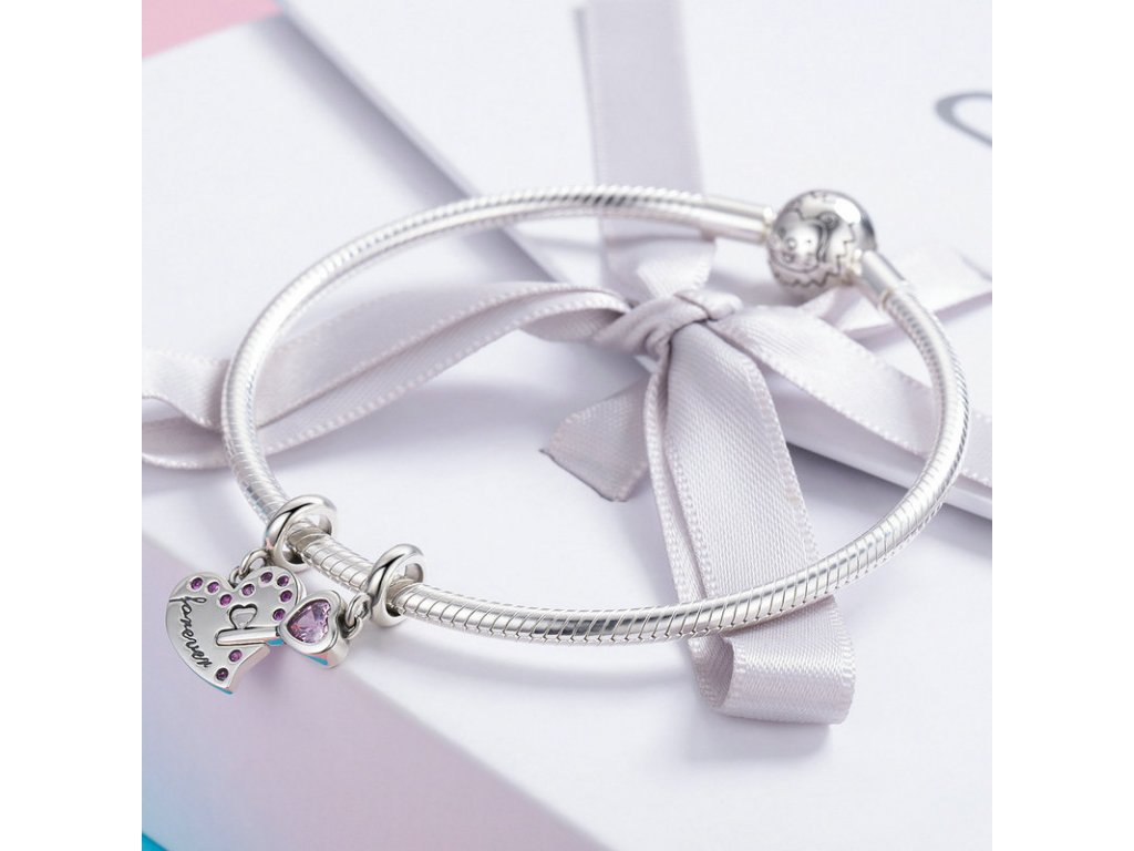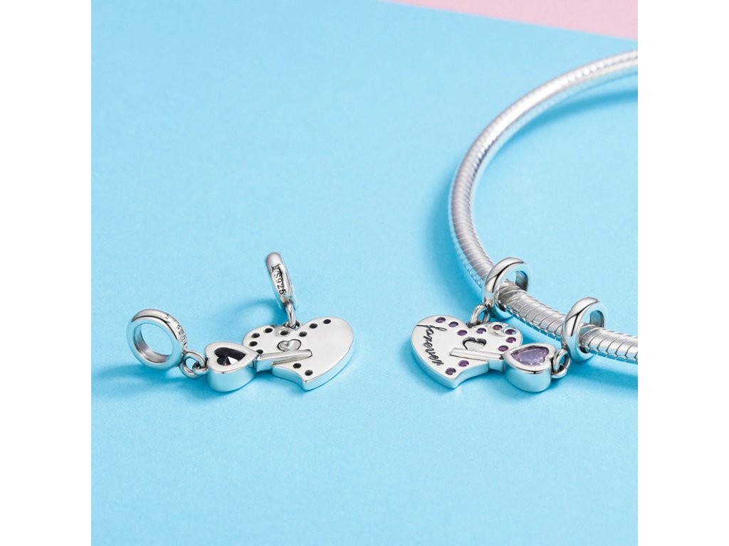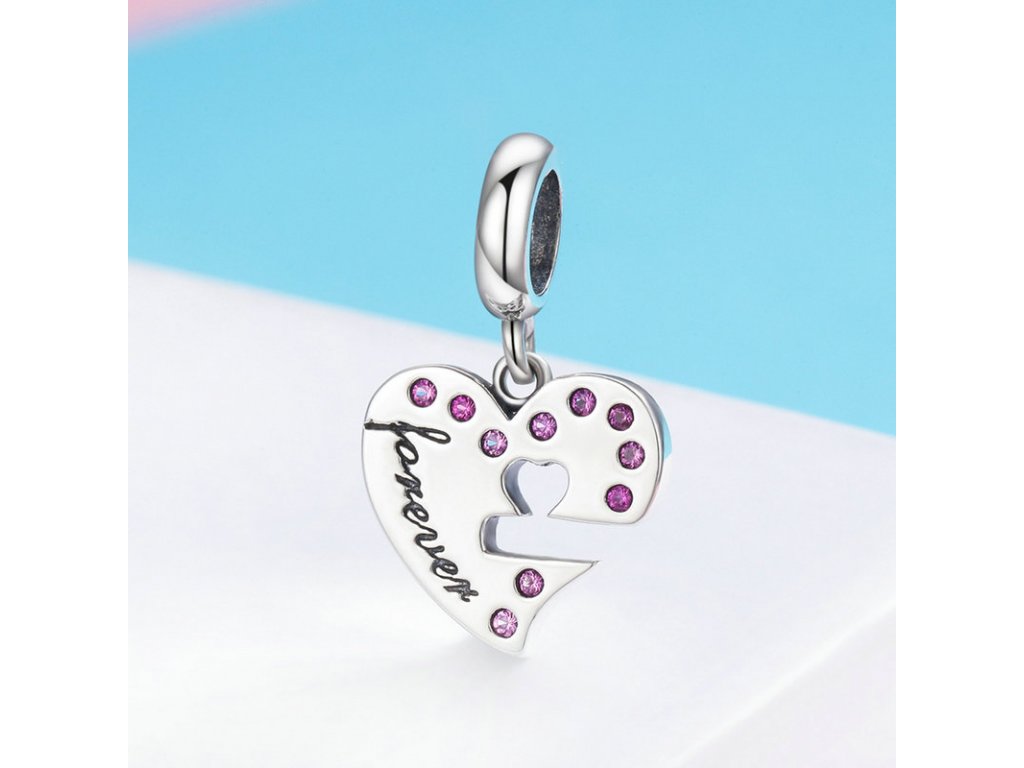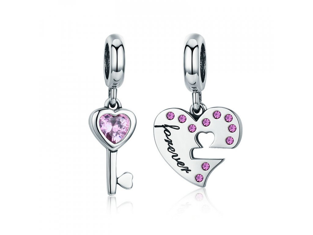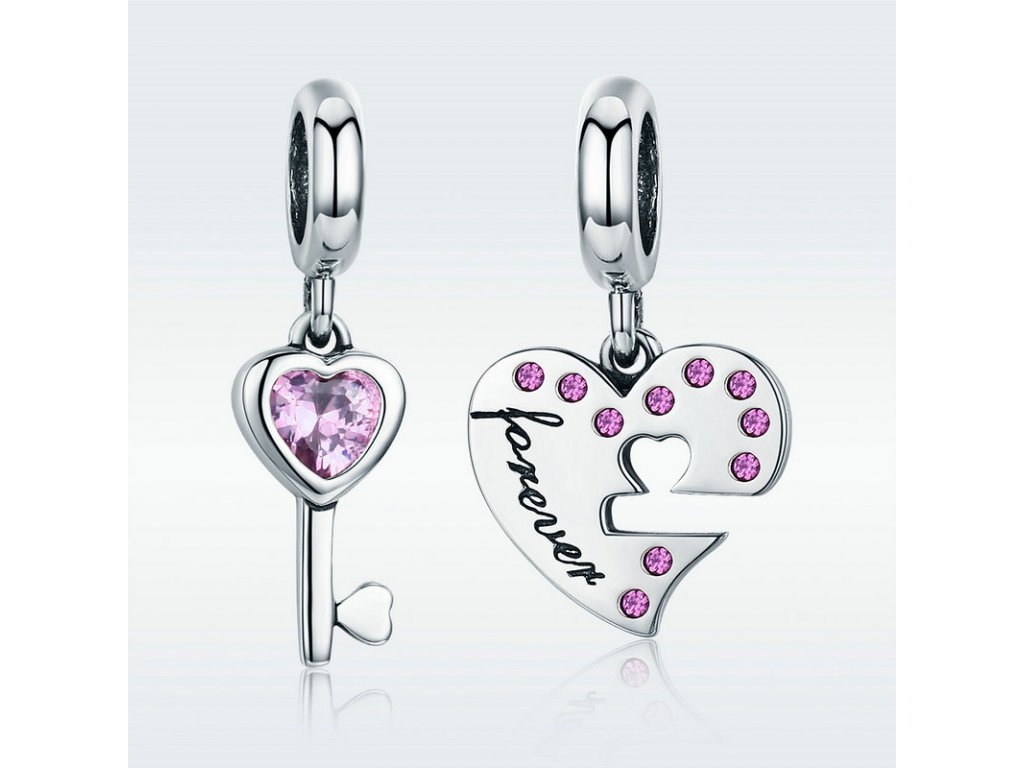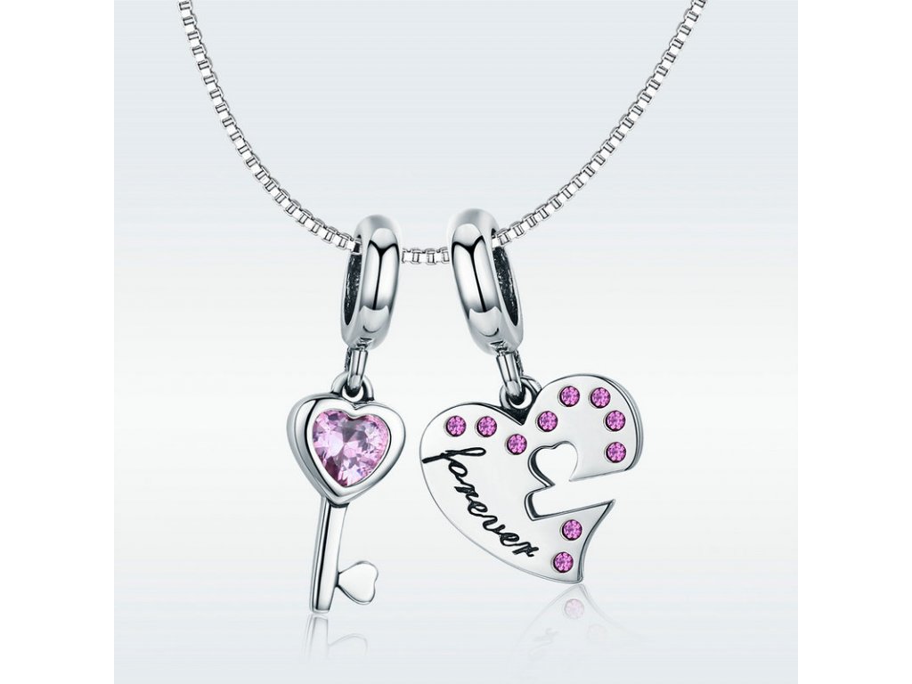 - Udělejte radost své partnerce a darujte ji klíč od Vašeho srdce. Přívěsek se skládá ze dvou částí, klíče zdobeného růžovým zirkonem a srdce s anglickým nápis "Forever" v překladu "Navždy", které lze nosit společně nebo samostatně. Originální design přívěsku, kvalitní zpracování a materiál, ručně dohotovené.