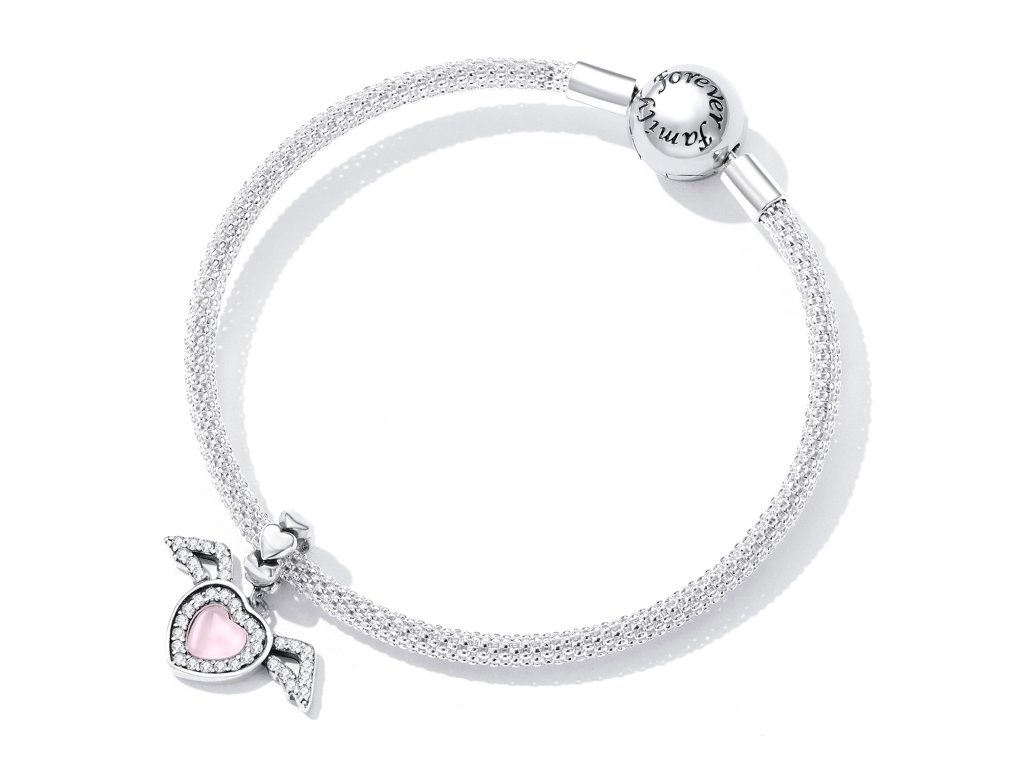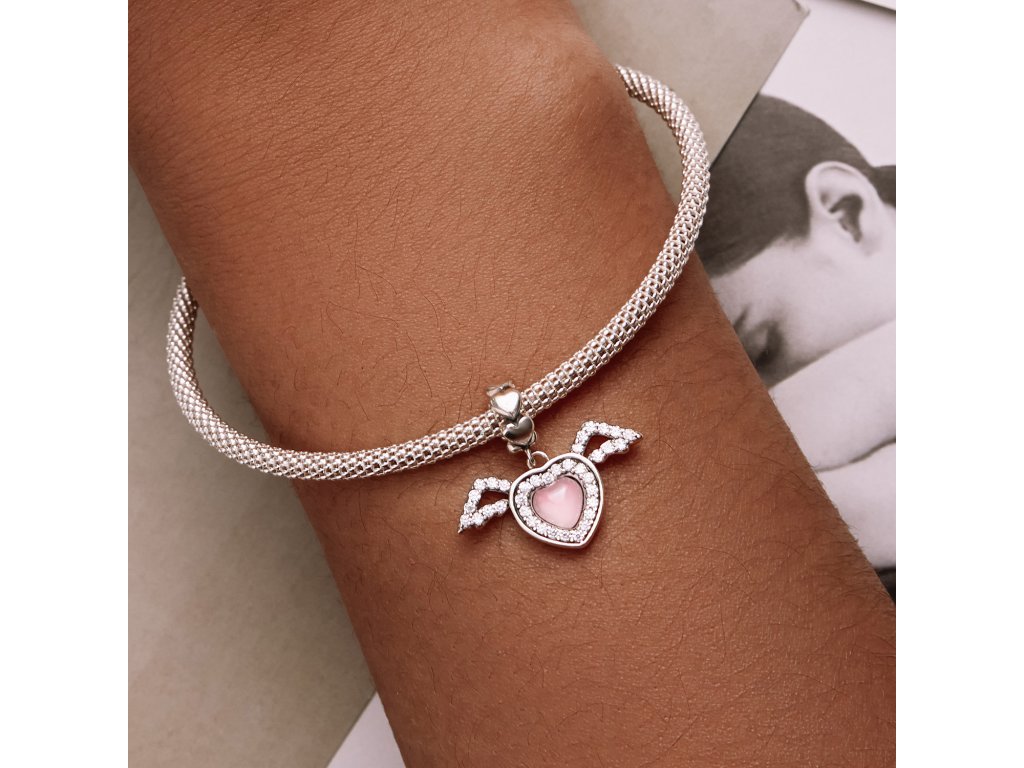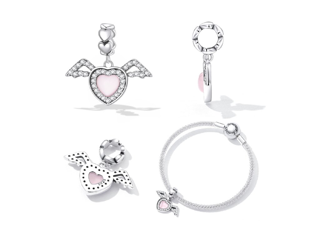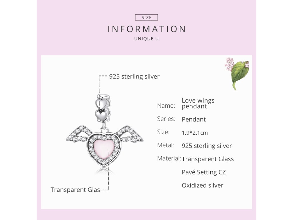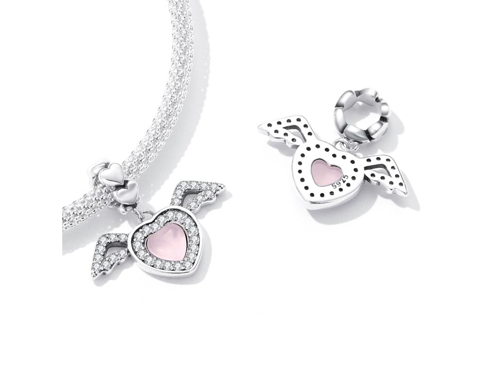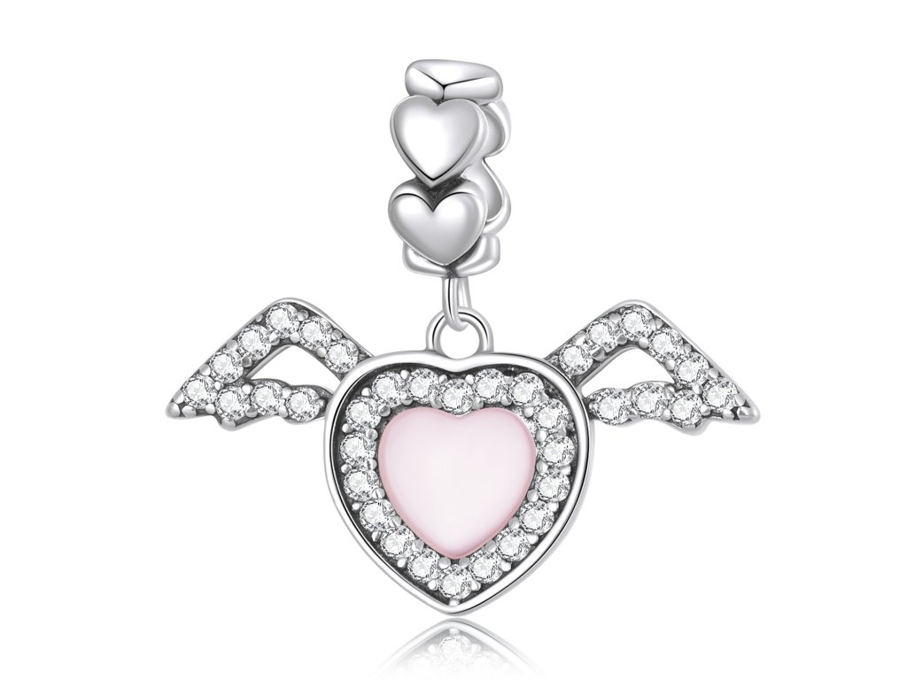 - Stříbrný visací přívěsek ve tvaru srdce s křídly zdobený růžovým hladkým sklem a čirými třpytivými zirkony. Originální design přívěsku, kvalitní zpracování a materiál, ručně dohotovené.