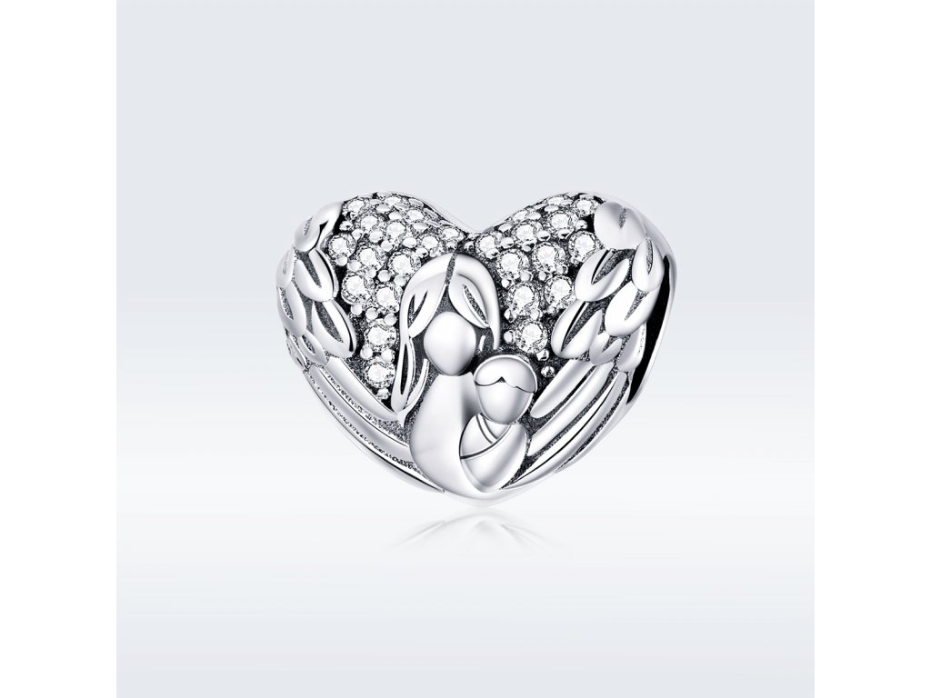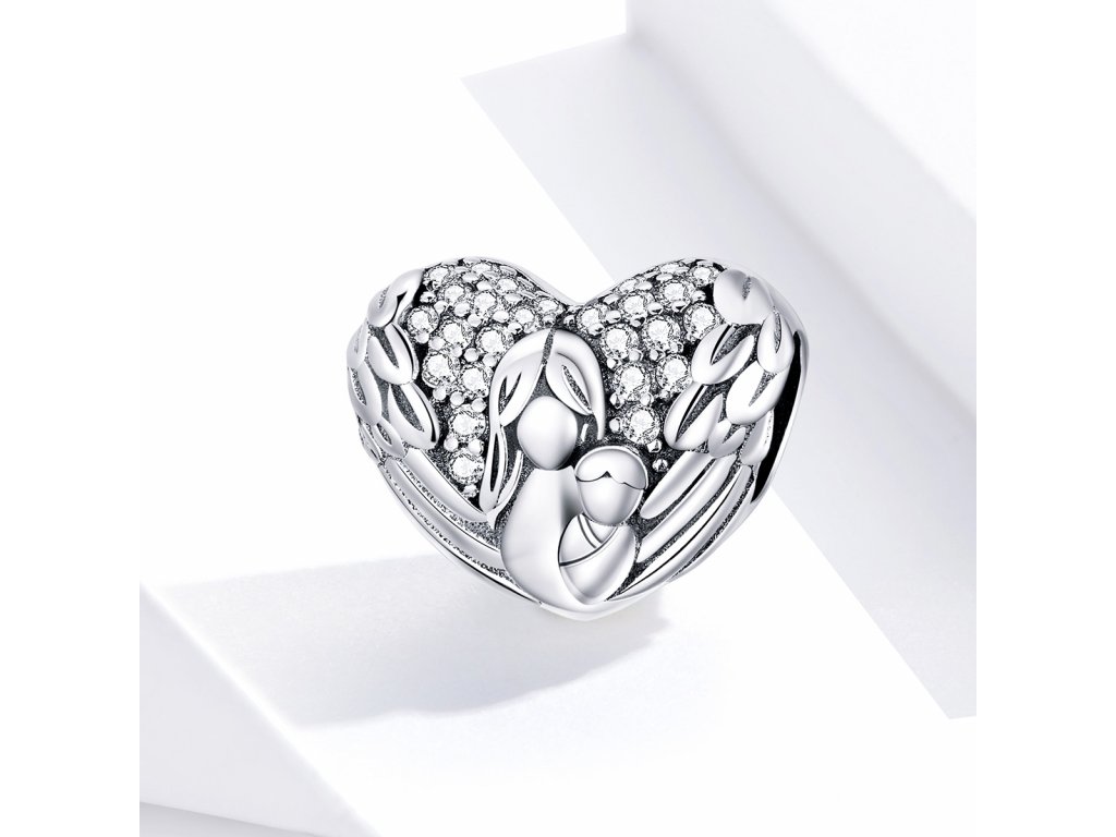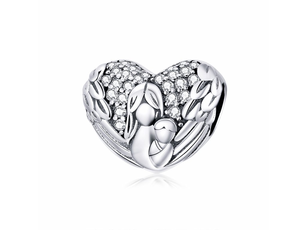 - Stříbrný přívěsek ve tvaru srdce v designu Andělské mateřské lásky zdobený čirými třpytivými zirkony a anglickým nápisem "Thank you and love you" v překladu "Děkuji a miluji tě".