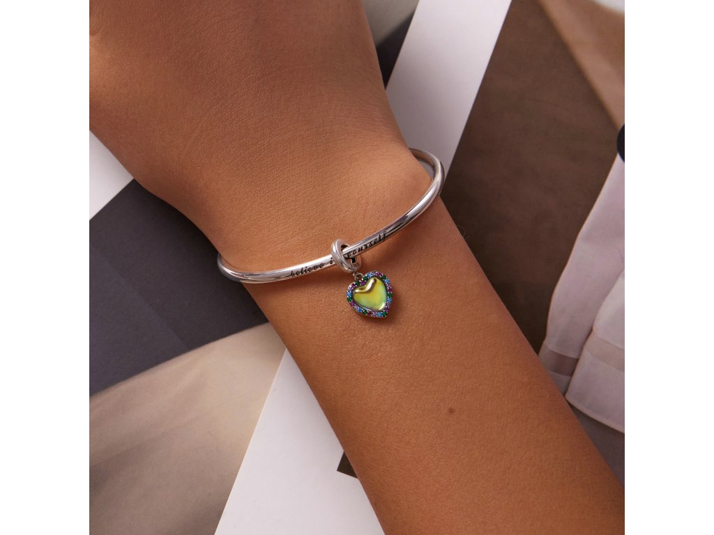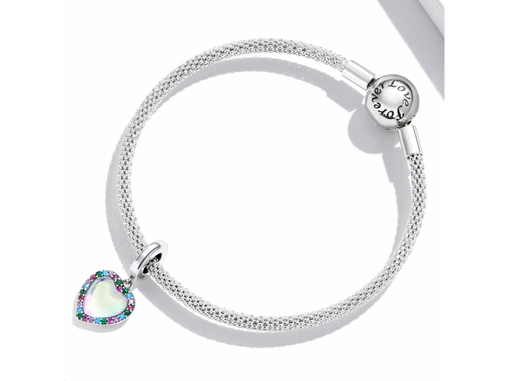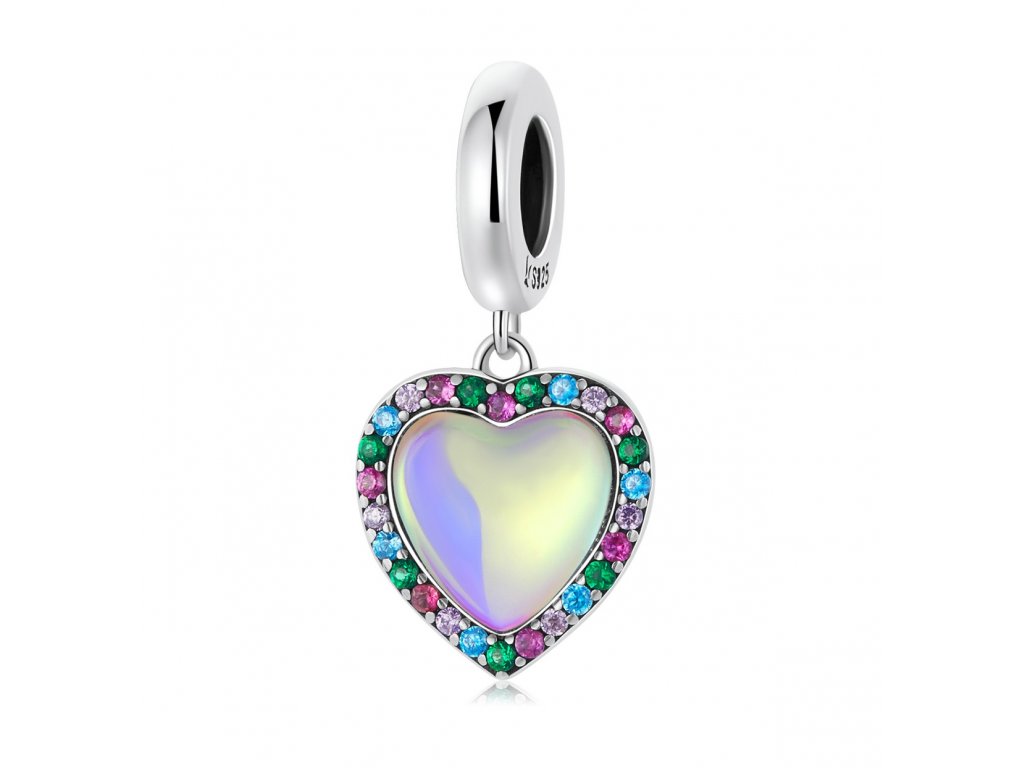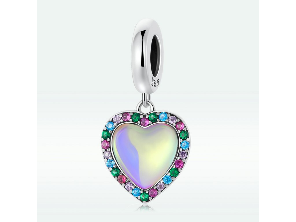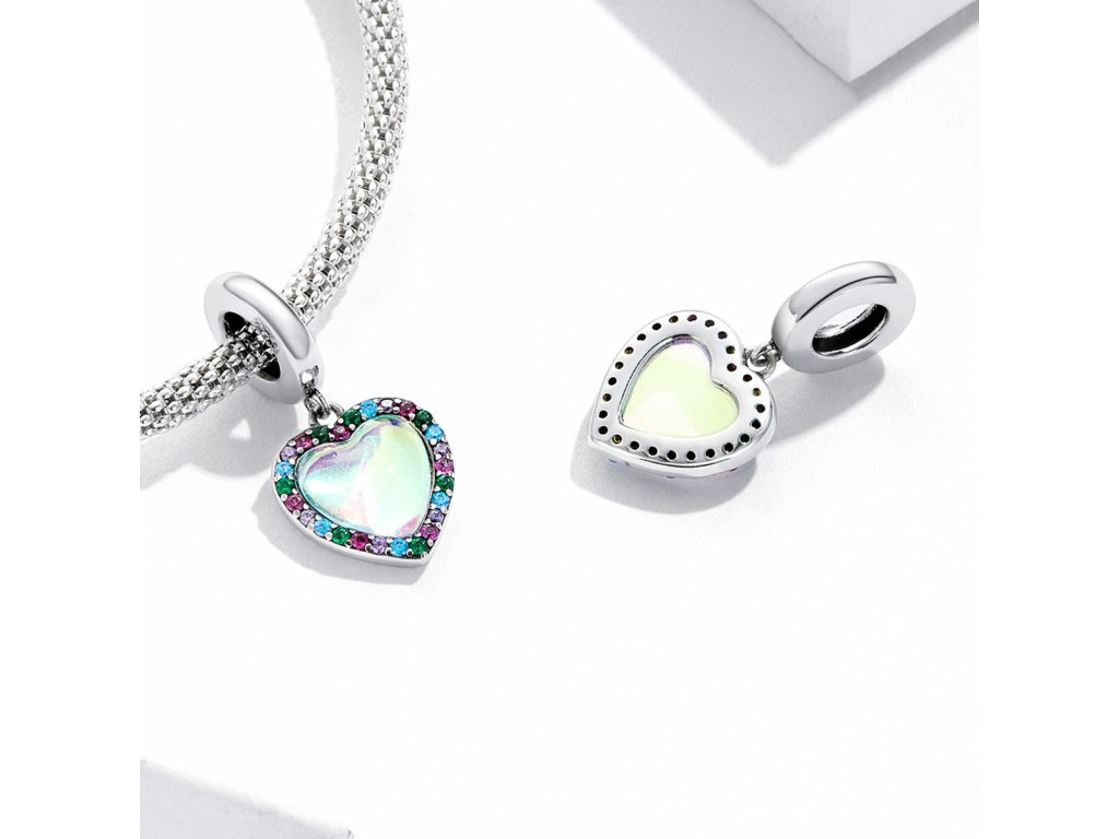 - Stříbrný visací přívěsek ve tvaru srdce s hladkým barevným sklem a třpytivými barevnými zirkony okolo. Originální design přívěsku, kvalitní zpracování a materiál, ručně dohotovené.