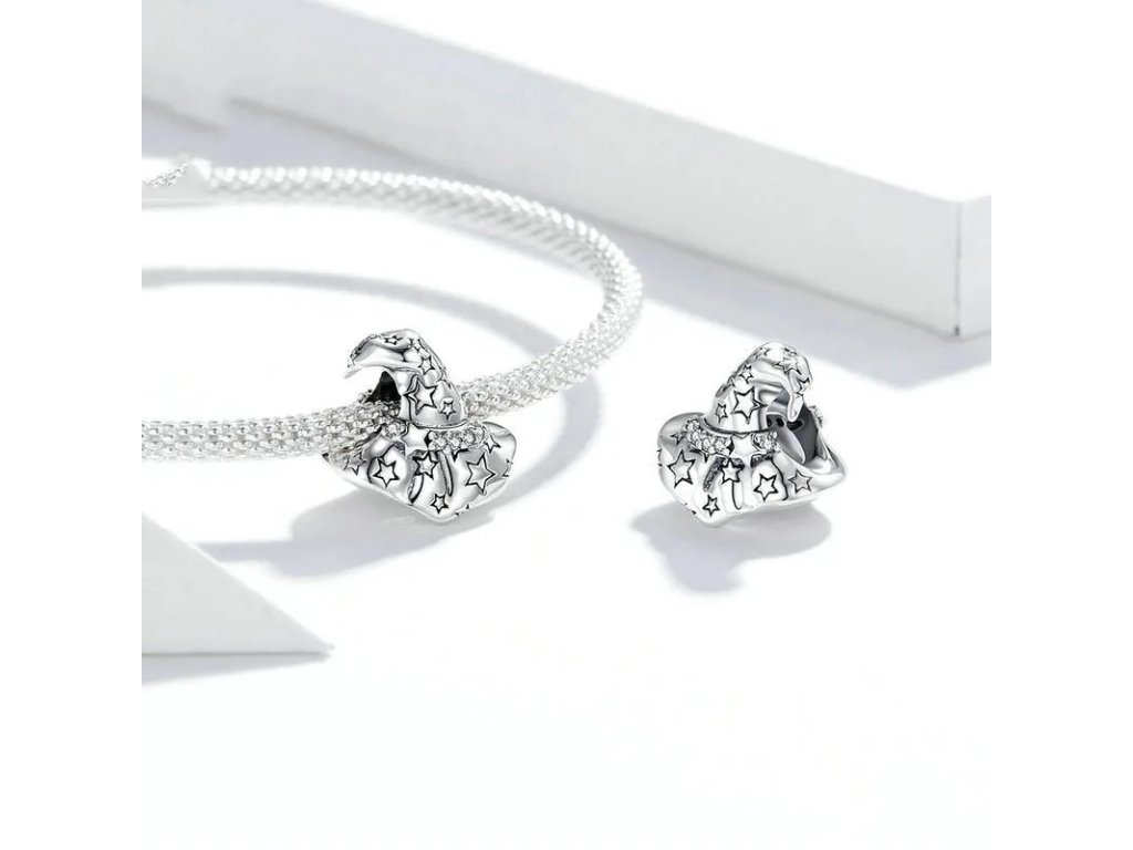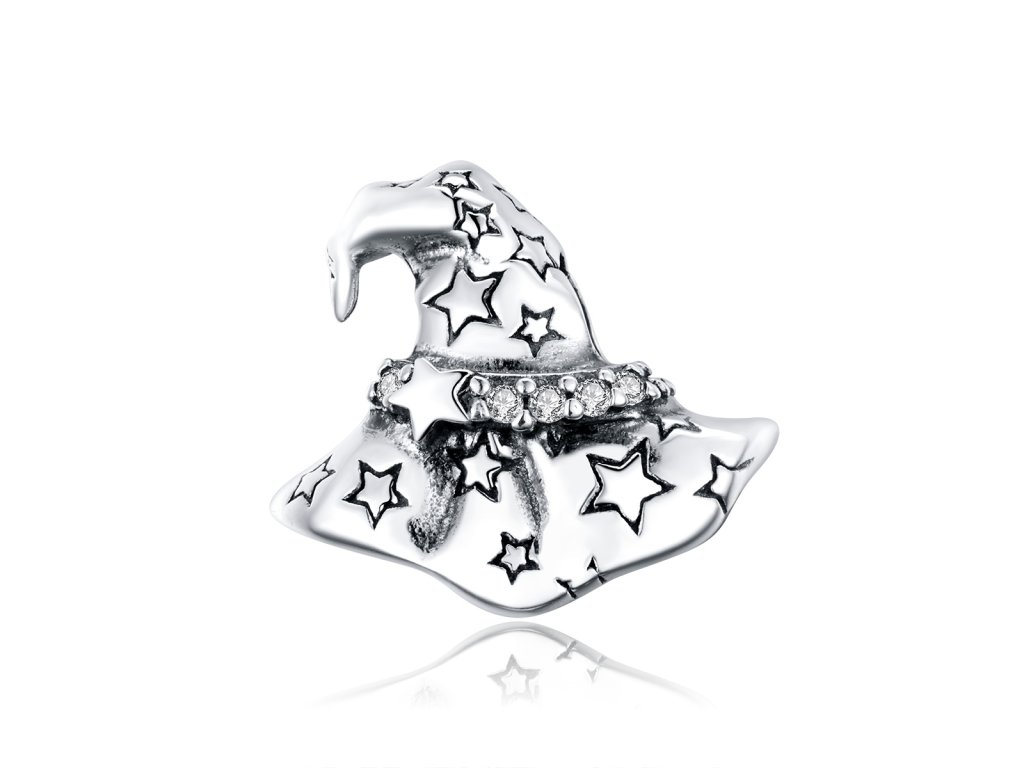 - Stříbrný přívěsek z kolekce Halloween. Přívěsek v designu čarodějnického klobouku s hvězdami je posázený čirými třpytivými zirkony.