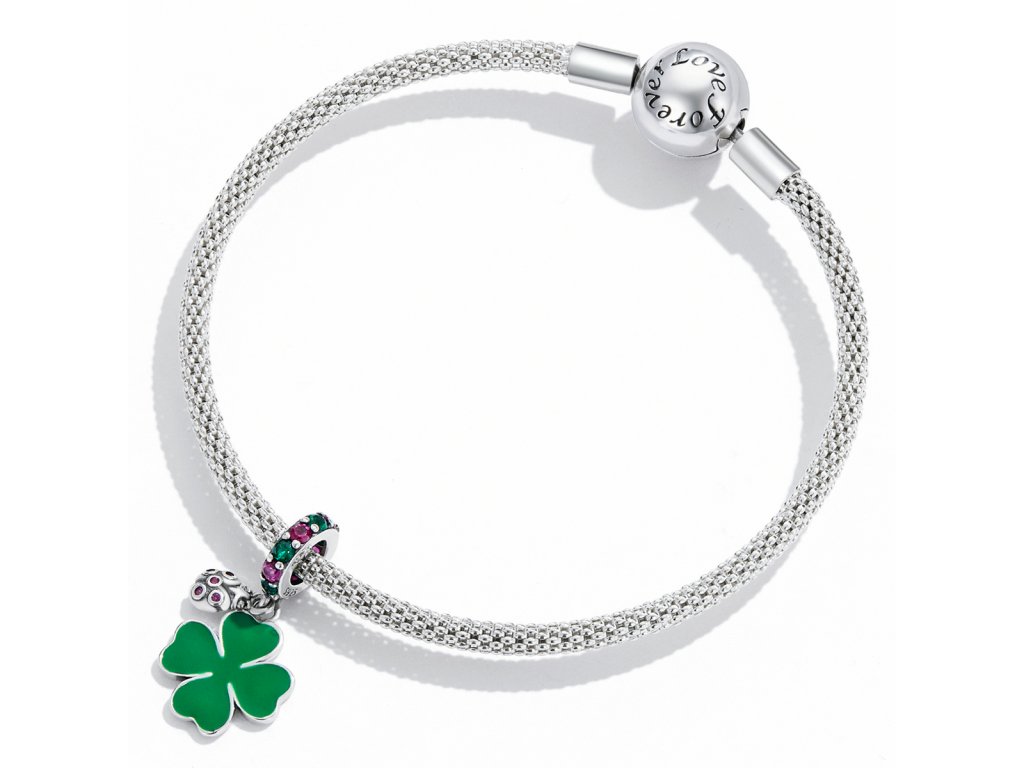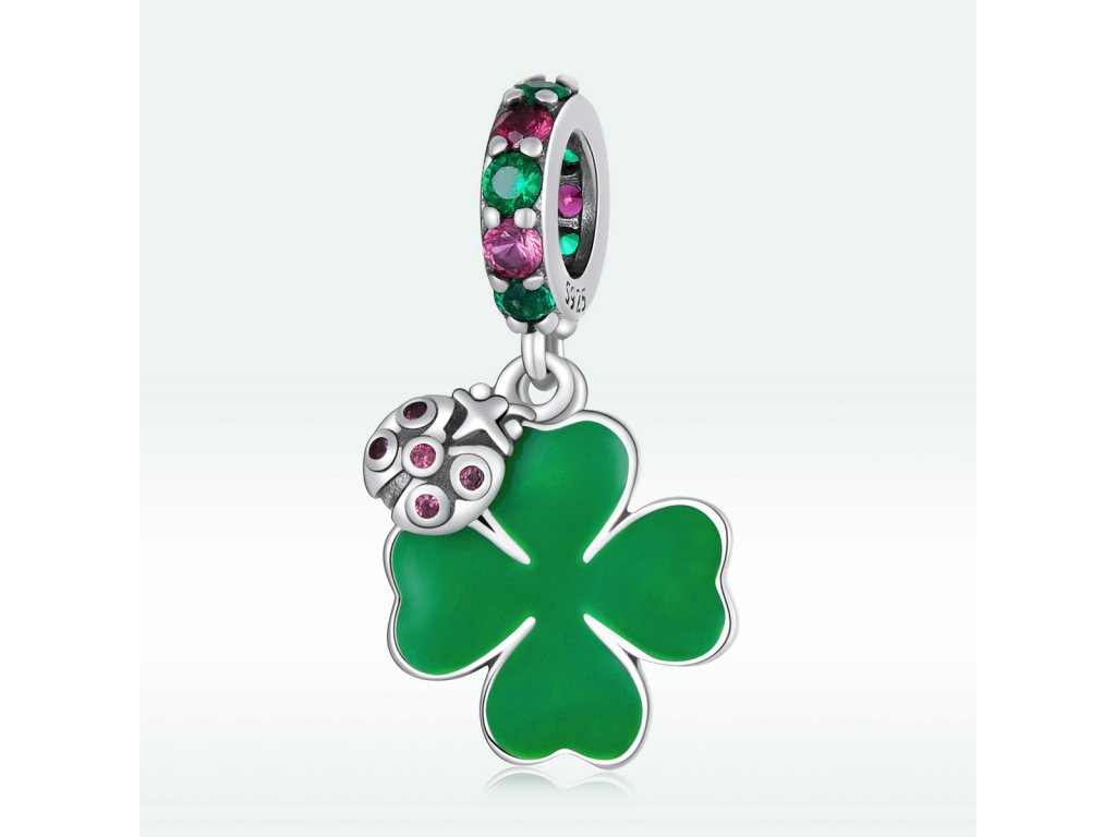 - Stříbrný visací přívěsek v designu čtyřlístku pro štěstí s krásnou beruškou. Přívěsek je zdoben ručně nanášenou zelenou glazurou a třpytivými barevnými zirkony. Originální design přívěsku, kvalitní zpracování a materiál, ručně dohotovené.