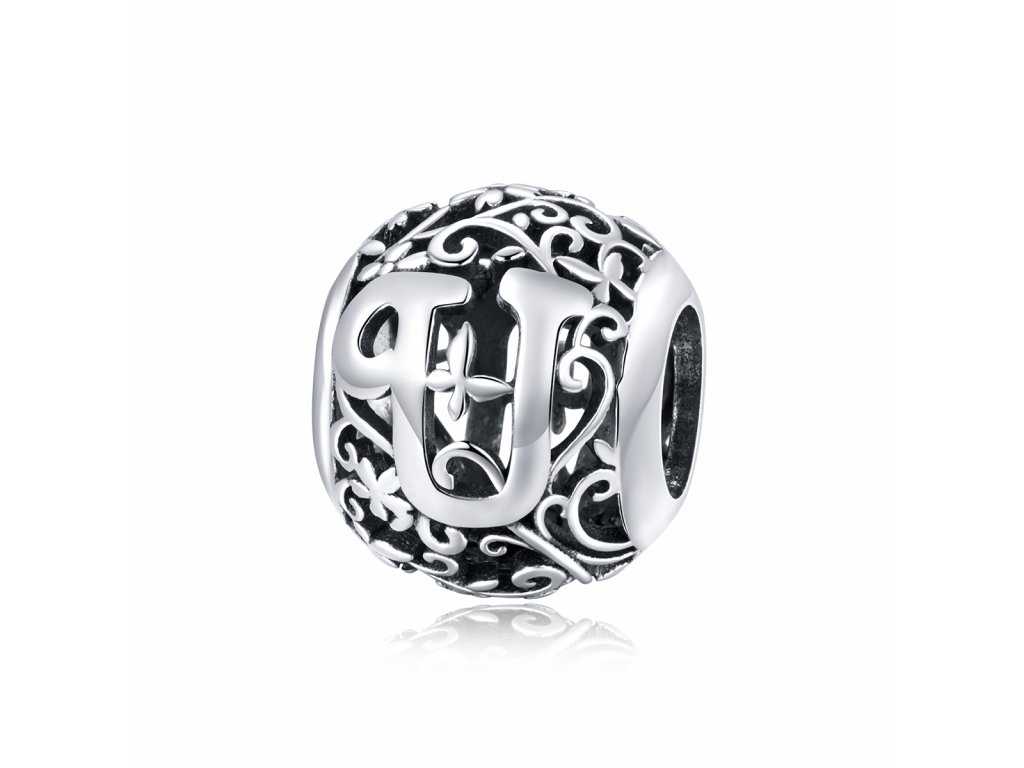 - Stříbrný filigránový přívěsek / korálek v designu písmenka U zdobený rozkvetlými květy a lístky.