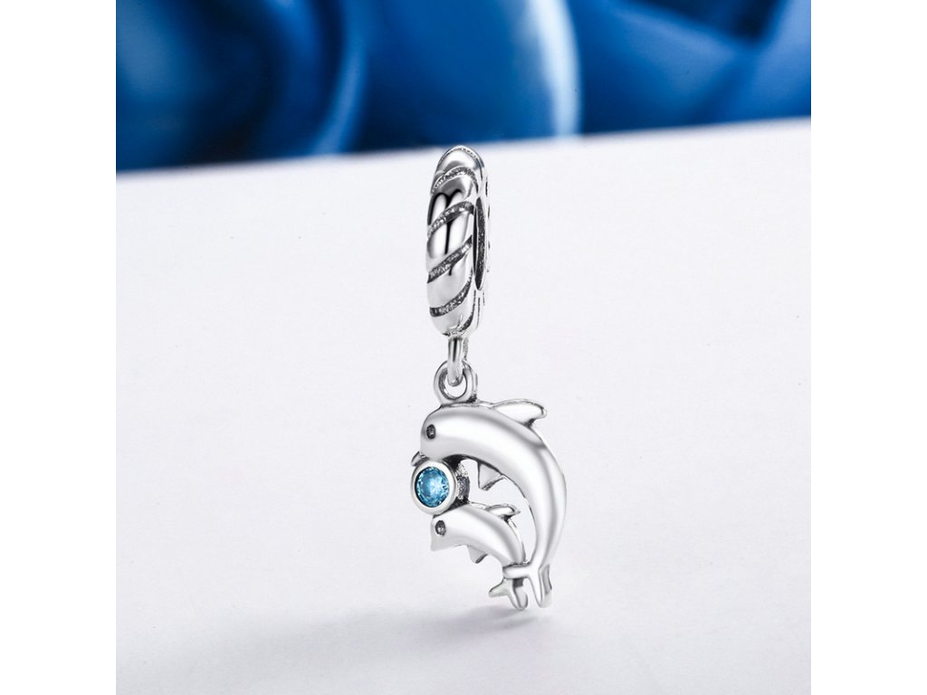 Hravý a propracovaný visací přívěsek se dvěma delfínky a třpytivým tyrkysovým kamenem.