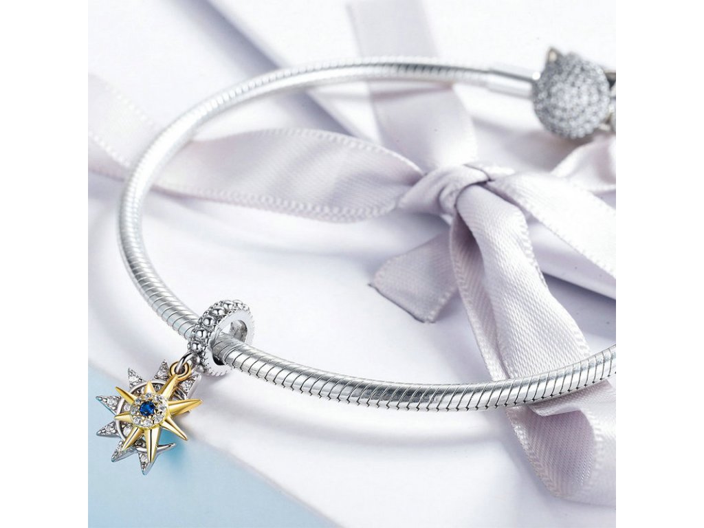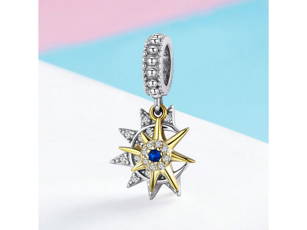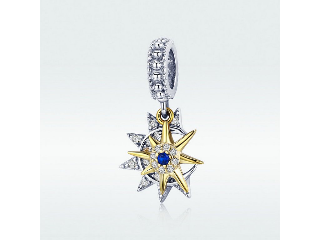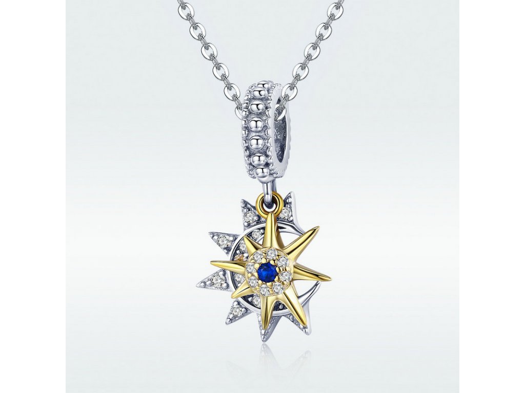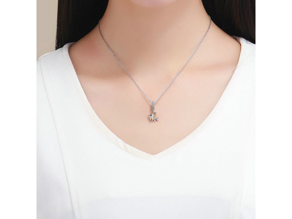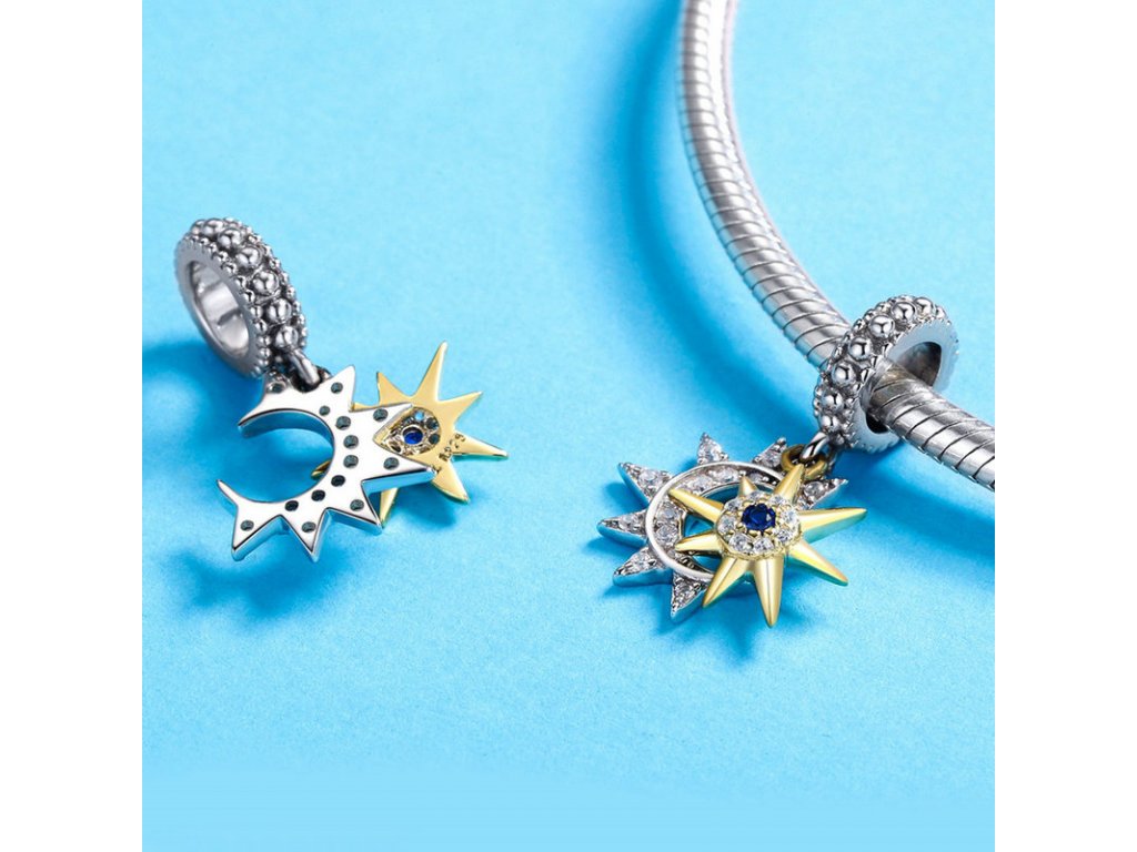 Krásný a elegantní stříbrný visací přívěsek znázorňující den a noc v podobě zářícího slunce s modrým zirkonem a měsíce se třpytivými zirkony. Originální design přívěsku, kvalitní zpracování a materiál, ručně dohotovené.