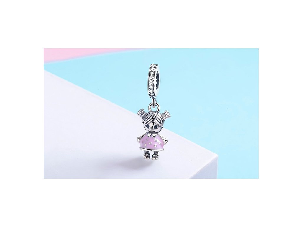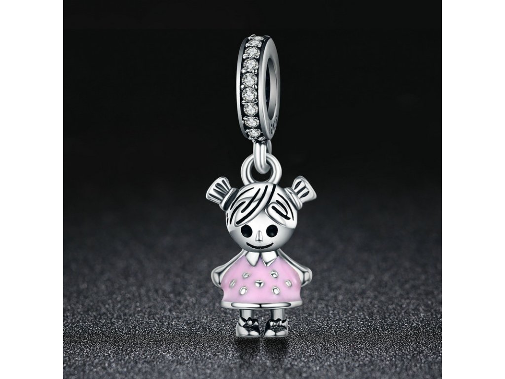 Hravý a propracovaný visací přívěsek v designu dívky zdobené ručně ručně nanášenou růžovou glazurou.