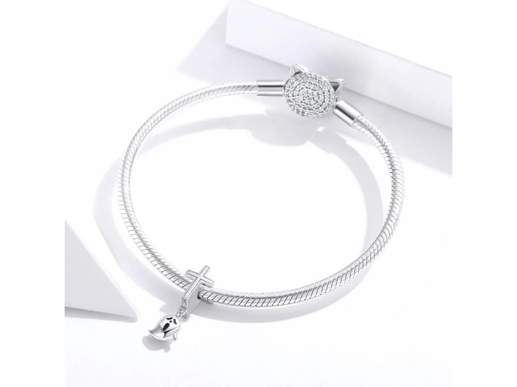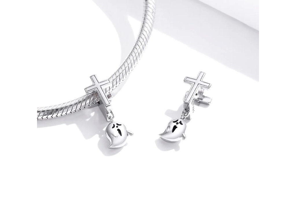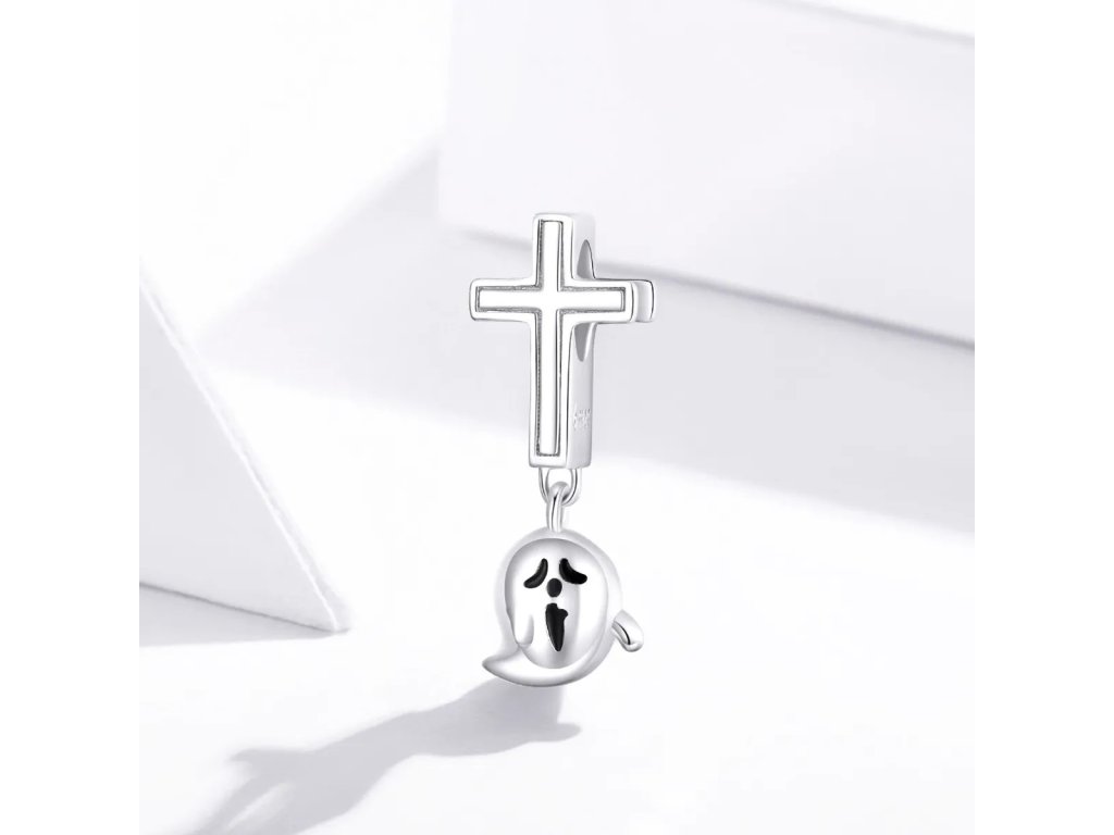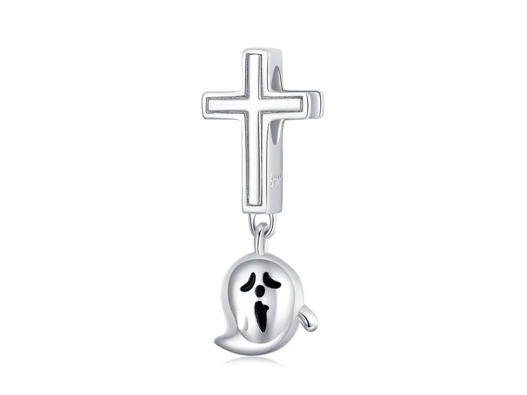 - Stříbrný přívěsek z kolekce Halloween v designu ducha s křížkem.