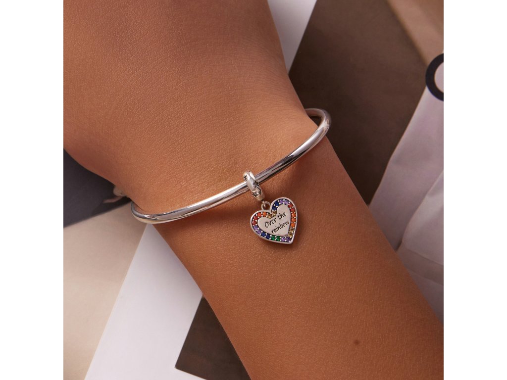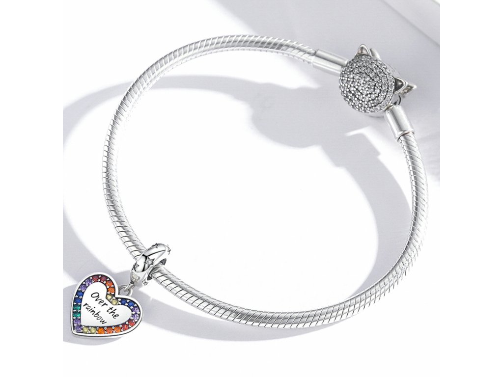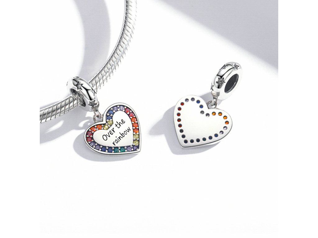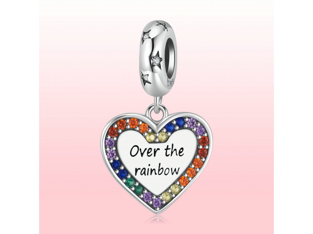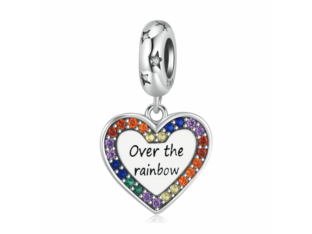 - Stříbrný visací přívěsek v designu duhového srdce zdobeného barevnými zirkony a anglickým nápisem "Over the rainbow" v překladu "Nad duhou". Originální design přívěsku, kvalitní zpracování a materiál, ručně dohotovené.