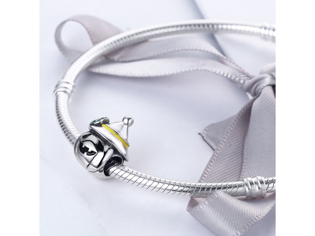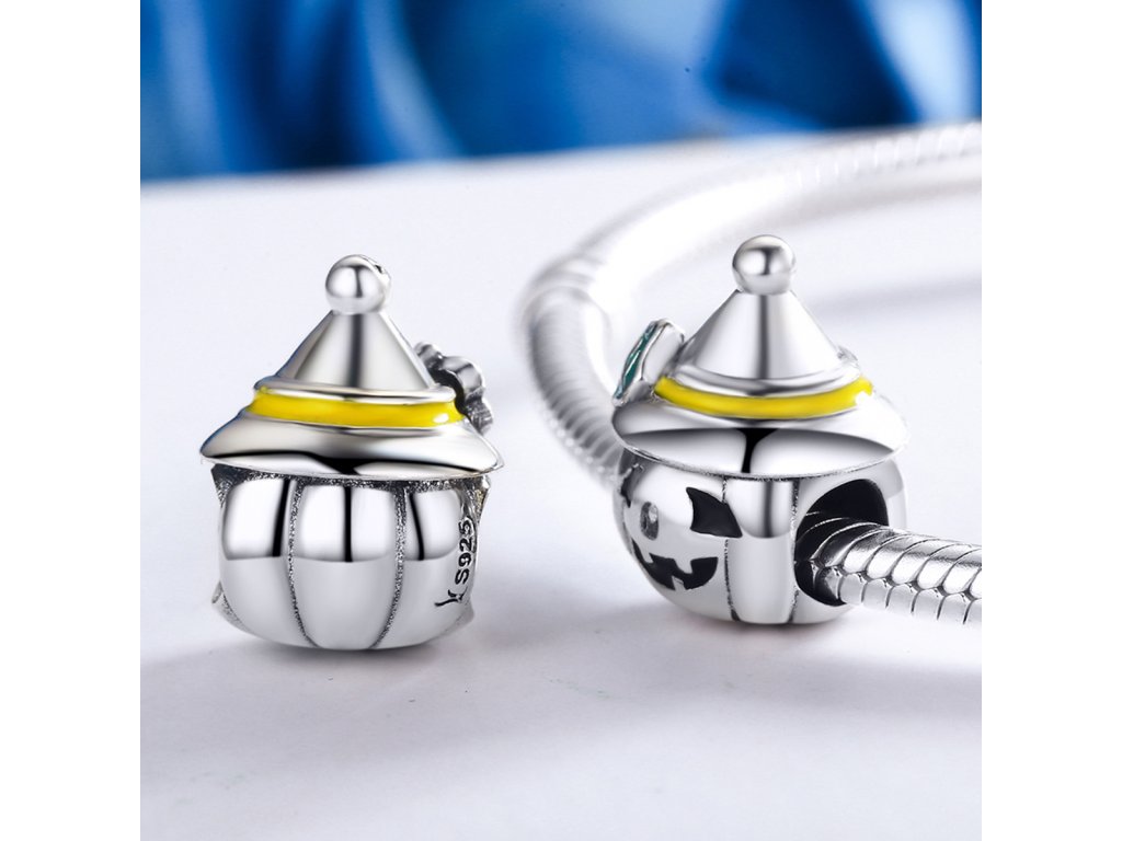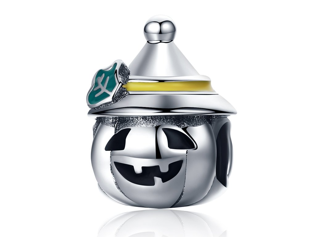 - Stříbrný přívěsek z kolekce Halloween. Přívěsek v designu dýně s kloboukem je ručně nanášen barevnou glazurou.