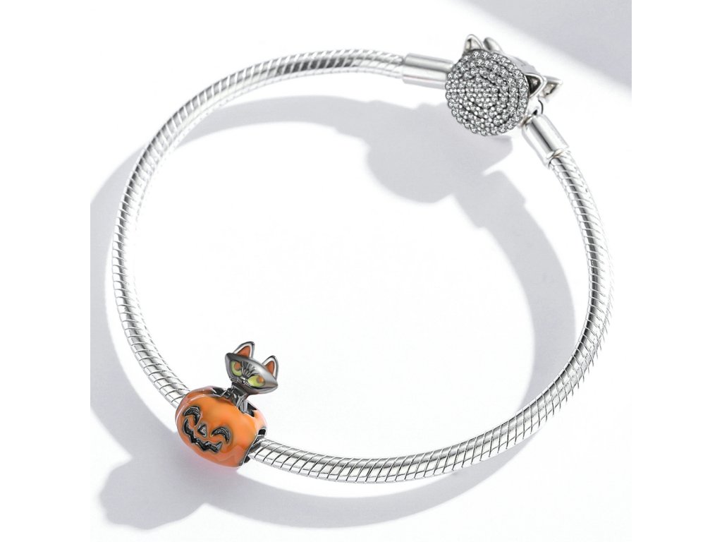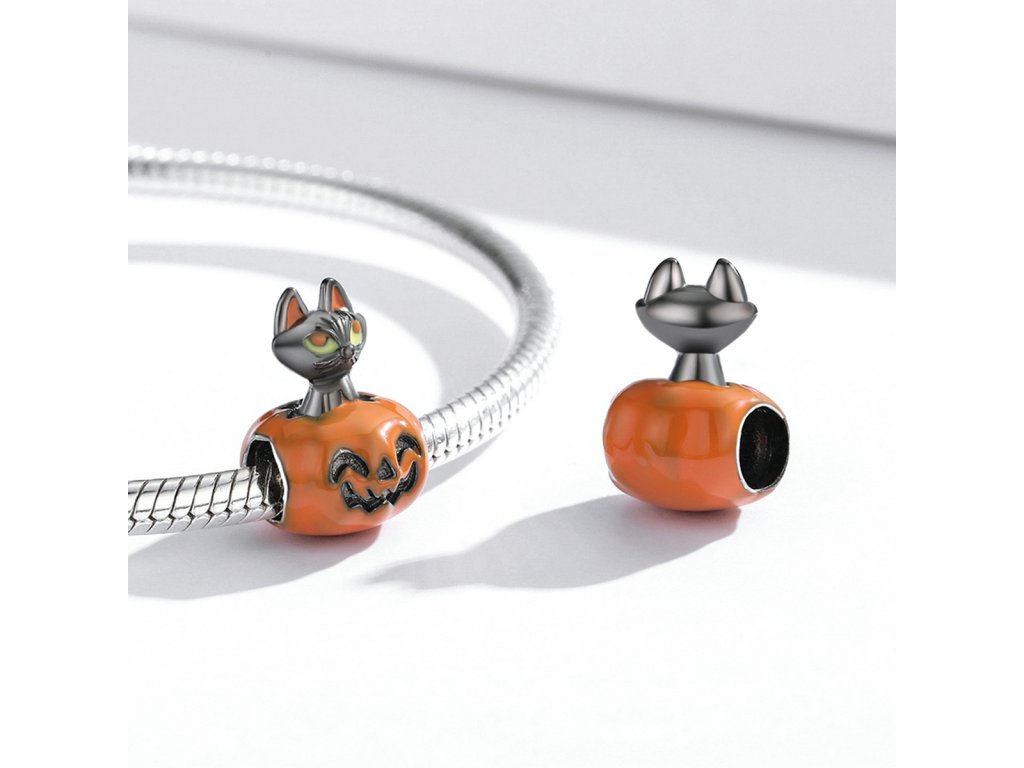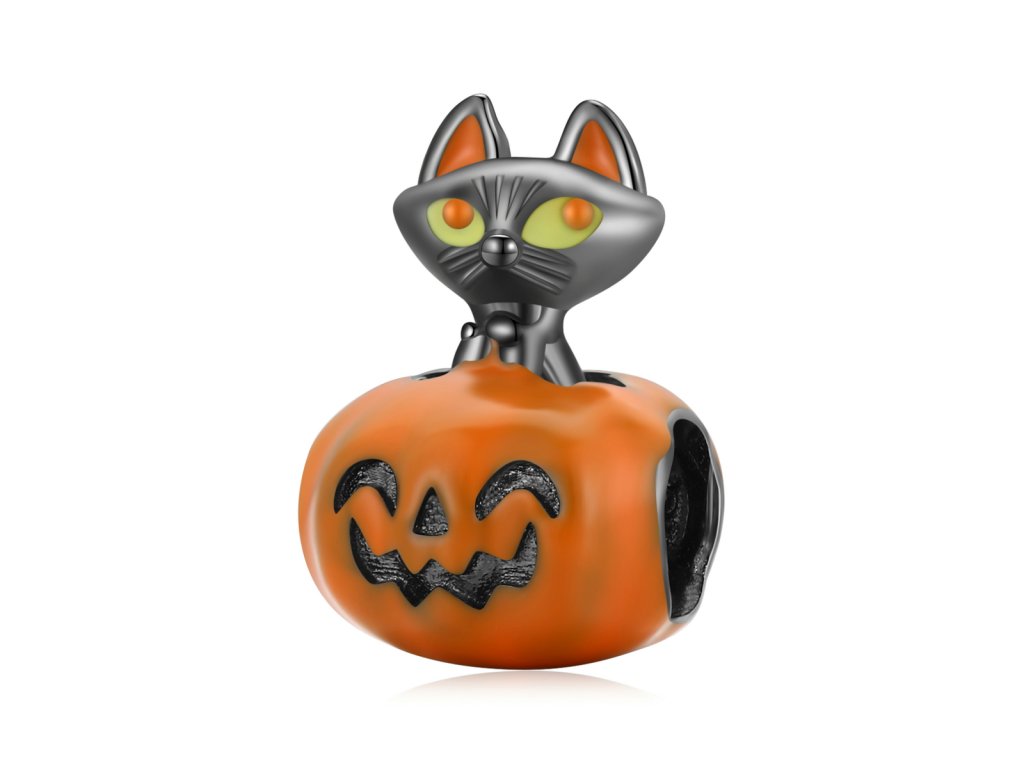 - Stříbrný přívěsek z kolekce Halloween. Přívěsek v designu dýně s kočkou je detailně zdobený ručně nanášenou barevnou glazurou.