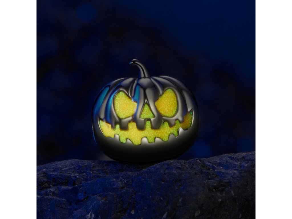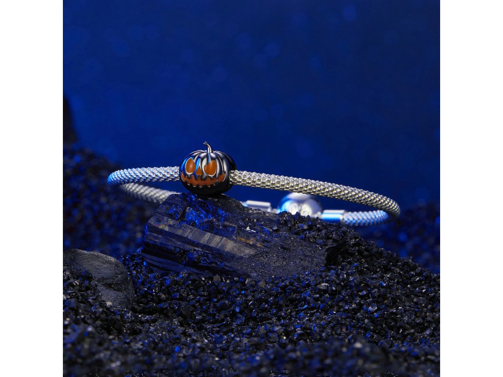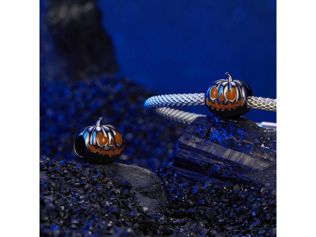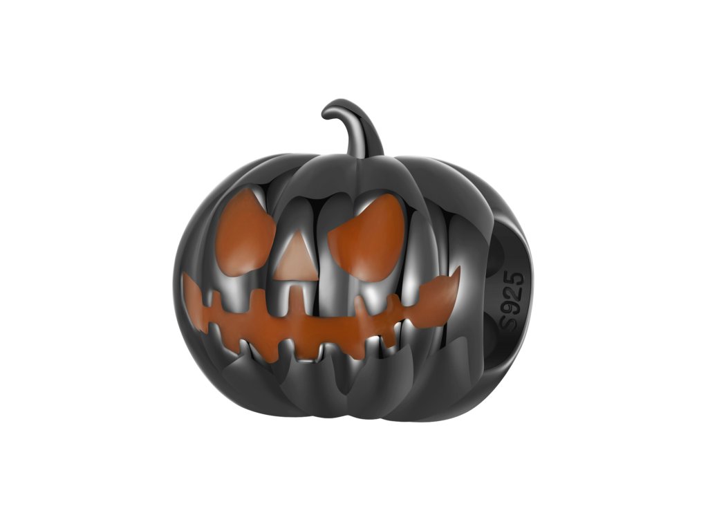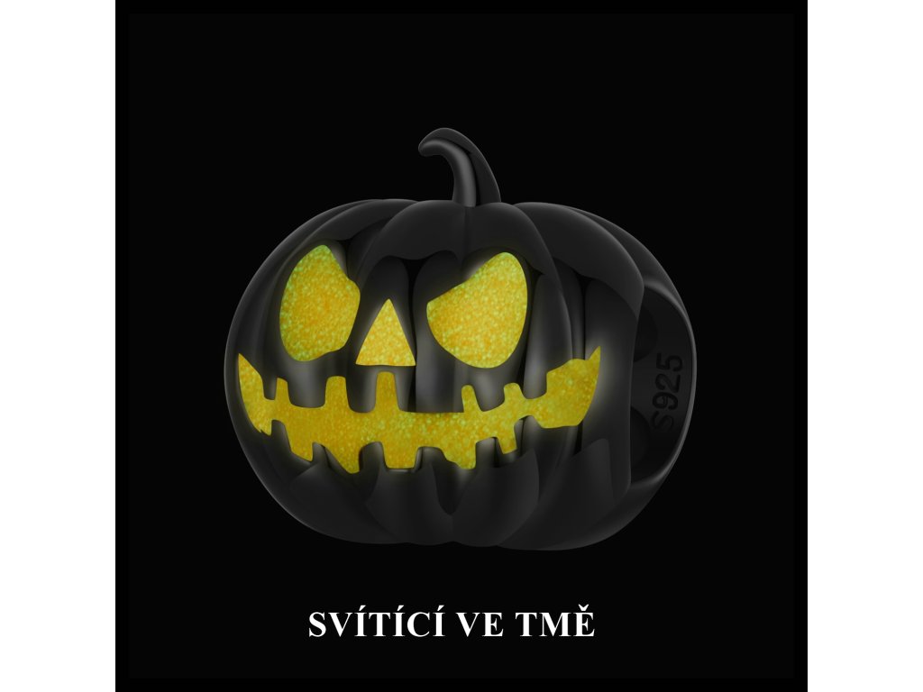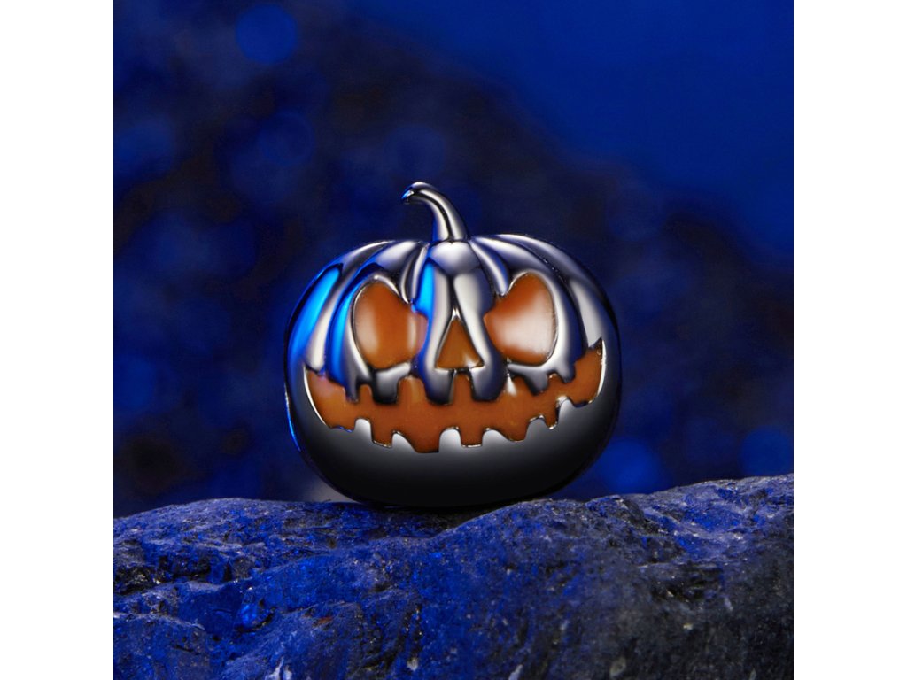 - Stříbrný přívěsek z kolekce Halloween. Přívěsek v designu strašidelné dýně zdobená glazurou svítící ve tmě.