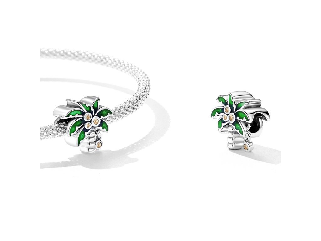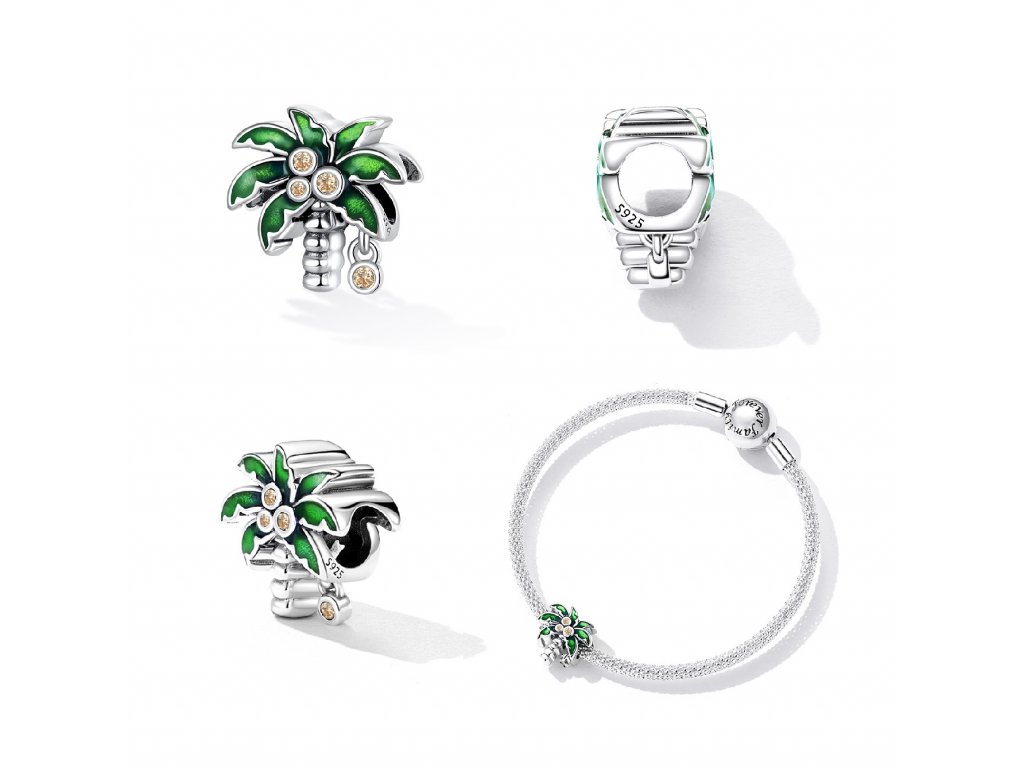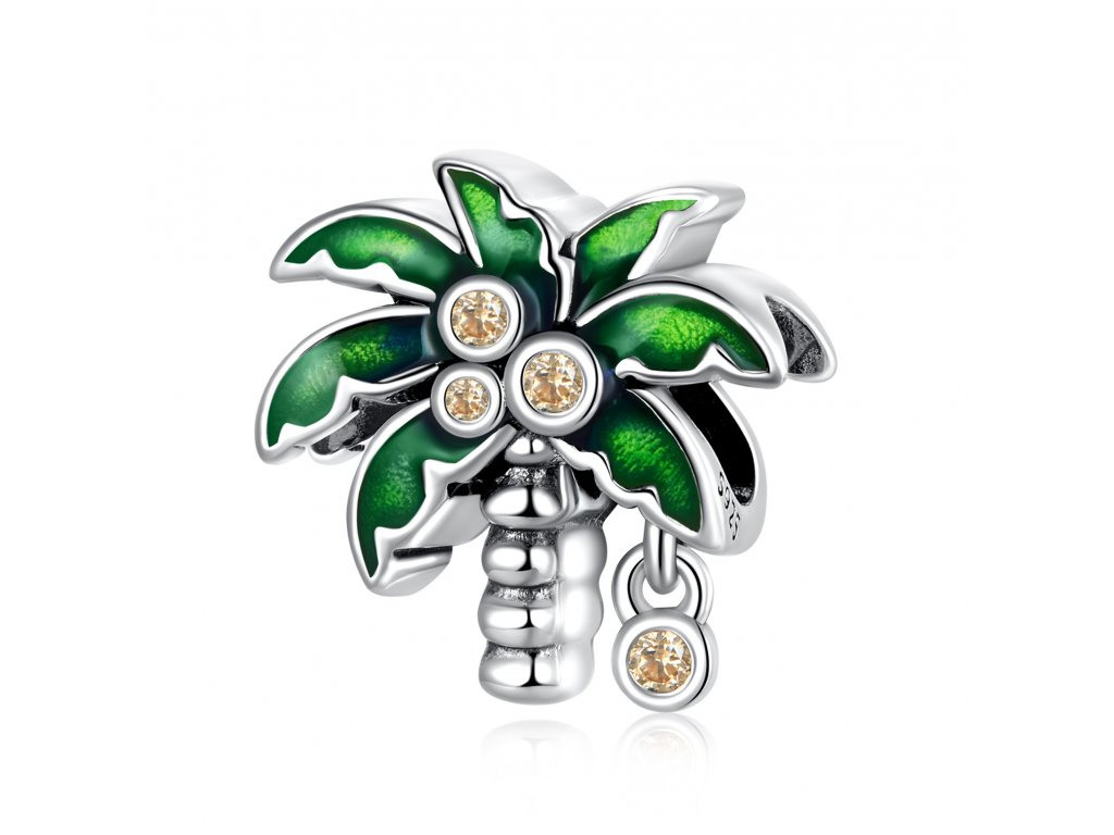- Stříbrný přívěsek v designu exotické kokosové palmy zdobené ručně nanášenou zelenou glazurou a čirými zlatavými zirkony. Originální design přívěsku, kvalitní zpracování a materiál, ručně dohotovené.