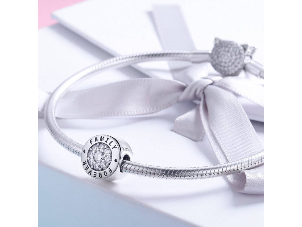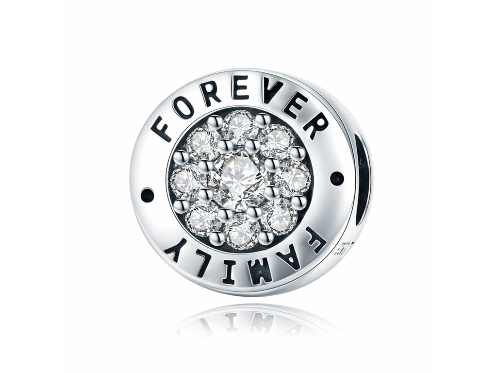 Stříbrný přívěsek s nápisem "Forever family" v překladu "Rodina navždy" zdobený čirými zirkony. Originální design přívěsku, kvalitní zpracování a materiál, ručně dohotovené. Kvalitní ryzí stříbro 925/1000, zirkony. Průměr průvleku 4 mm. DODÁVÁME BALENÉ V DÁRKOVÉM BALENÍ - ZDARMA.