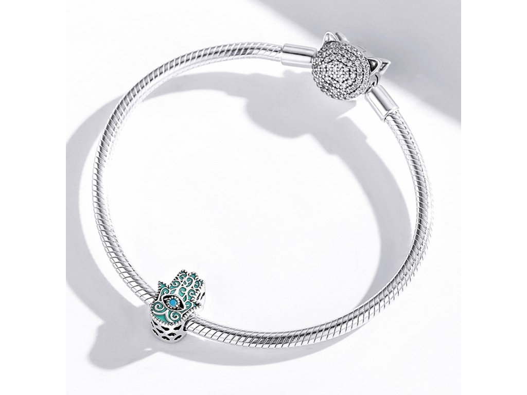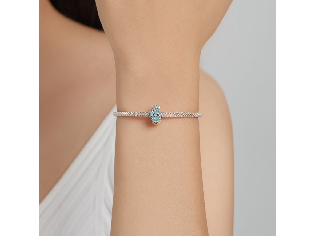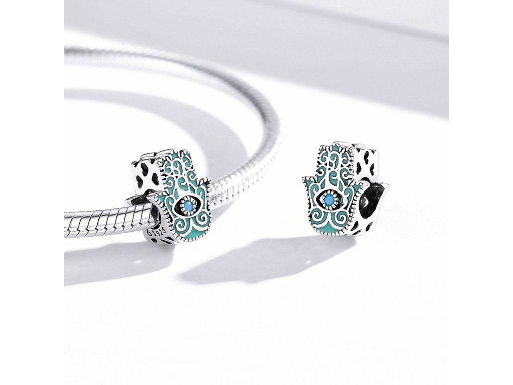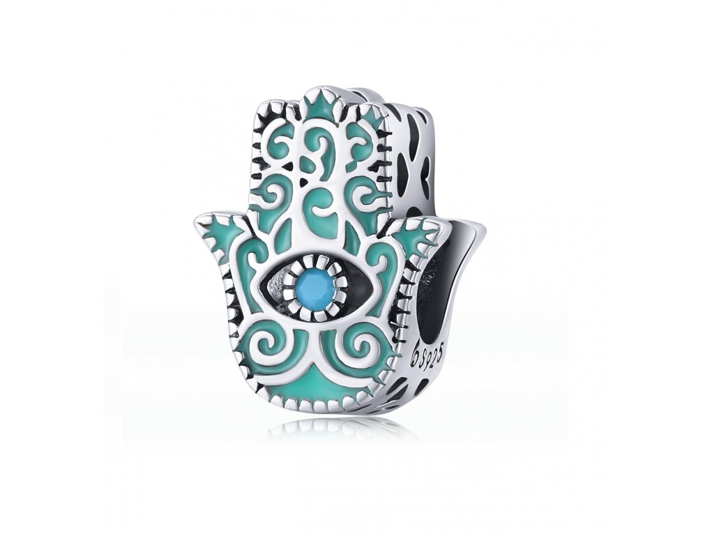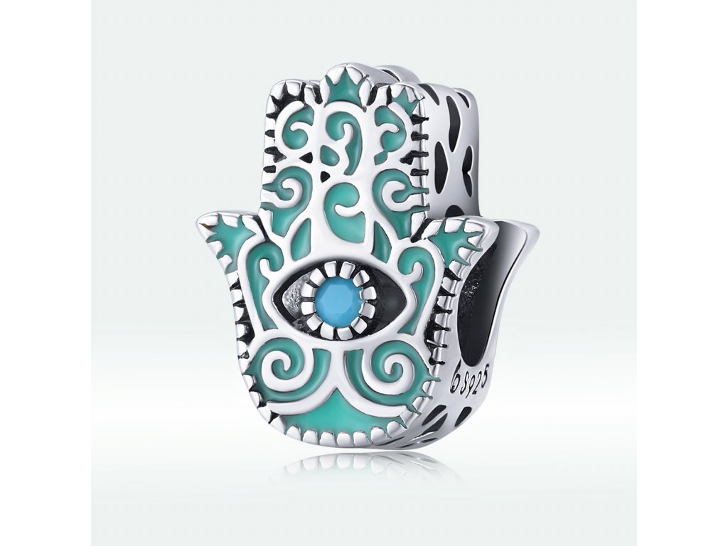 - Stříbrný přívěsek v designu ochranné ruky Fátimy nebo-li Hamsy zdobený tyrkysovými zirkony a ručně nanášenou zeleno-modrou glazurou. Přívěsek je také obohacen ručně vyřezávanými milovanými srdíčky po stranách. Originální design přívěsku, kvalitní zpracování a materiál, ručně dohotovené.