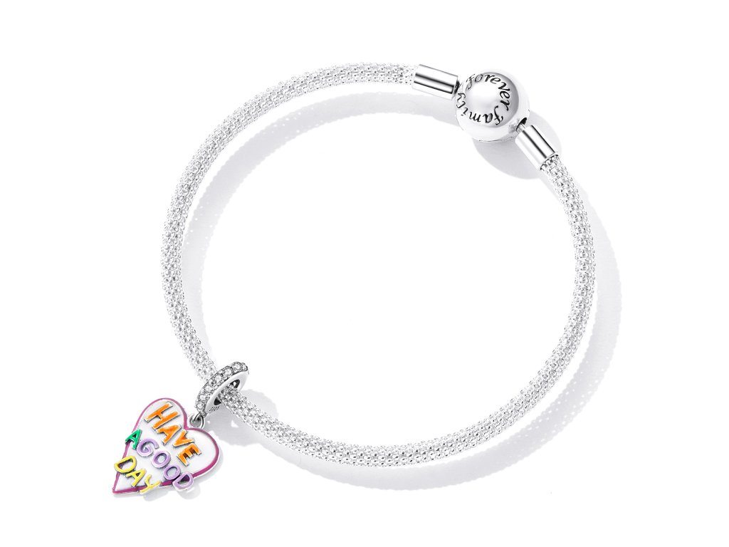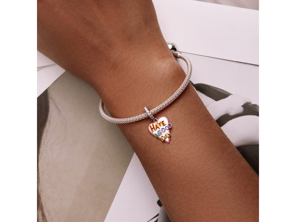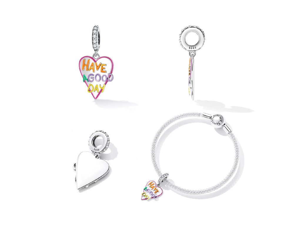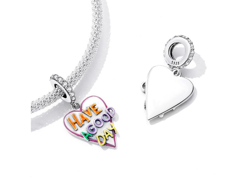 - Stříbrný visací přívěsek ve tvaru srdce zdobený čirými zirkony a ručně nanášenou glazurou s nápisem "Have a good day" v překladu "Měj hezký den". Originální design přívěsku, kvalitní zpracování a materiál, ručně dohotovené.