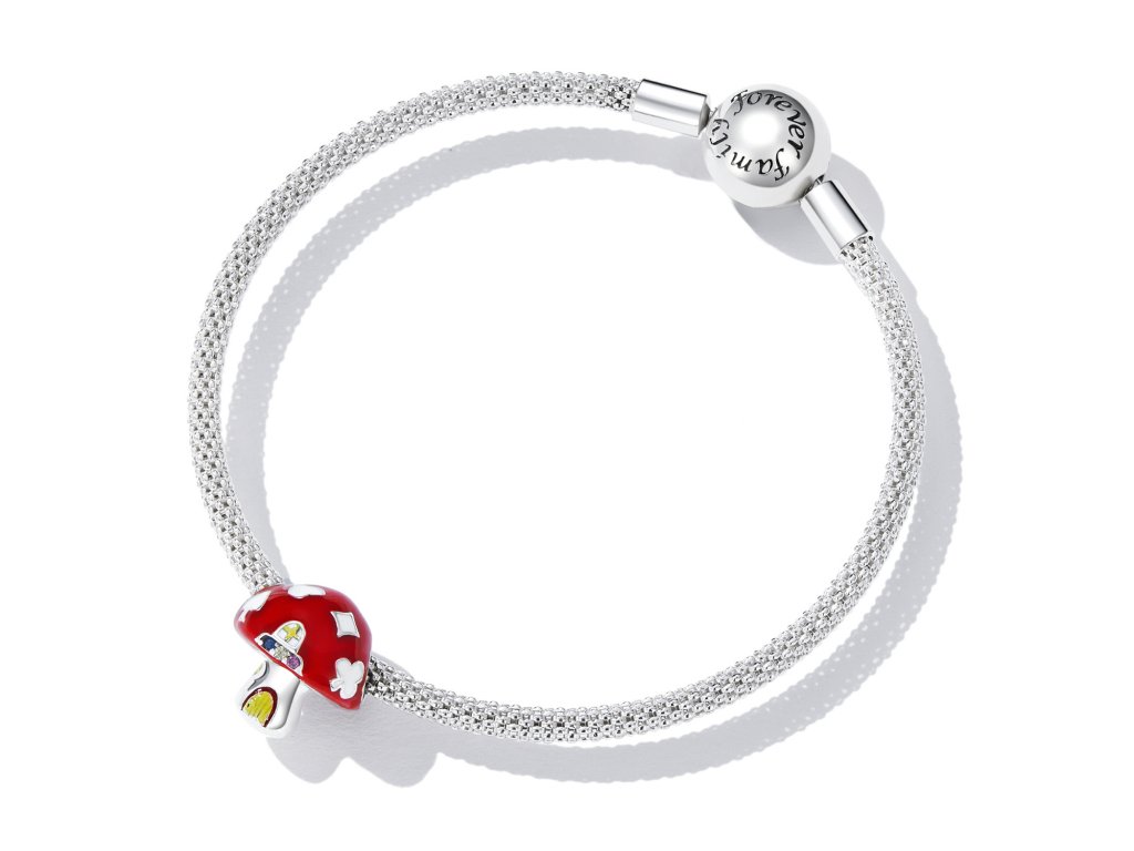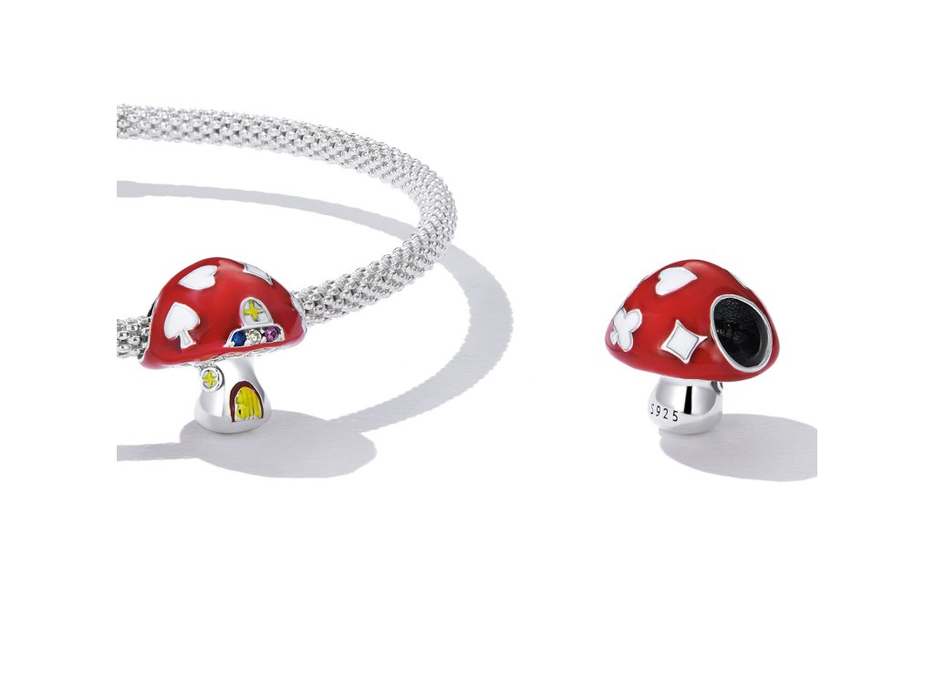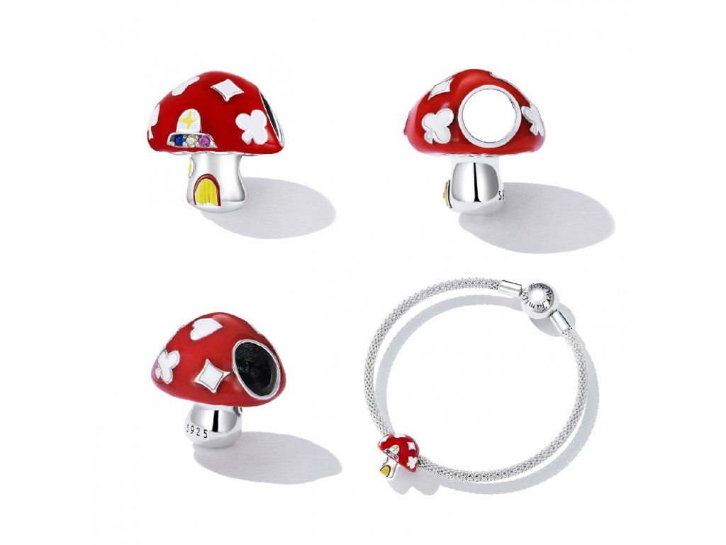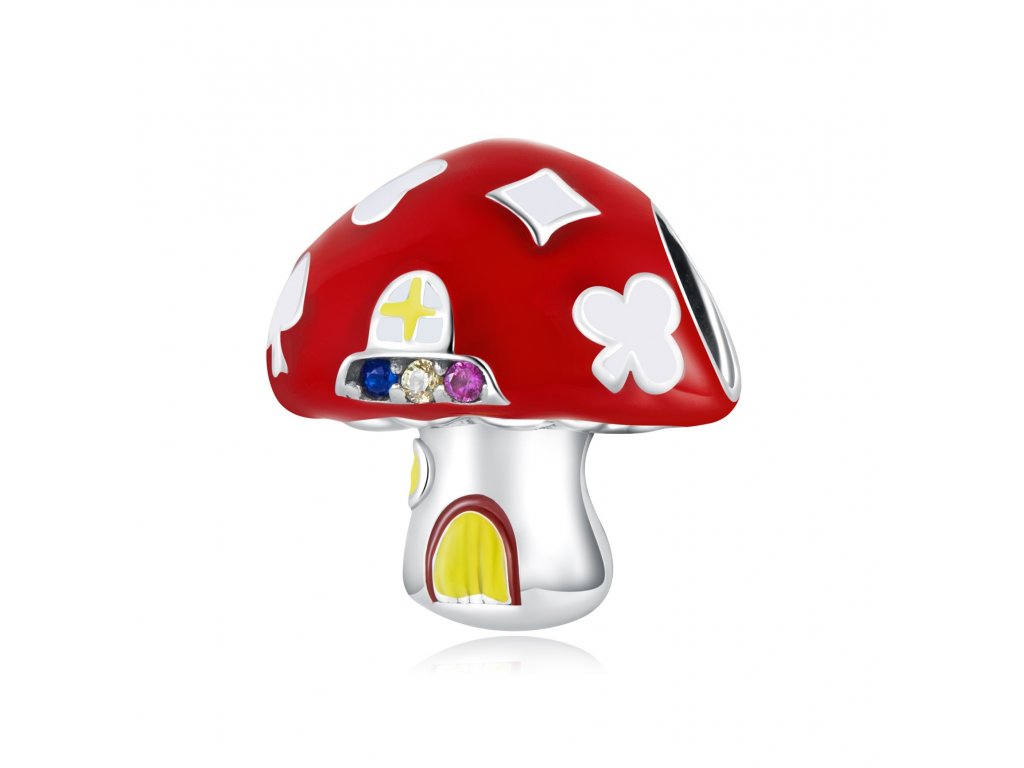 - Stříbrný přívěsek v designu houbové chaloupky zdobené třpytivými zirkony a ručně nanášenou červenou, bílou a žlutou glazurou. Originální design přívěsku, kvalitní zpracování a materiál, ručně dohotovené.