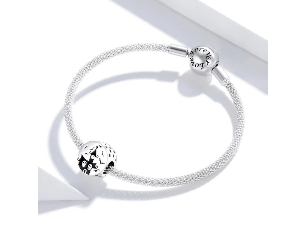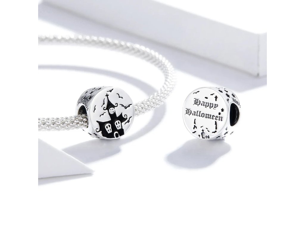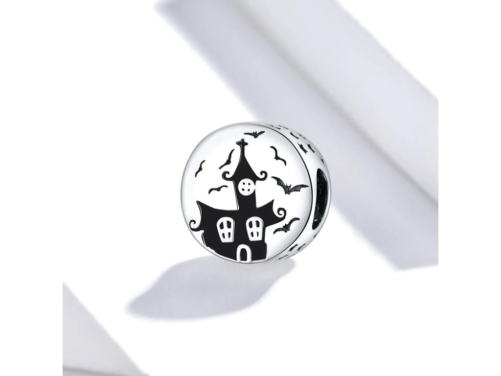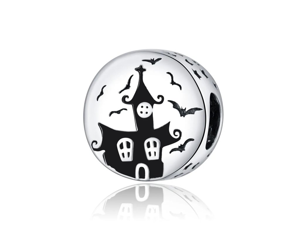 - Stříbrný přívěsek z kolekce Halloween. Přívěsek v designu hradu duchů zdobený ručně nanášenou černou glazurou. Přívěsek je také obohacen vyřezávanými hvězdami po stranách a anglickým nápisem "Happy Halloween".