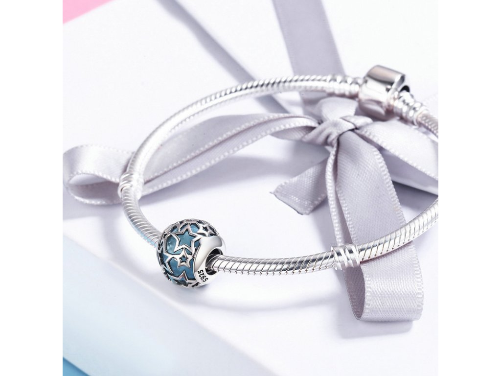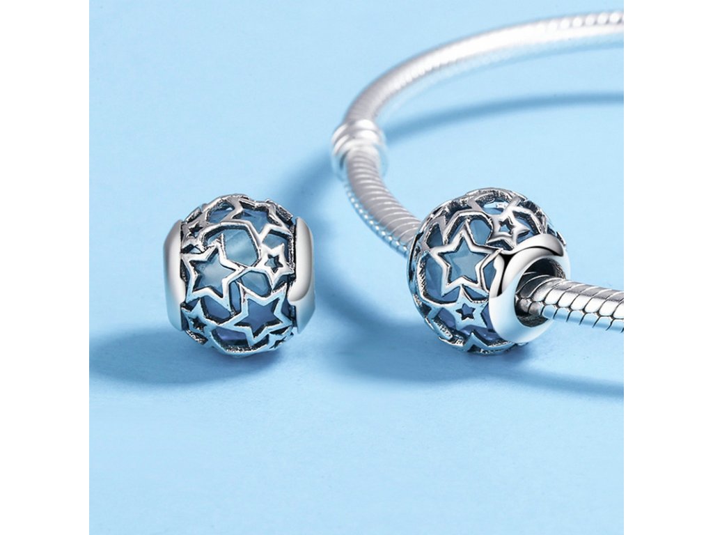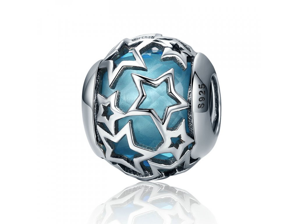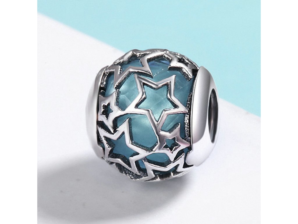 Luxusní a propracovaný korálek v podobě modrého zirkonu zdobeného ručně vyřezanými nebeskými hvězdami.