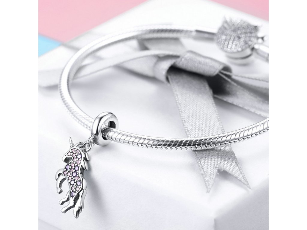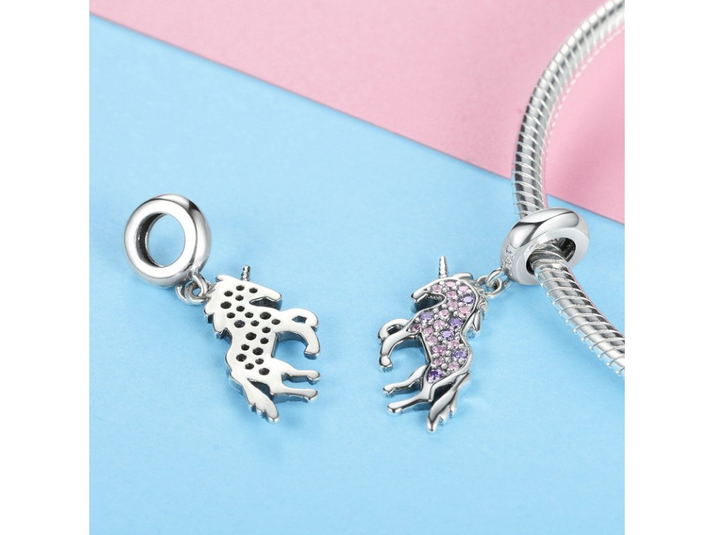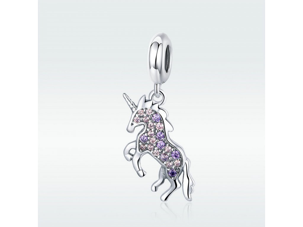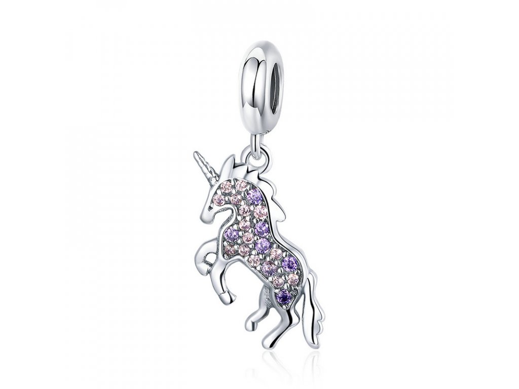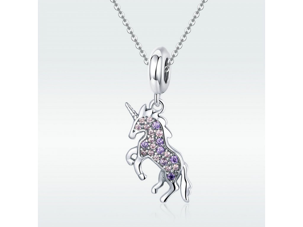 Jednorožec Unicorn je legendární zvíře, které je znamení síly, krásy, inteligence a čistoty. Stříbrný přívěsek je doplněný jemnými fialovými a růžovými zirkony. Originální design přívěsku, kvalitní zpracování a materiál, ručně dohotovené.