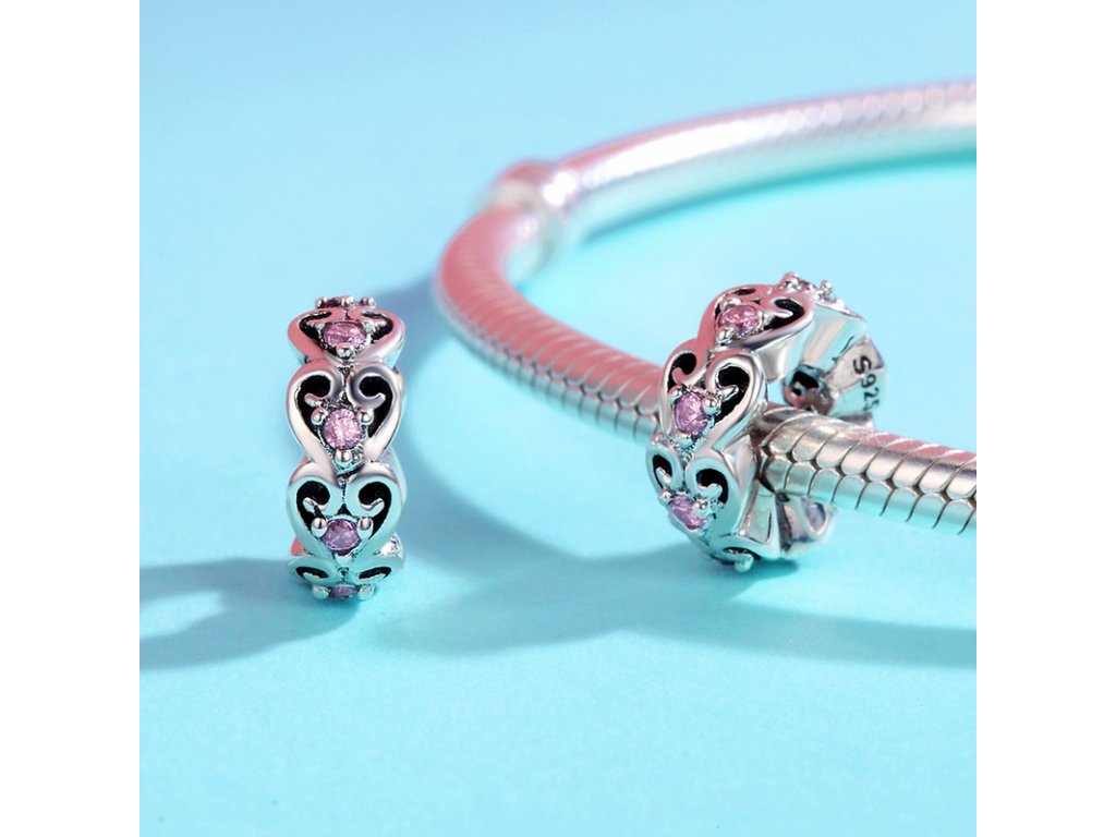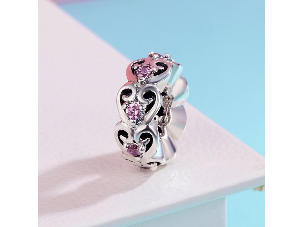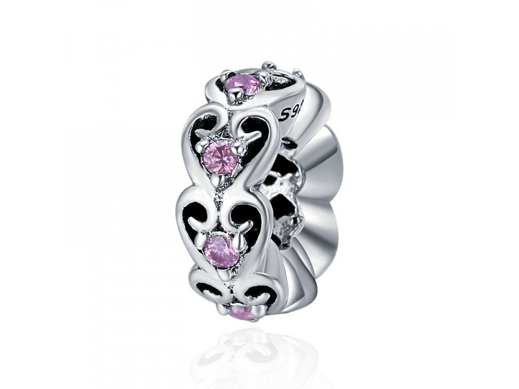Luxusní a propracovaný přívěsek nebo-li spacer / oddělovač obohacený ručně vytvářenými výřezy a třpytivými kameny v podobě růžových zirkonů.