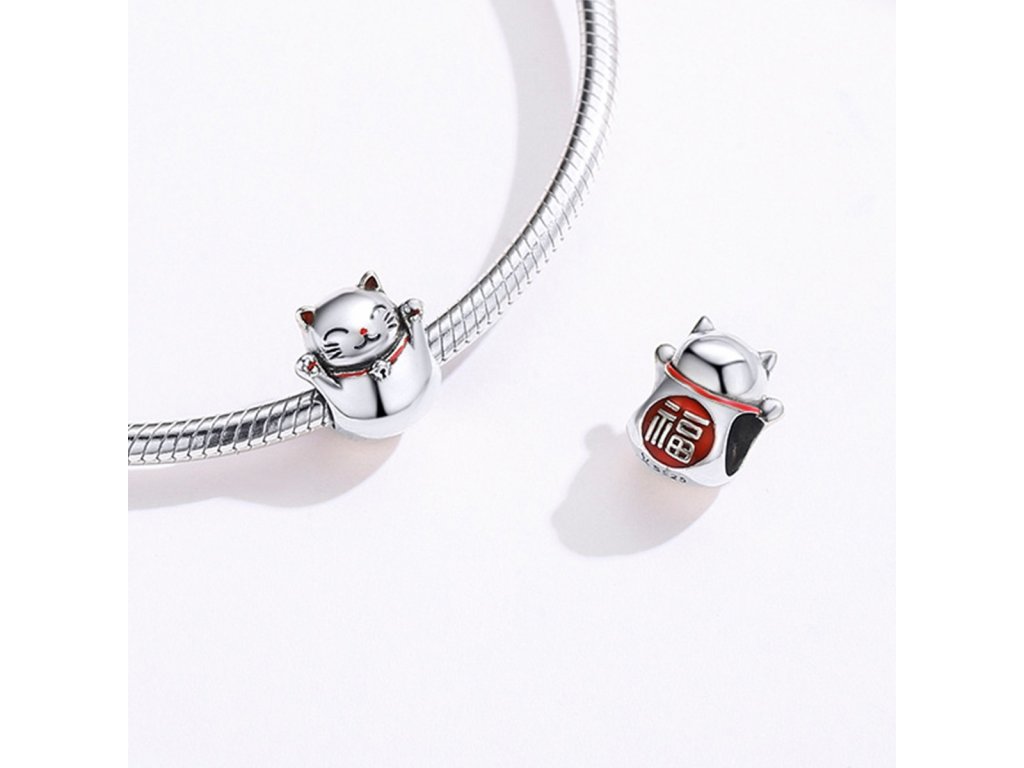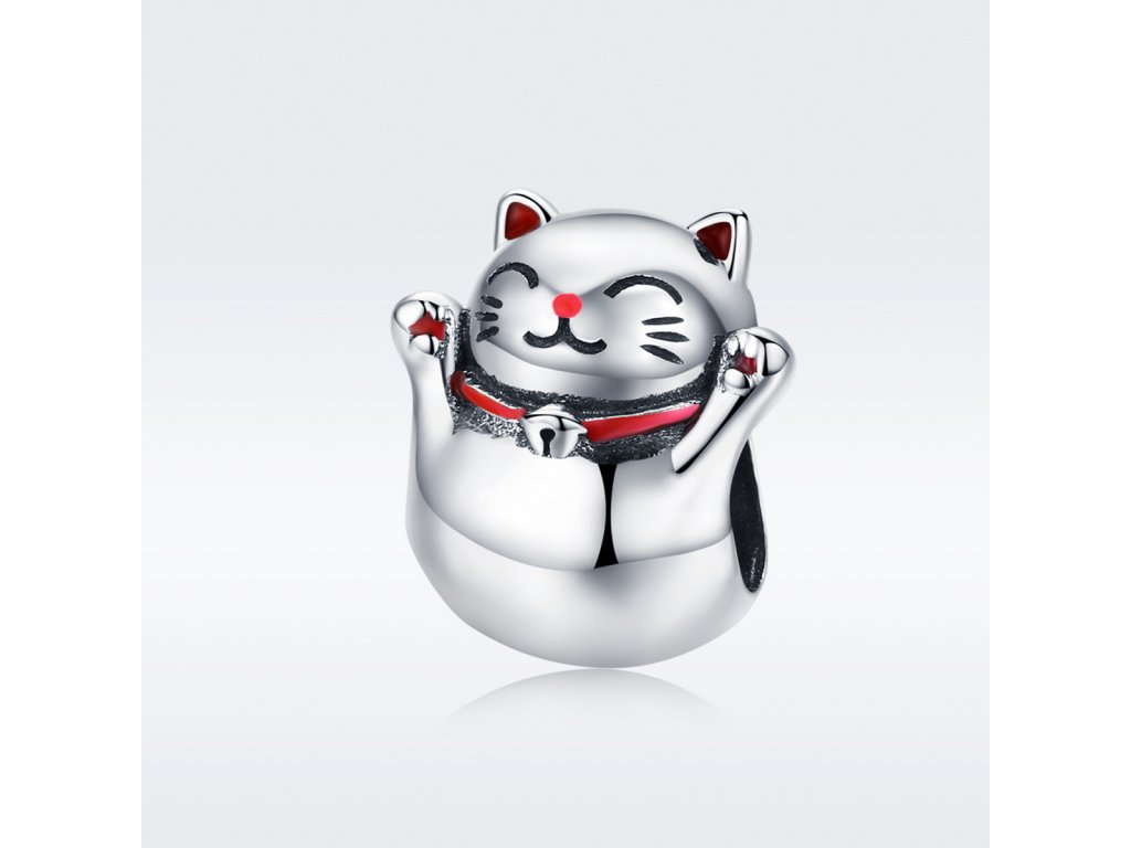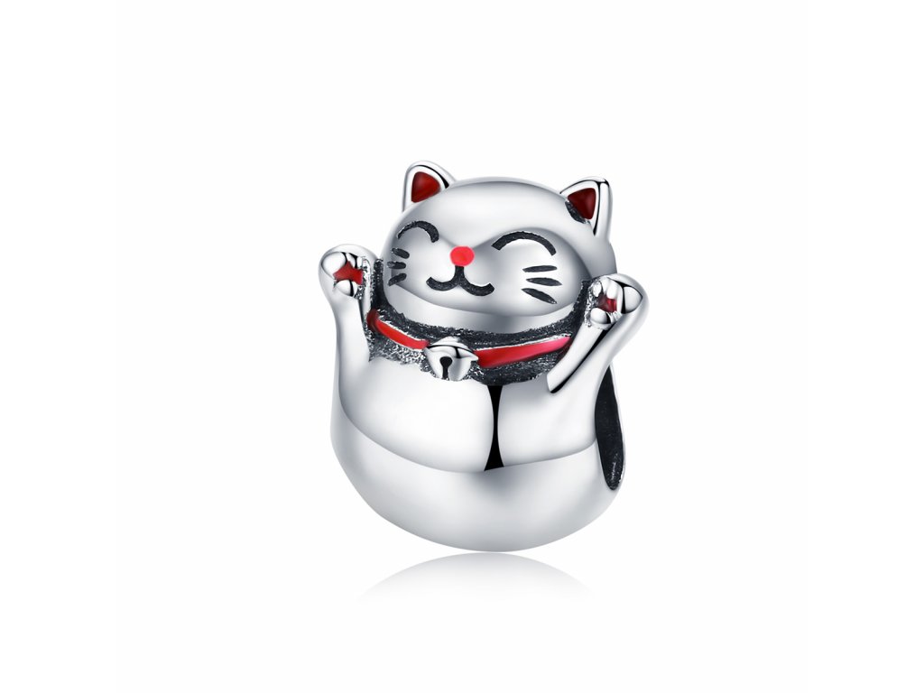 Stříbrný přívěsek v designu Roztomilé japonské kočičky Maneki Neko, která přináší lidem štěstí. Je zdobená smaltem, ručně nanášenou červenou glazurou a mini rolničkou. Originální design přívěsku, kvalitní zpracování a materiál, ručně dohotovené.