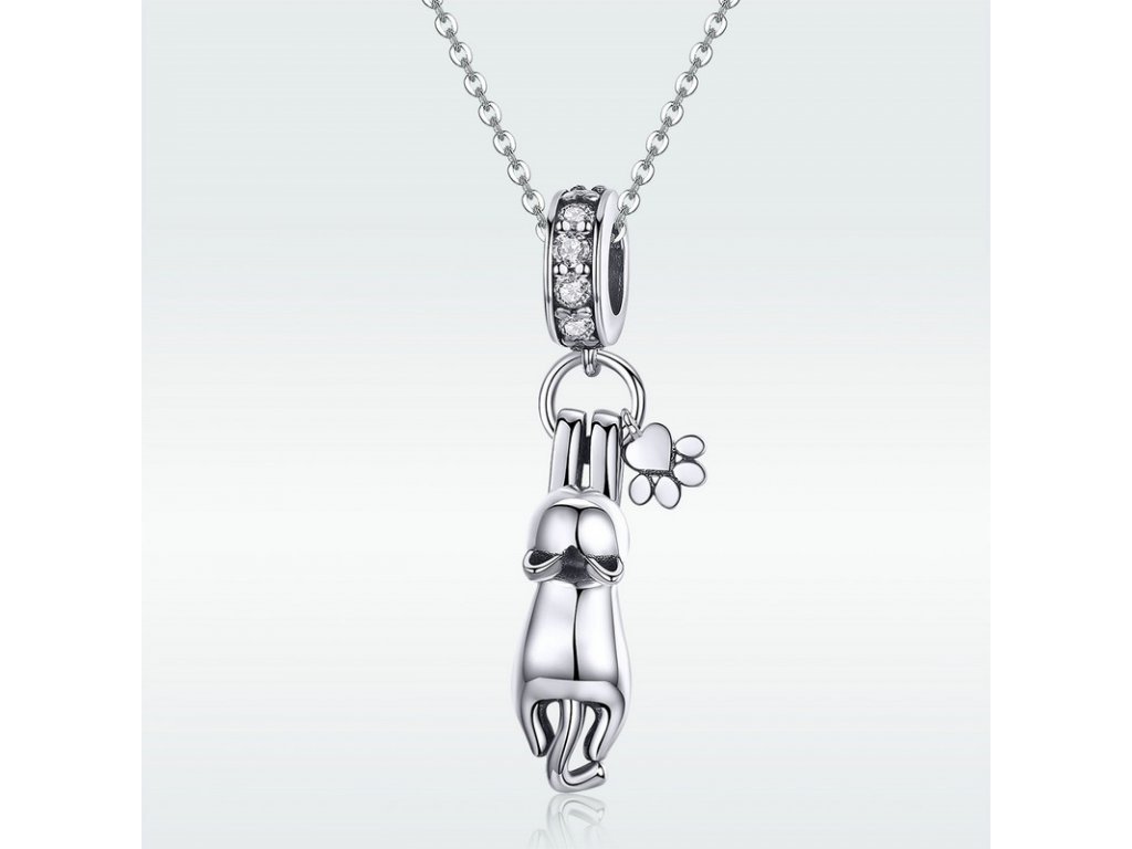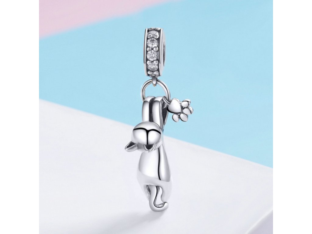 Luxusní a propracovaný stříbrný přívěsek v designu kočka s přívěskem packa tlapka zdobené zirkony.