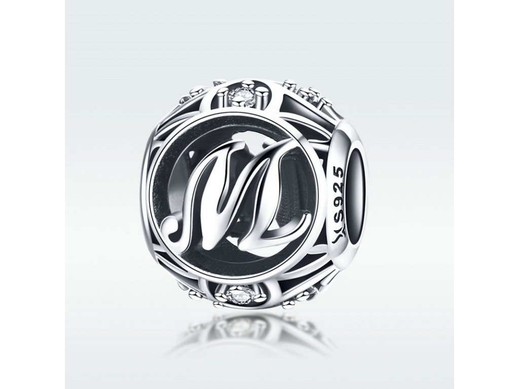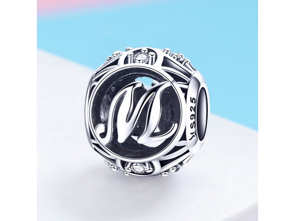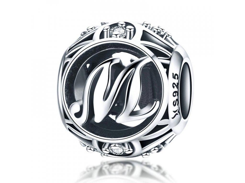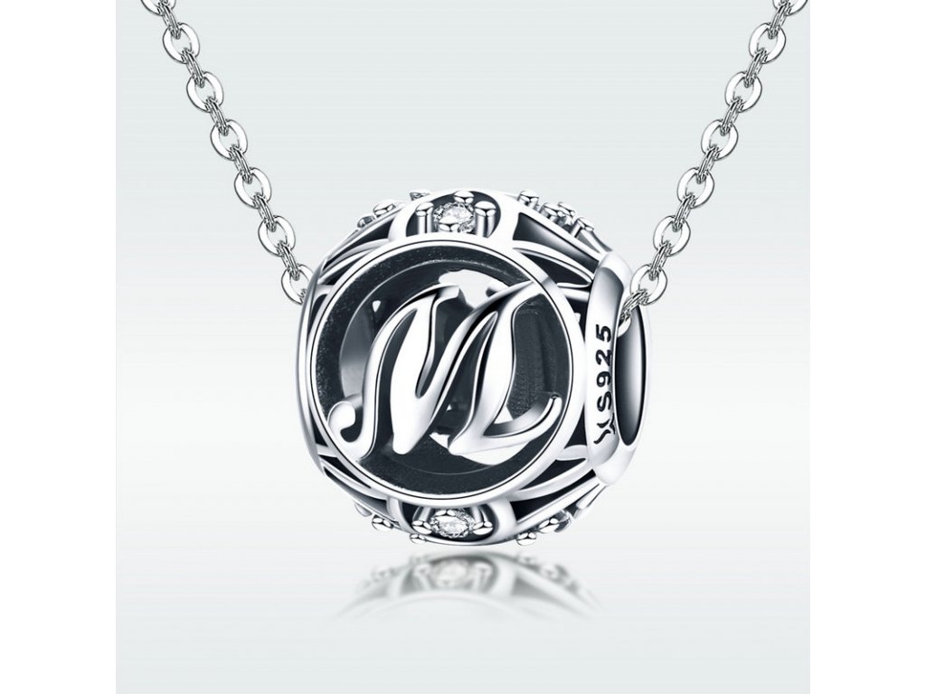 - Propracovaný stříbrný přívěsek v designu písmenka "M" zdobený zirkony.