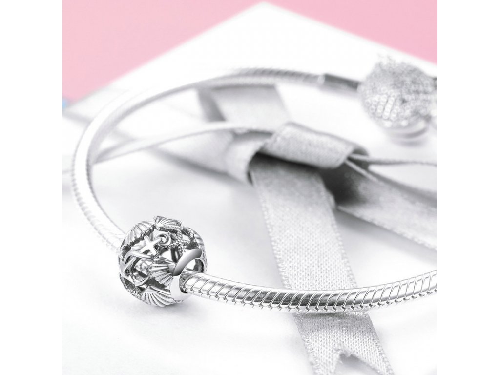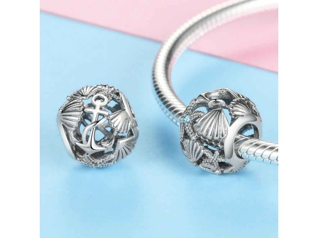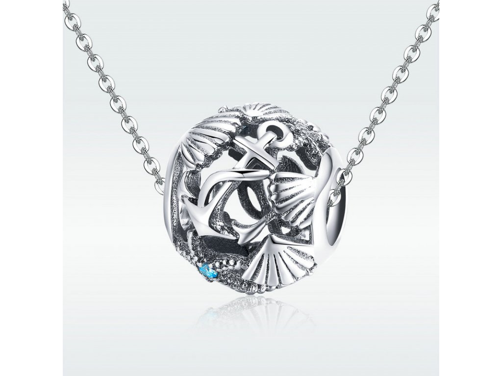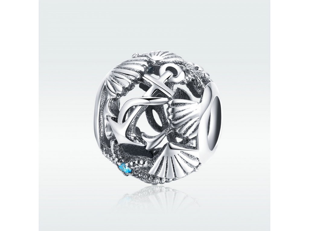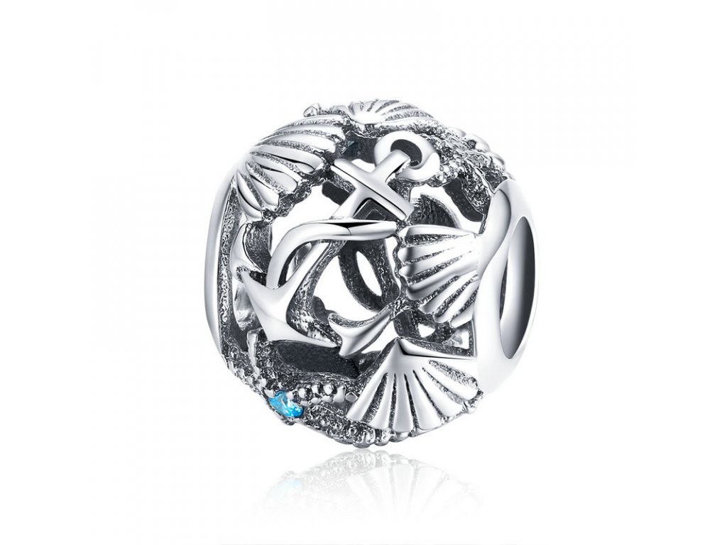 Luxusní a propracovaný stříbrný přívěsek / korálek zobrazující kotvu, mušle a hvězdici zdobenou tyrkysovým zirkonem. Originální design přívěsku, kvalitní zpracování a materiál, ručně dohotovené.