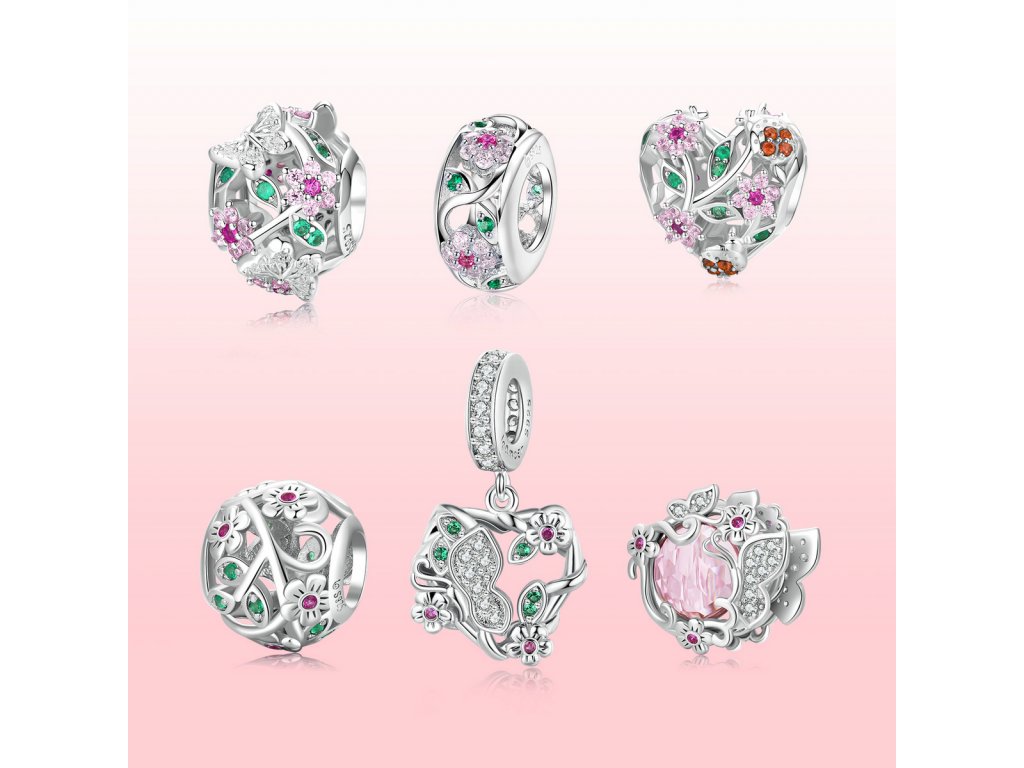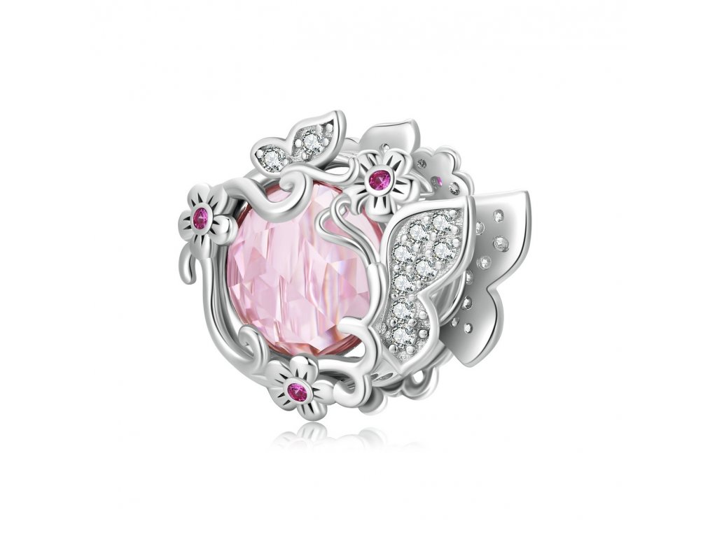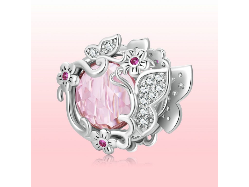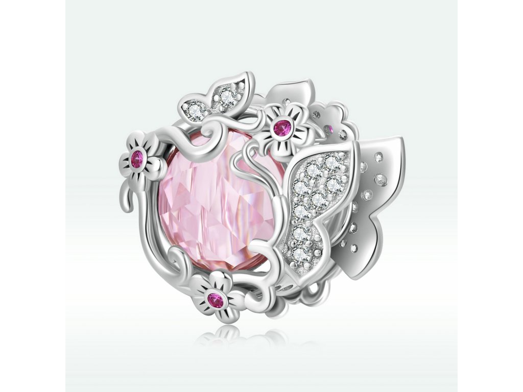 - Stříbrný přívěsek v designu kouzelné přírody zdobený květy s třešňově červenými zirkony a poletujícími motýli zdobenými čirými třpytivými zirkony. Střed přívěsku je tvořen velkým broušeným světle růžovým zirkonem. Originální design přívěsku, kvalitní zpracování a materiál, ručně dohotovené.