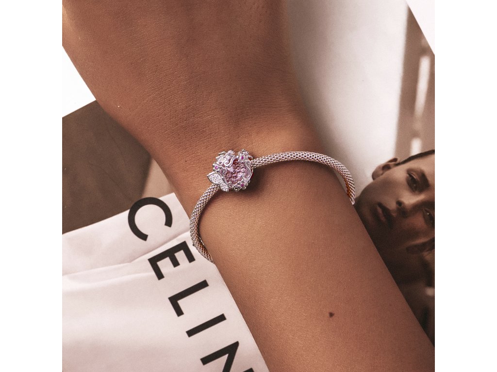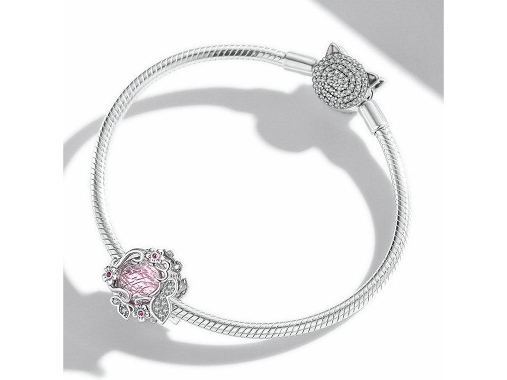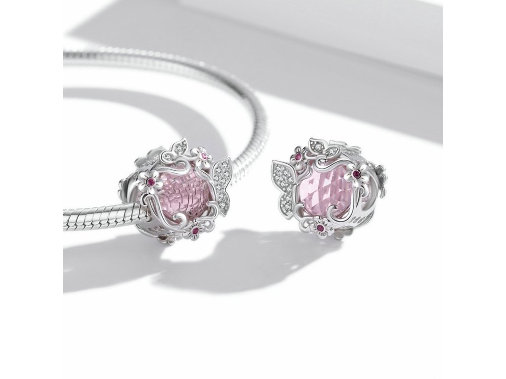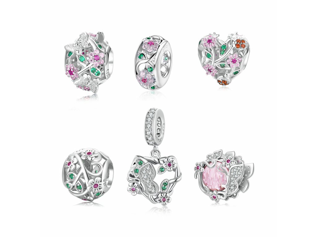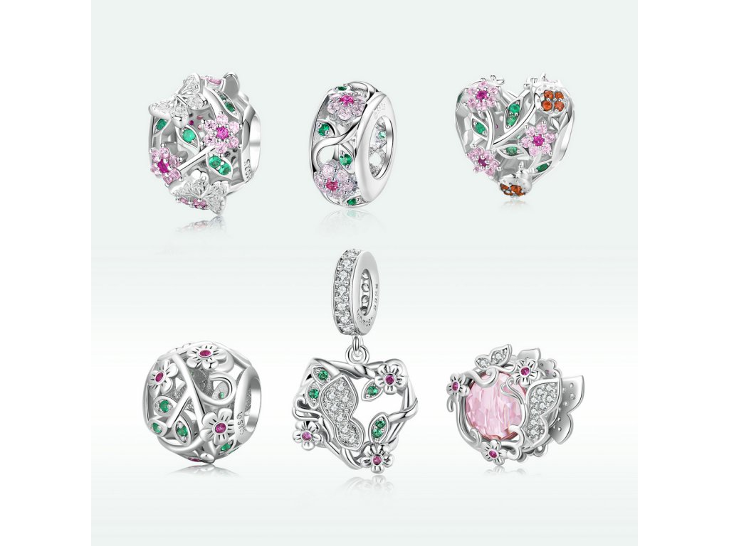 - Stříbrný přívěsek v designu kouzelné přírody zdobený květy s třešňově červenými zirkony a poletujícími motýli zdobenými čirými třpytivými zirkony. Střed přívěsku je tvořen velkým broušeným světle růžovým zirkonem. Originální design přívěsku, kvalitní zpracování a materiál, ručně dohotovené.
